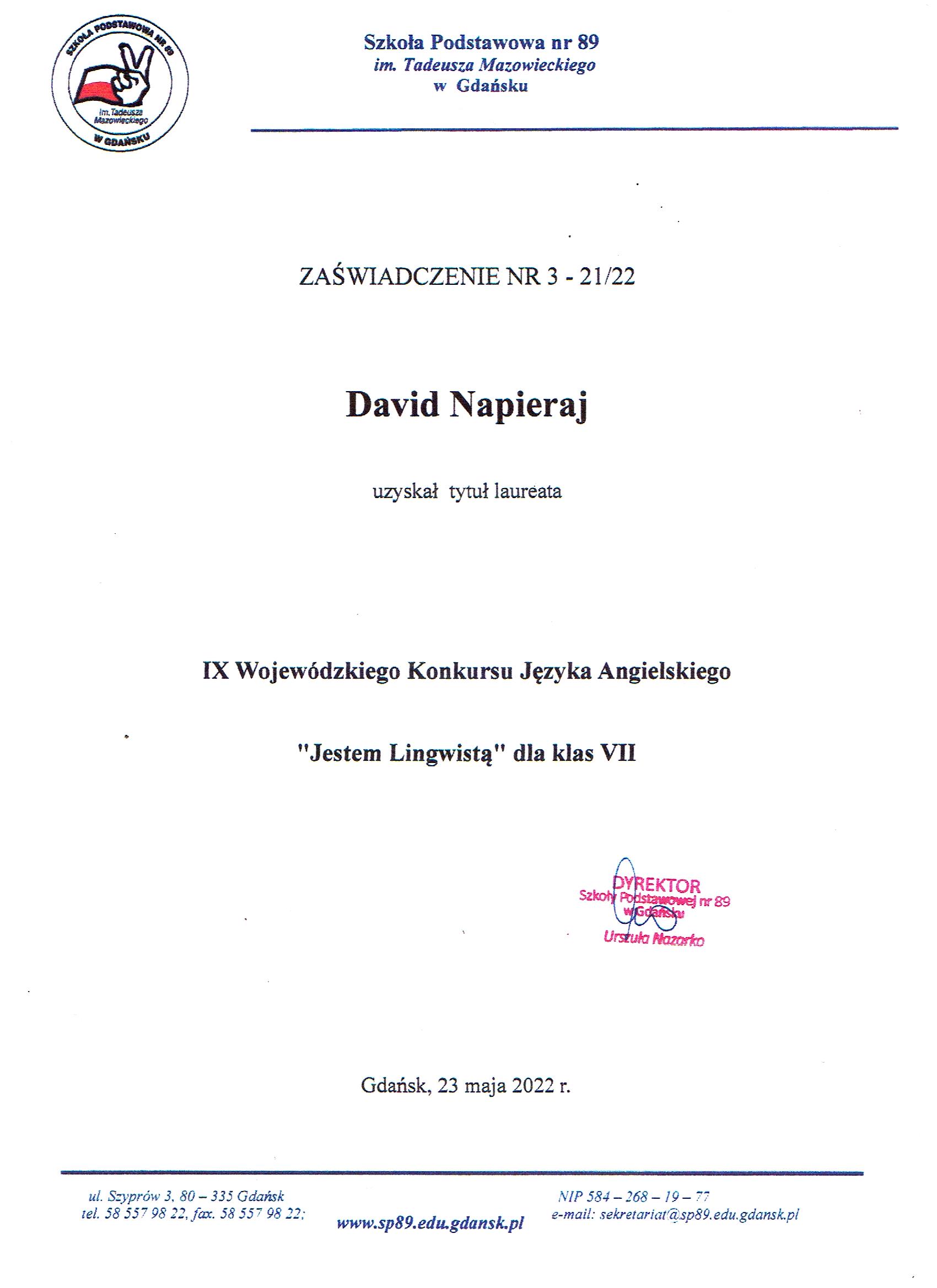 - David Napieraj laureatem IX Wojewódzkiego Konkursu Języka Angielskiego "Jestem Lingwistą"