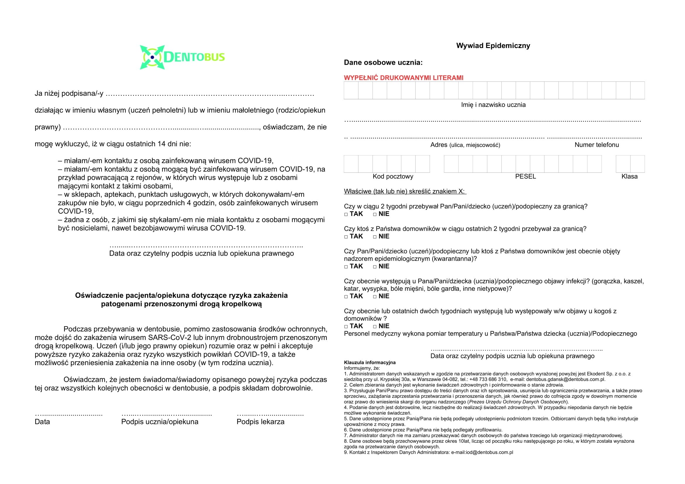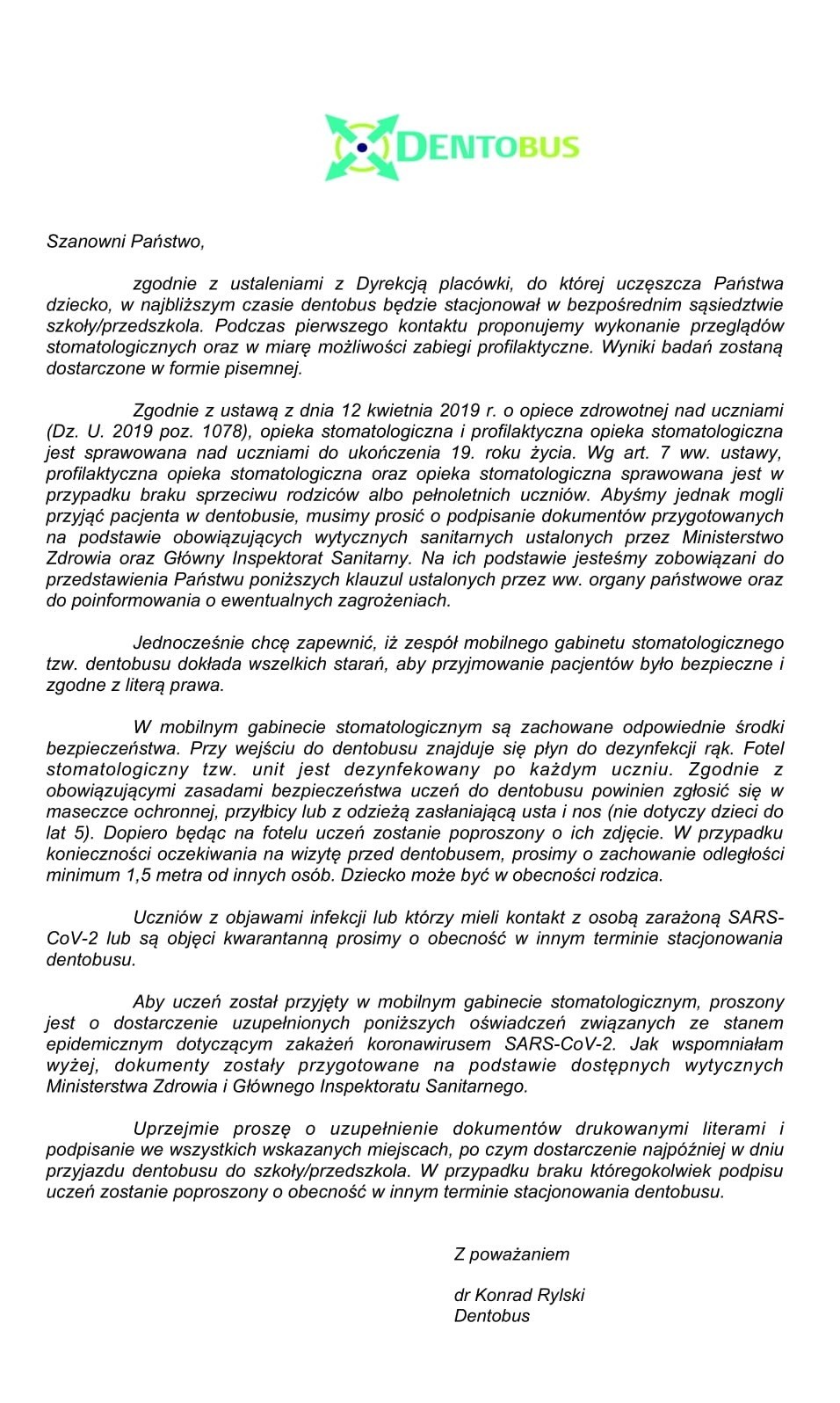 Szanowni Państwo, zgodnie z ustaleniami z Dyrekcją placówki, do której uczęszcza Państwa dziecko, w najbliższym czasie dentobus będzie stacjonował w bezpośrednim sąsiedztwie szkoły/przedszkola. Podczas pierwszego kontaktu proponujemy wykonanie przeglądów stomatologicznych oraz w miarę możliwości zabiegi profilaktyczne. Wyniki badań zostaną dostarczone w formie pisemnej. Zgodnie z ustawą z dnia 12 kwietnia 2019 r. o opiece zdrowotnej nad uczniami (Dz. U. 2019 poz. 1078), opieka stomatologiczna i profilaktyczna opieka stomatologiczna jest sprawowana nad uczniami do ukończenia 19. roku życia. Wg art. 7 ww. ustawy, profilaktyczna opieka stomatologiczna oraz opieka stomatologiczna sprawowana jest w przypadku braku sprzeciwu rodziców albo pełnoletnich uczniów. Abyśmy jednak mogli przyjąć pacjenta w dentobusie, musimy prosić o podpisanie dokumentów przygotowanych na podstawie obowiązujących wytycznych sanitarnych ustalonych przez Ministerstwo Zdrowia oraz Główny Inspektorat Sanitarny. Na ich podstawie jesteśmy zobowiązani do przedstawienia Państwu poniższych klauzul ustalonych przez ww. organy państwowe oraz do poinformowania o ewentualnych zagrożeniach. Jednocześnie chcę zapewnić, iż zespół mobilnego gabinetu stomatologicznego tzw. dentobusu dokłada wszelkich starań, aby przyjmowanie pacjentów było bezpieczne i zgodne z literą prawa. W mobilnym gabinecie stomatologicznym są zachowane odpowiednie środki bezpieczeństwa. Przy wejściu do dentobusu znajduje się płyn do dezynfekcji rąk. Fotel stomatologiczny tzw. unit jest dezynfekowany po każdym uczniu. Zgodnie z obowiązującymi zasadami bezpieczeństwa uczeń do dentobusu powinien zgłosić się w maseczce ochronnej, przyłbicy lub z odzieżą zasłaniającą usta i nos (nie dotyczy dzieci do lat 5). Dopiero będąc na fotelu uczeń zostanie poproszony o ich zdjęcie. W przypadku konieczności oczekiwania na wizytę przed dentobusem, prosimy o zachowanie odległości minimum 1,5 metra od innych osób. Dziecko może być w obecności rodzica. Uczniów z objawami infekcji lub którzy mieli kontakt z osobą zarażoną SARSCoV-2 lub są objęci kwarantanną prosimy o obecność w innym terminie stacjonowania dentobusu. Aby uczeń został przyjęty w mobilnym gabinecie stomatologicznym, proszony jest o dostarczenie uzupełnionych poniższych oświadczeń związanych ze stanem epidemicznym dotyczącym zakażeń koronawirusem SARS-CoV-2. Jak wspomniałam wyżej, dokumenty zostały przygotowane na podstawie dostępnych wytycznych Ministerstwa Zdrowia i Głównego Inspektoratu Sanitarnego. Uprzejmie proszę o uzupełnienie dokumentów drukowanymi literami i podpisanie we wszystkich wskazanych miejscach, po czym dostarczenie najpóźniej w dniu przyjazdu dentobusu do szkoły/przedszkola. W przypadku braku któregokolwiek podpisu uczeń zostanie poproszony o obecność w innym terminie stacjonowania dentobusu. Z poważaniem dr Konrad Rylski Dentobus