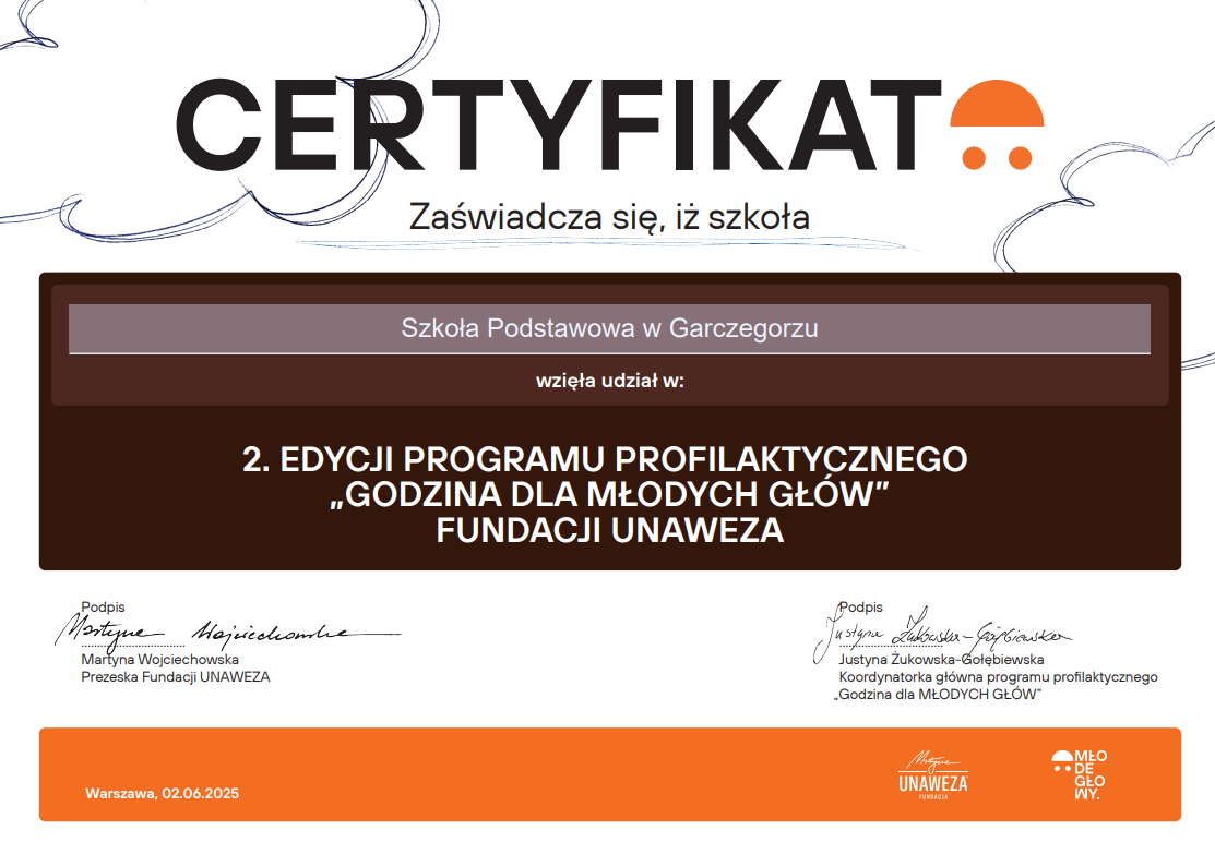 W ramach podsumowania programu, szkoła otrzymała certyfikat udziału w programie „Godzina dla Młodych Głów”, co stanowi potwierdzenie zaangażowania placówki w działania na rzecz zdrowia psychicznego dzieci i młodzieży.