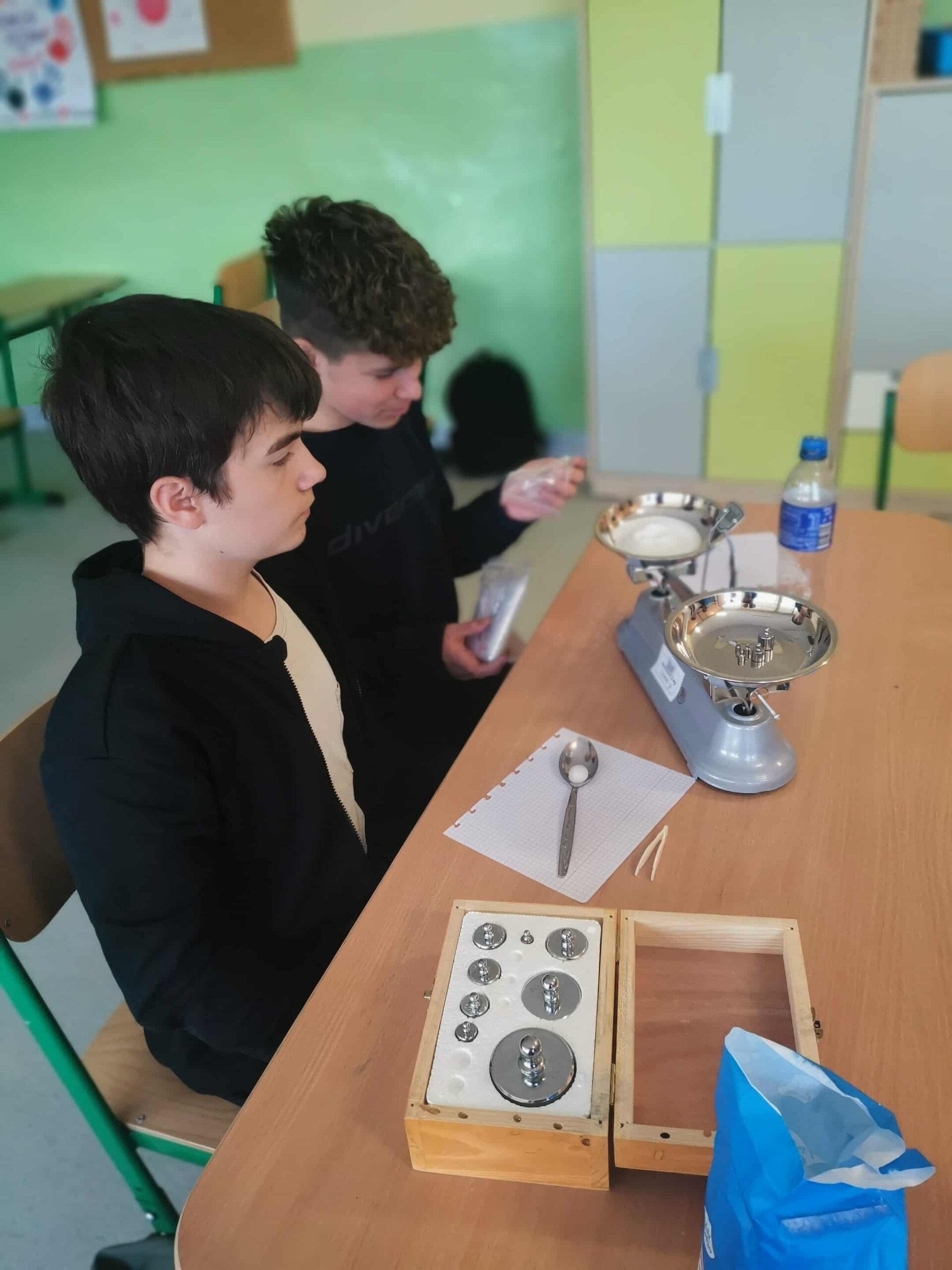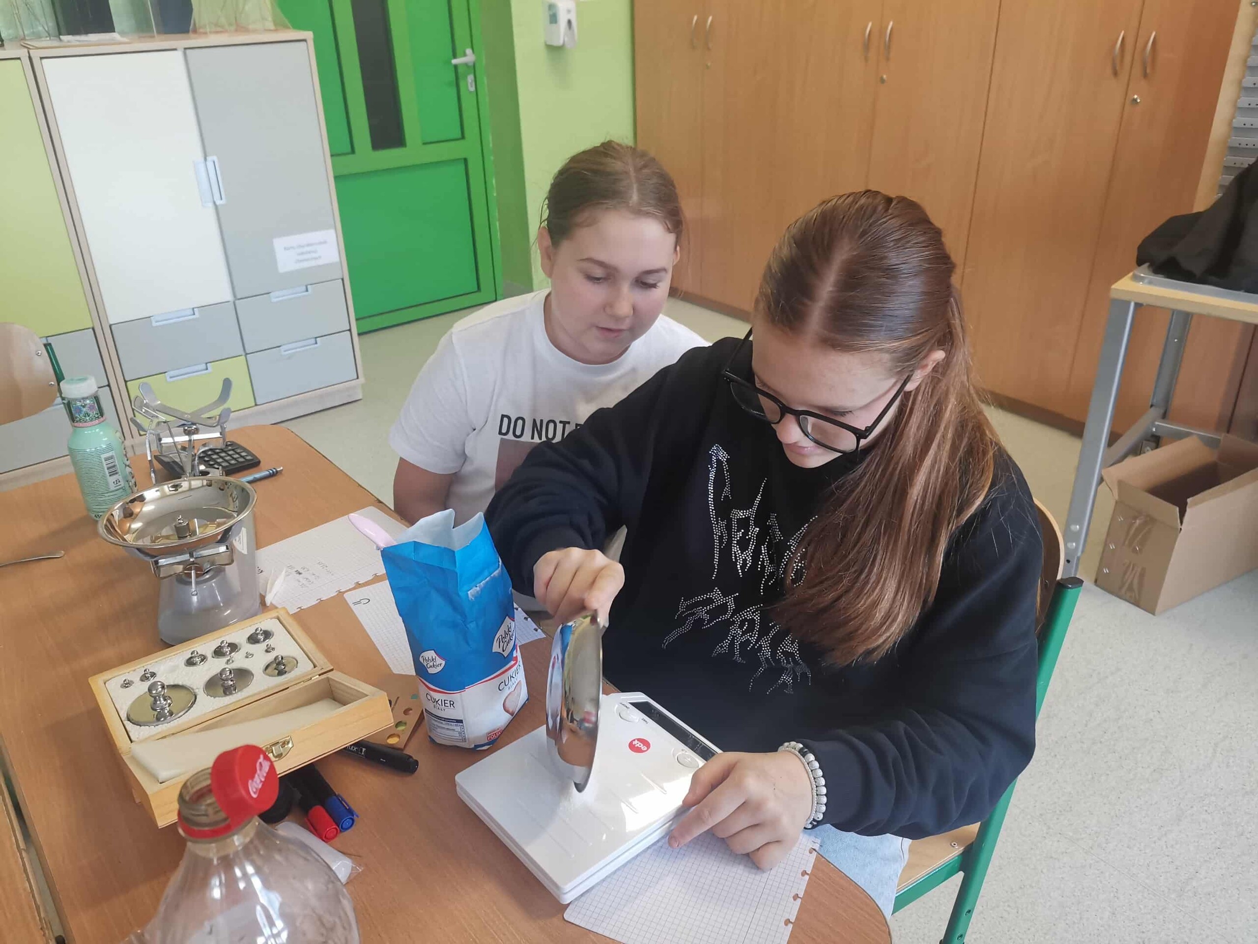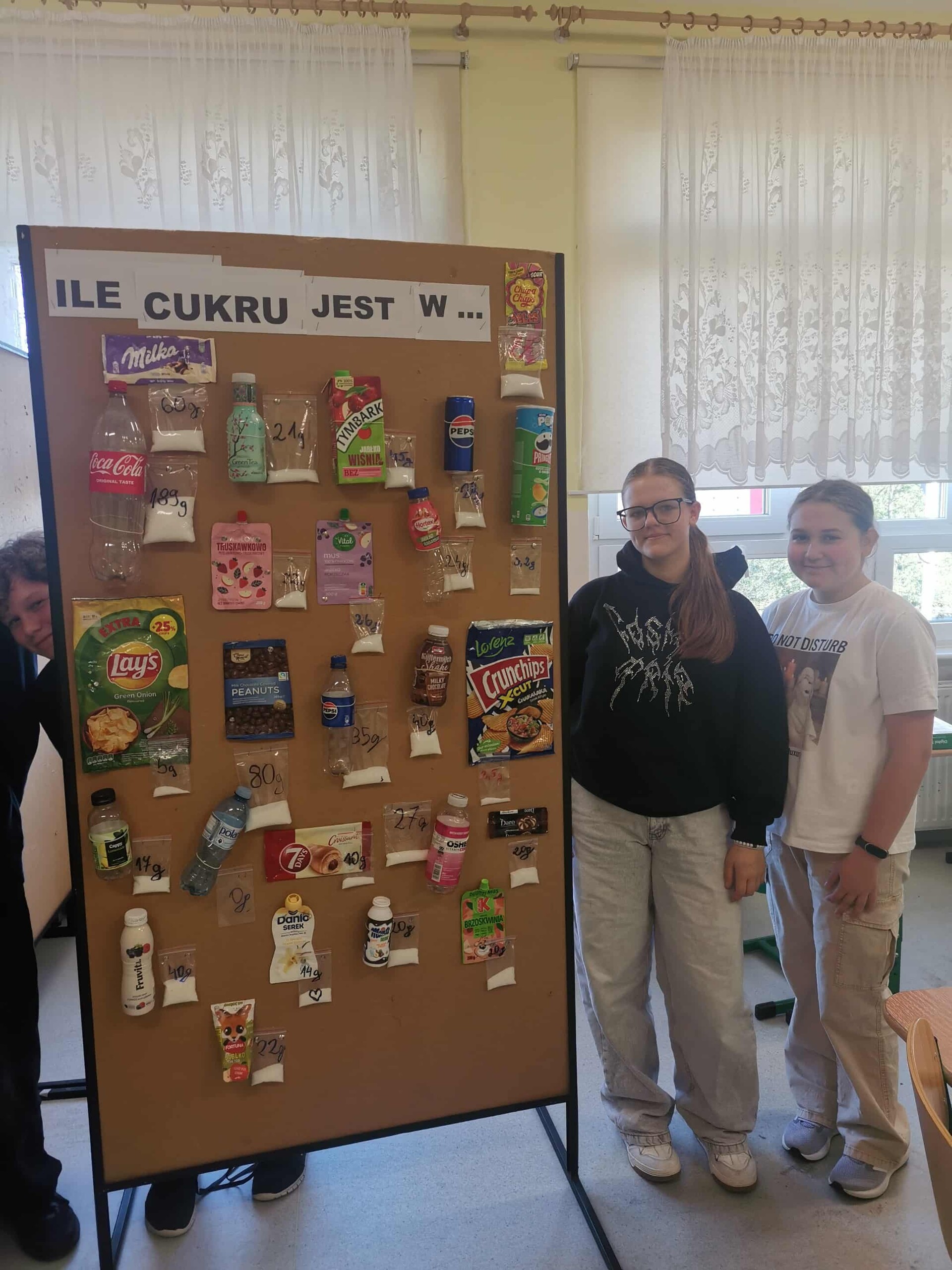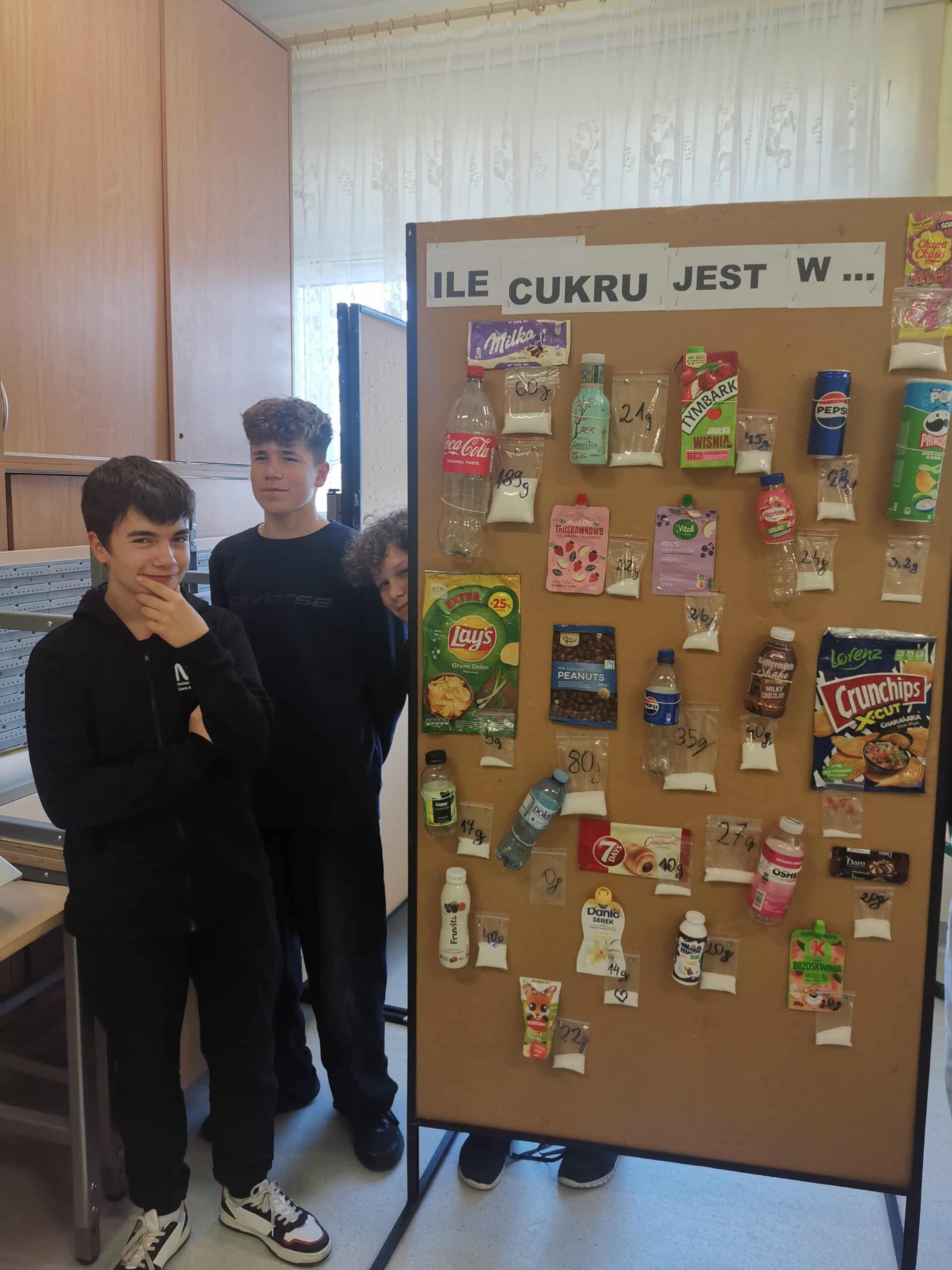 Na dzisiejszych zajęciach z projektu uczniowie klasy VIII wykonali gazetkę, która przedstawia zawartość cukru w produktach spożywanych przez dzieci. Zanim jednak przystąpili do odmierzenia odpowiedniej ilości cukru musieli wykonać stosowne obliczenia (proporcje). Tutaj przydała się umiejętność odczytywania etykiet umieszczonych na opakowaniach. Do wykonania zadania wykorzystali dwie wagi szalkowe i precyzyjną wagę elektroniczną. Lekcja miała charakter integracyjny, jak również typowo praktyczny. Podczas wykonywania zadania sami uczniowie byli zaskoczeni, że tak dużo cukru zawierają niektóre napoje i różne przekąski. Efekt pracy uczniów, pod kierownictwem p. Beaty Granzin jest interesujący i warty podjęcia dyskusji.