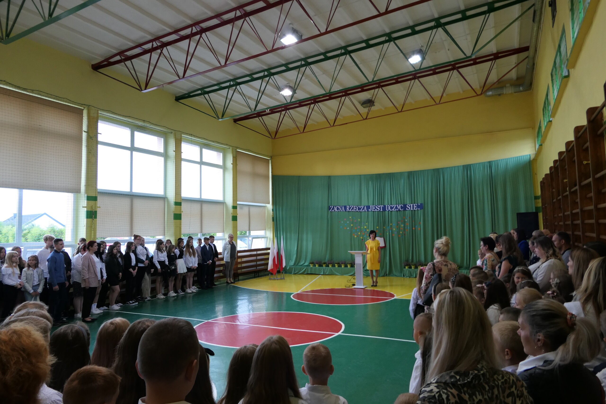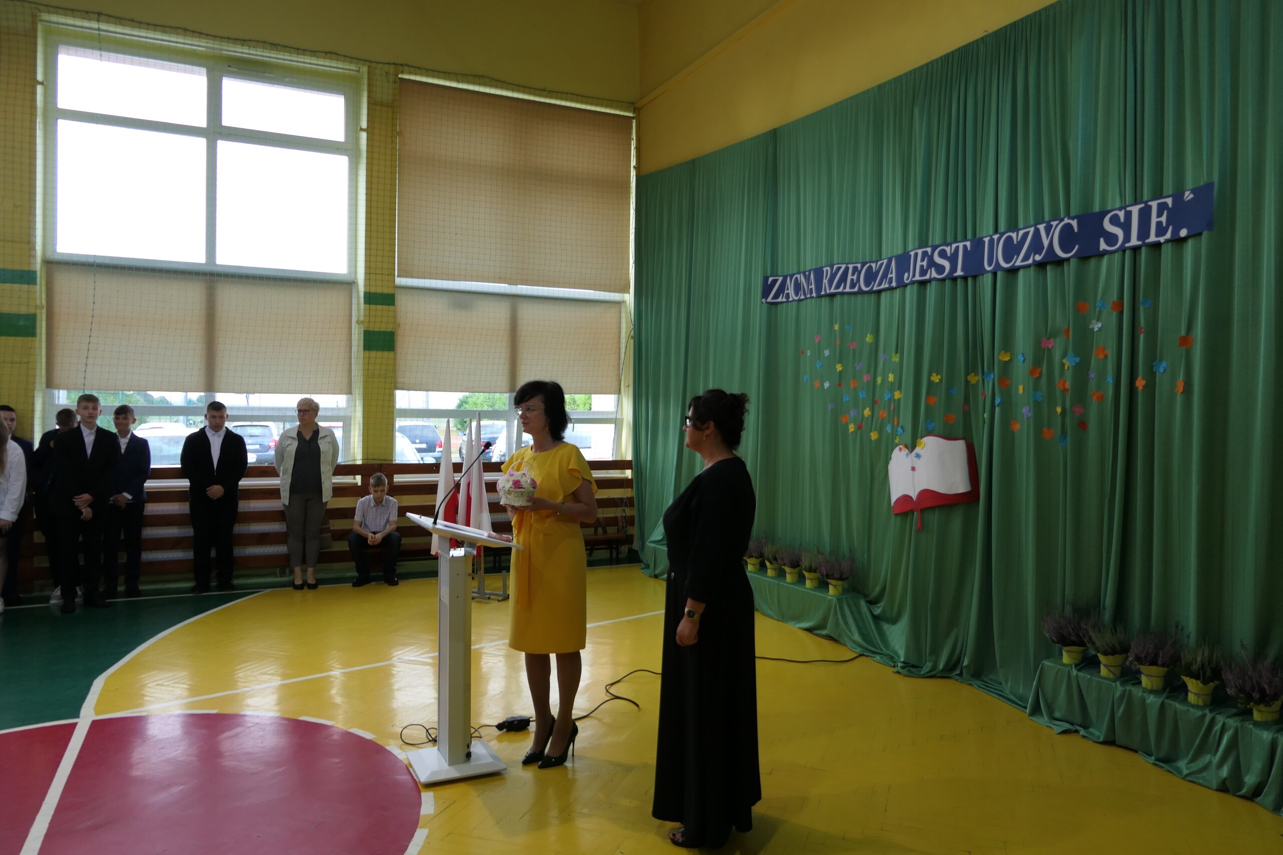 Dziś, na uroczystym rozpoczęciu roku szkolnego, Pani Dyrektor z radością i optymizmem, przywitała zebranych uczniów i ich wychowawców, nauczycieli oraz rodziców.