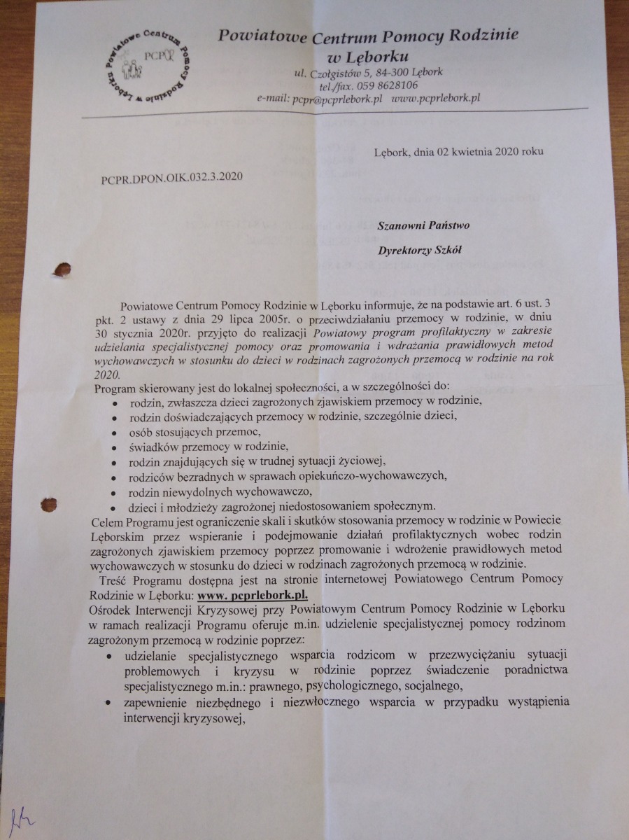 Powiatowe Centrum Pomocy Rodzinie w Lęborku informuje, że na podstawie art. 6 ust. 3 pkt. 2 ustawy z dnia 29 lipca 2005r. o przeciwdziałaniu przemocy w rodzinie, w dniu 30 stycznia 2020r. przyjęto do realizacji Powiatowy program profilaktyczny w zakresie udzielania specjalistycznej pomocy oraz promowania i wdrażania prawidłowych metod wychowawczych w stosunku do dzieci w rodzinach zagrożonych przemocą w rodznie na rok 2020.