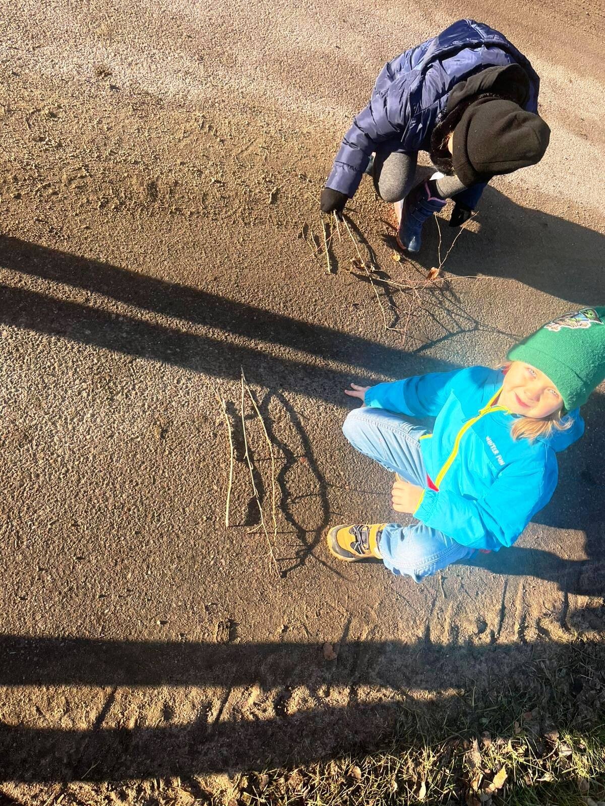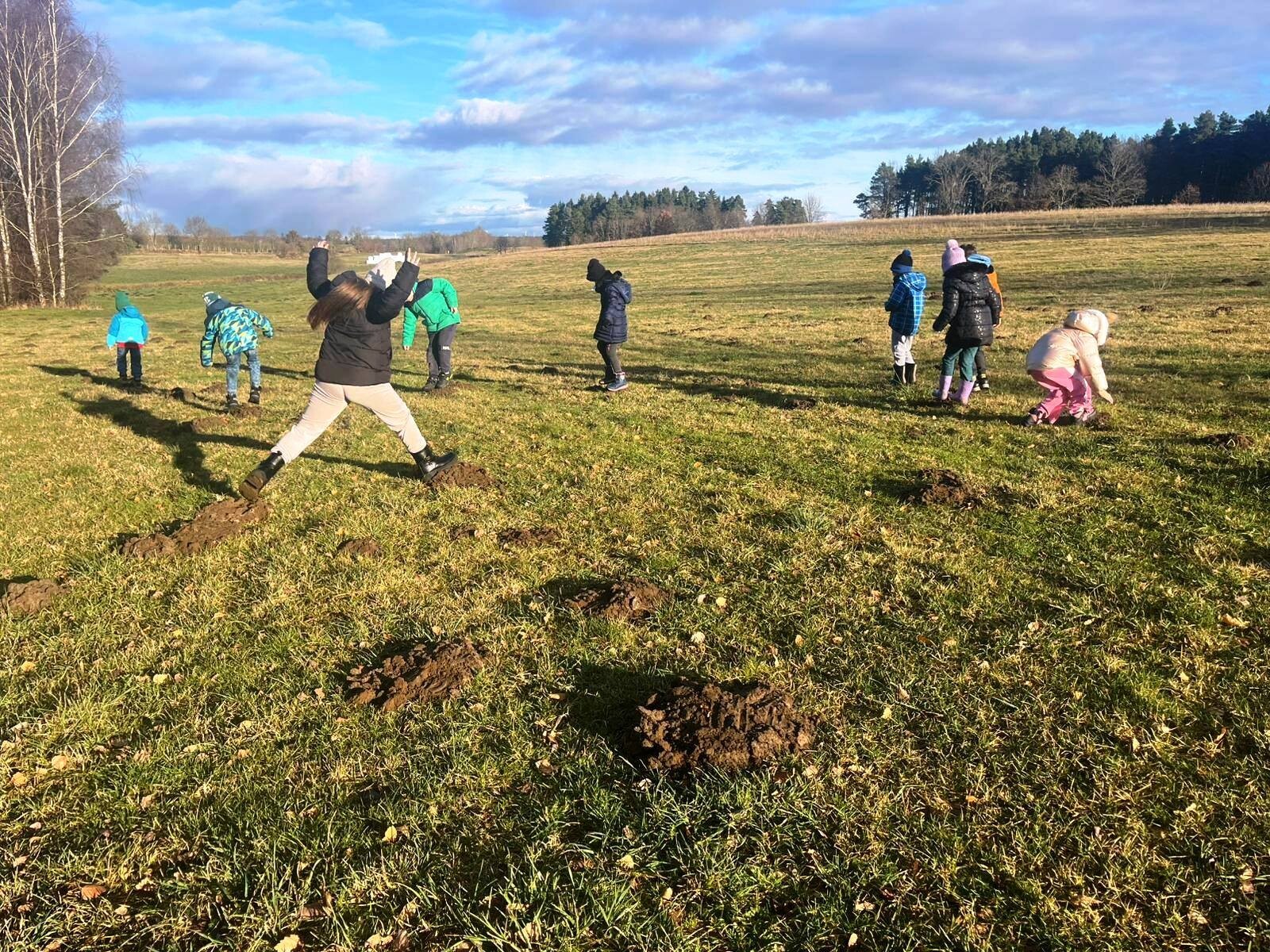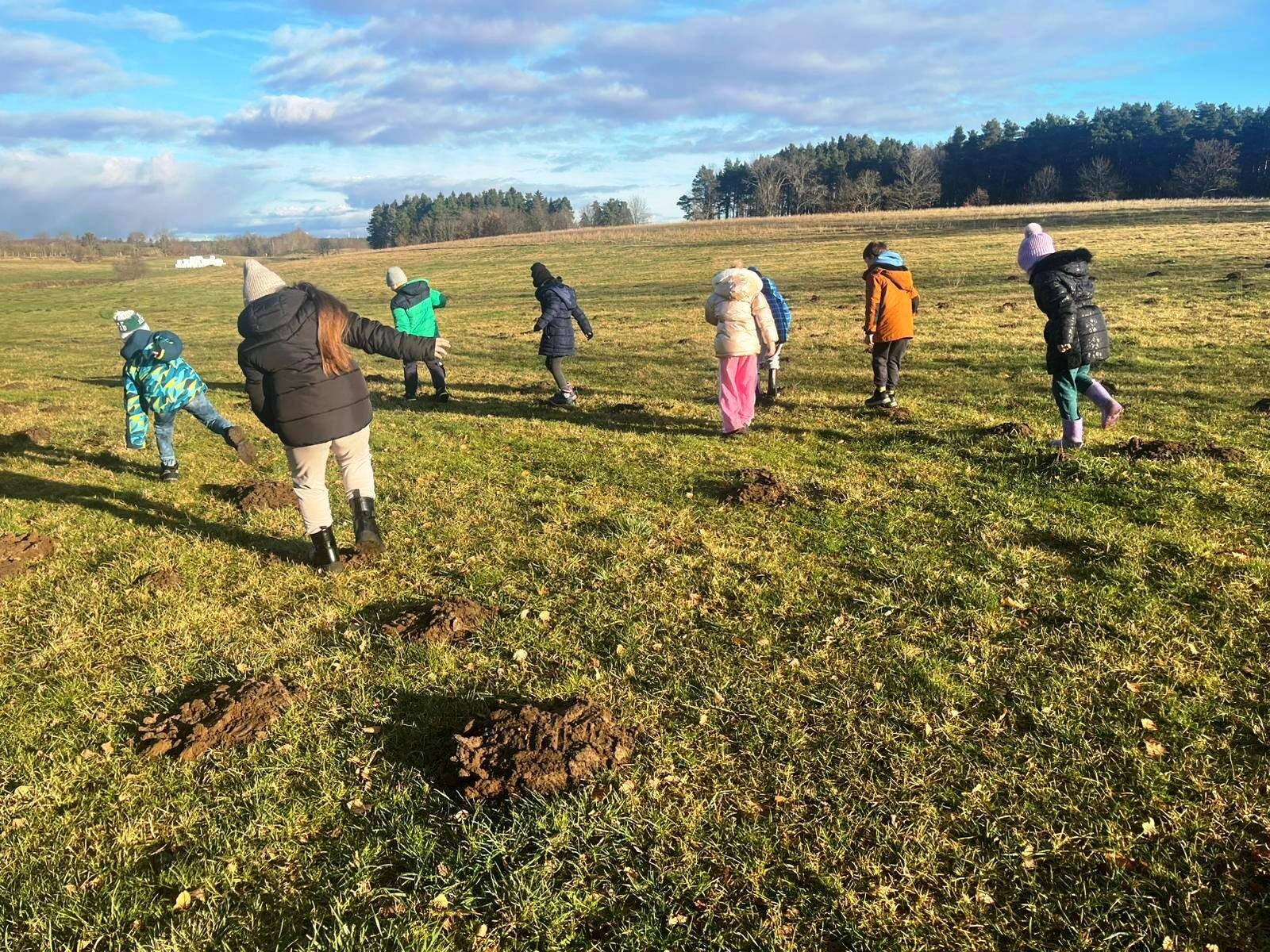 Następnie ruszyliśmy w stronę lasu. Tam czekało na nas mnóstwo ruchu i zabaw na świeżym powietrzu: przeliczanie kroków, „trawa to lawa” z przeskakiwaniem po kretowiskach, zabawa w „gąski i wilki”, a także porównywanie patyków i układanie ich od najmniejszego do największego, co stało się świetnym ćwiczeniem matematyczno-przyrodniczym.