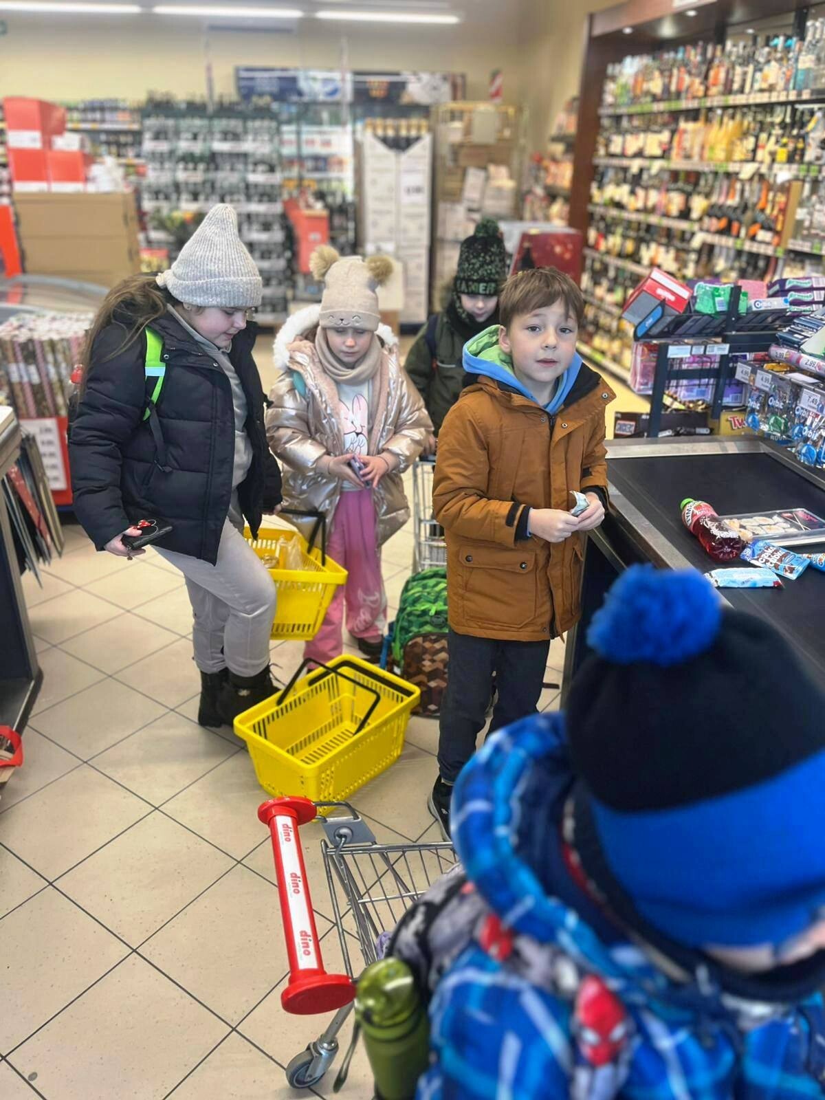 Uczniowie klasy 1a spędzili wyjątkowy, słoneczny dzień poza murami szkoły. Naszą wyprawę rozpoczęliśmy w sklepie spożywczym, gdzie każdy samodzielnie robił zakupy, przeliczając swoje monety i sprawdzając, czy na wszystko wystarczy. To praktyczne ćwiczenie doskonale uzupełniło lekcje o pieniądzach i gospodarowaniu własnym budżetem.