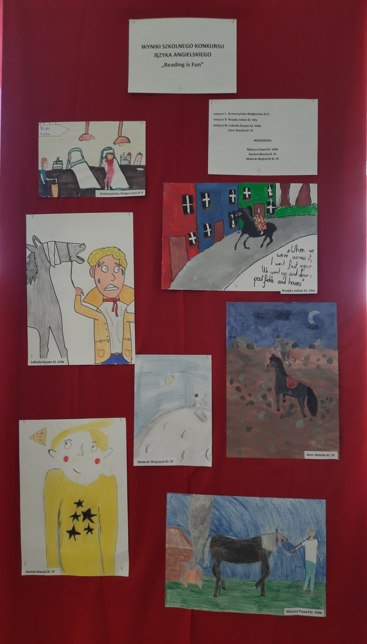 Dnia 25 kwietnia 2022r. odbył się Szkolny Konkurs Języka Angielskiego "Reading is Fun". Zadaniem uczniów było przeczytanie wskazanej przez nauczyciela lektury, w języku angielskim. Następnie uczniowie musieli wykonać plakat przedstawiający dowolną scenę z przeczytanej książki i przystąpić do testu wiedzy.