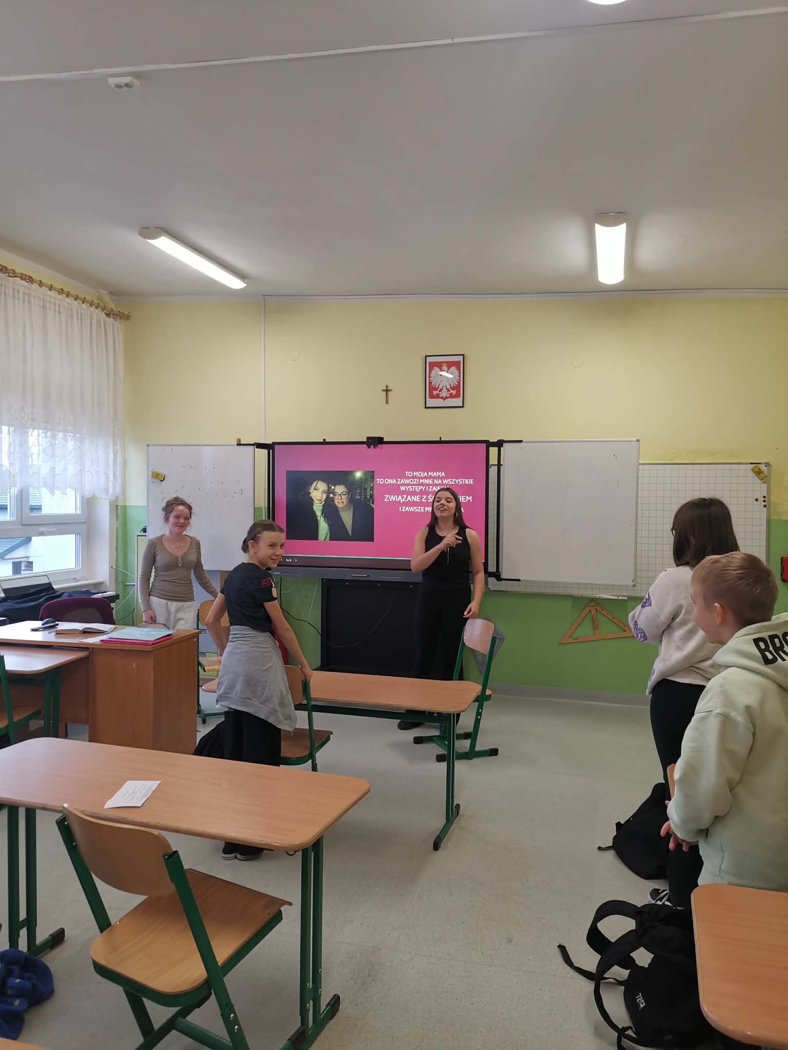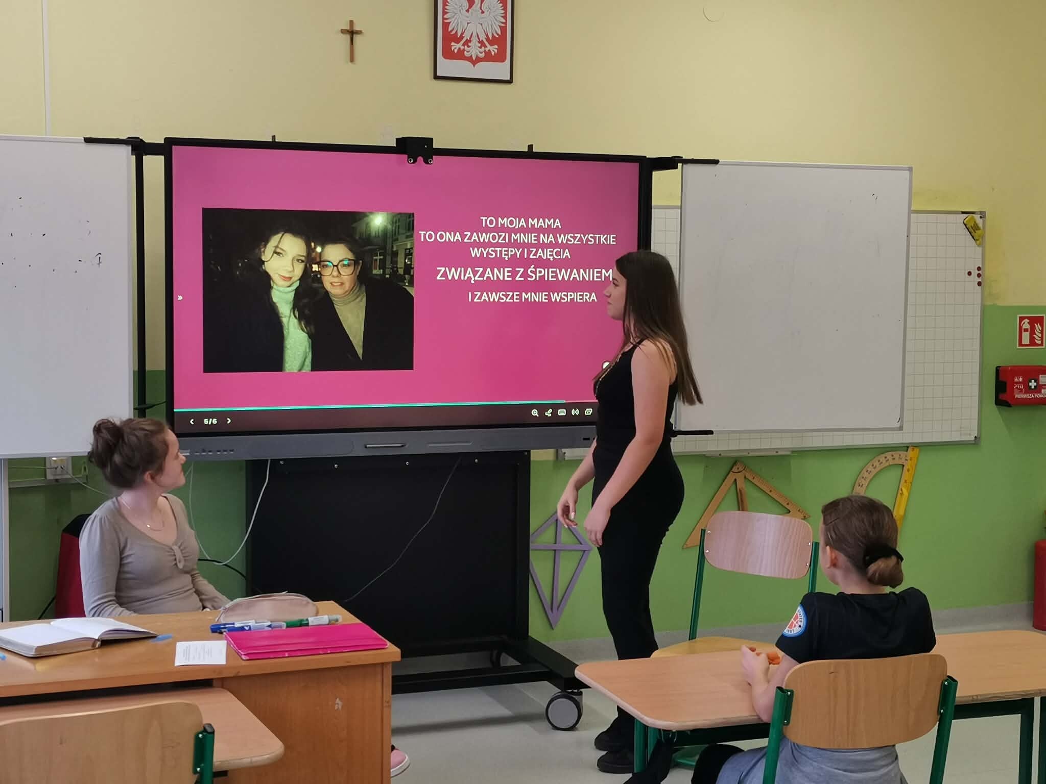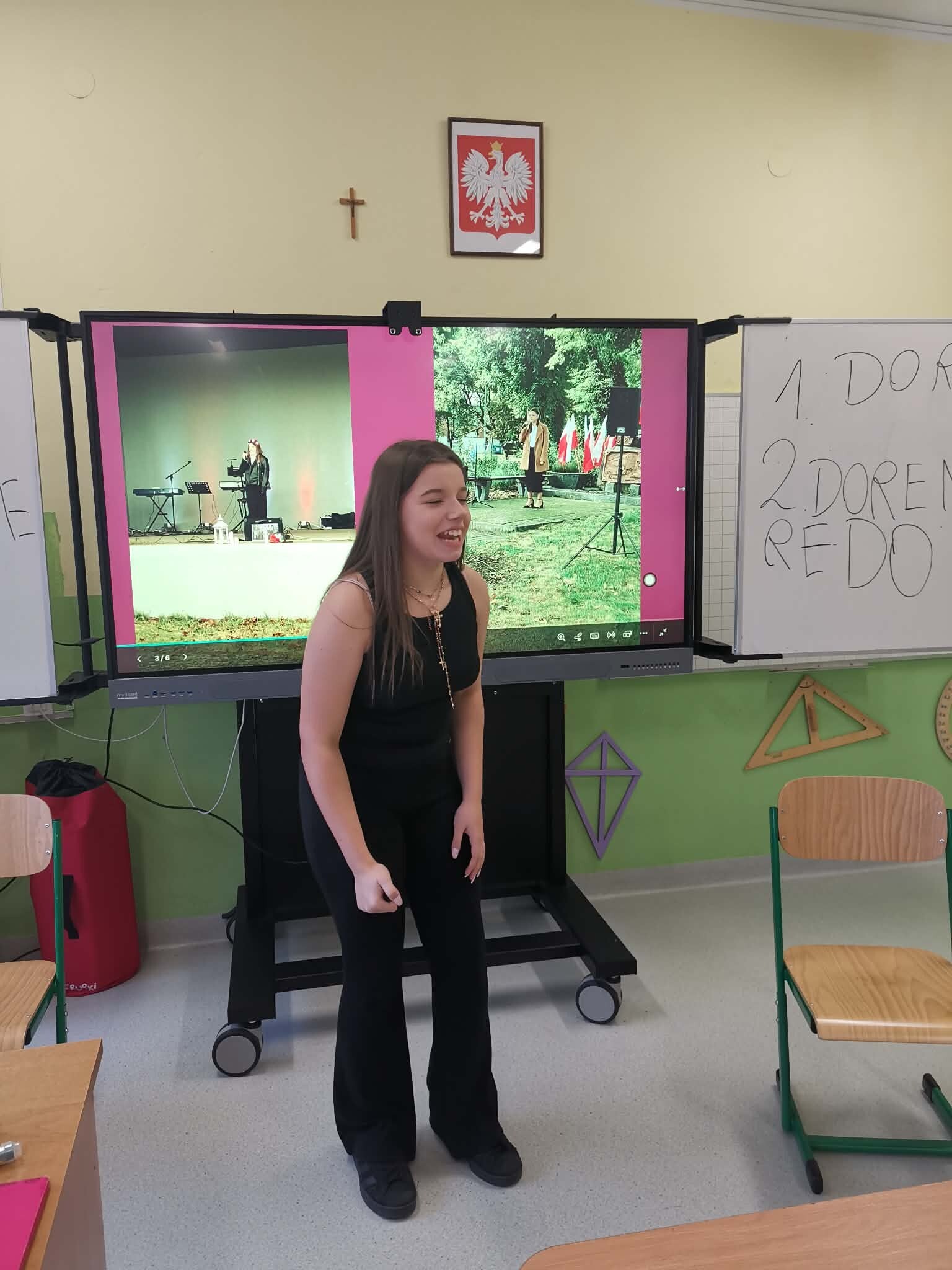 W trakcie odpowiadania na pytania Marcelina odnosiła się do zdjęć z prezentacji, którą sama wcześniej przygotowała. Uczennica już od kilku lat doskonali swój talent muzyczny dzięki ogromnemu wsparciu Rodziców, co bardzo podkreślała. Stwierdziła, że "jej kalendarz jest zapełniony". Dużo czasu poświęca na lekcje indywidualne (ćwiczy wokal), zajęcia grupowe ( MDK w Lęborku) oraz chór (w Nowej Wsi Lęborskiej). Na koniec prezentacji Marcelina namówiła nas na ćwiczenia tzw. rozśpiewkę, co okazało się niełatwym zadaniem. Było trochę śmiechu!