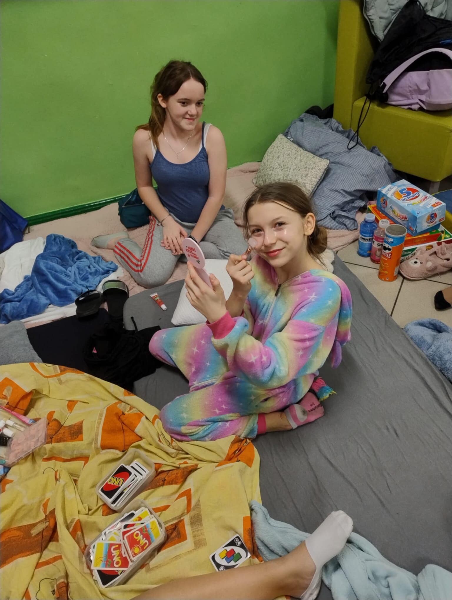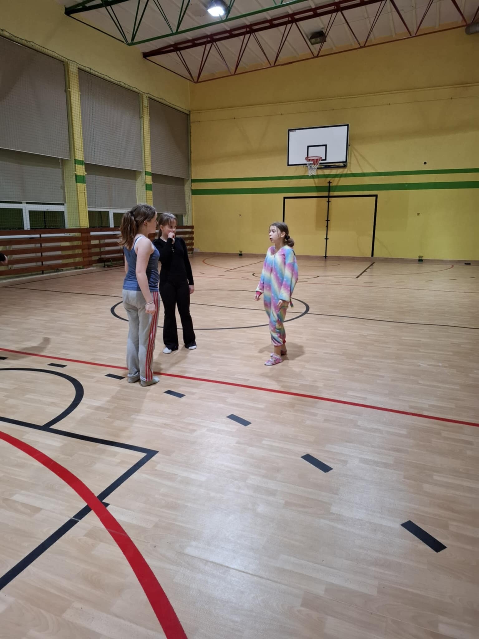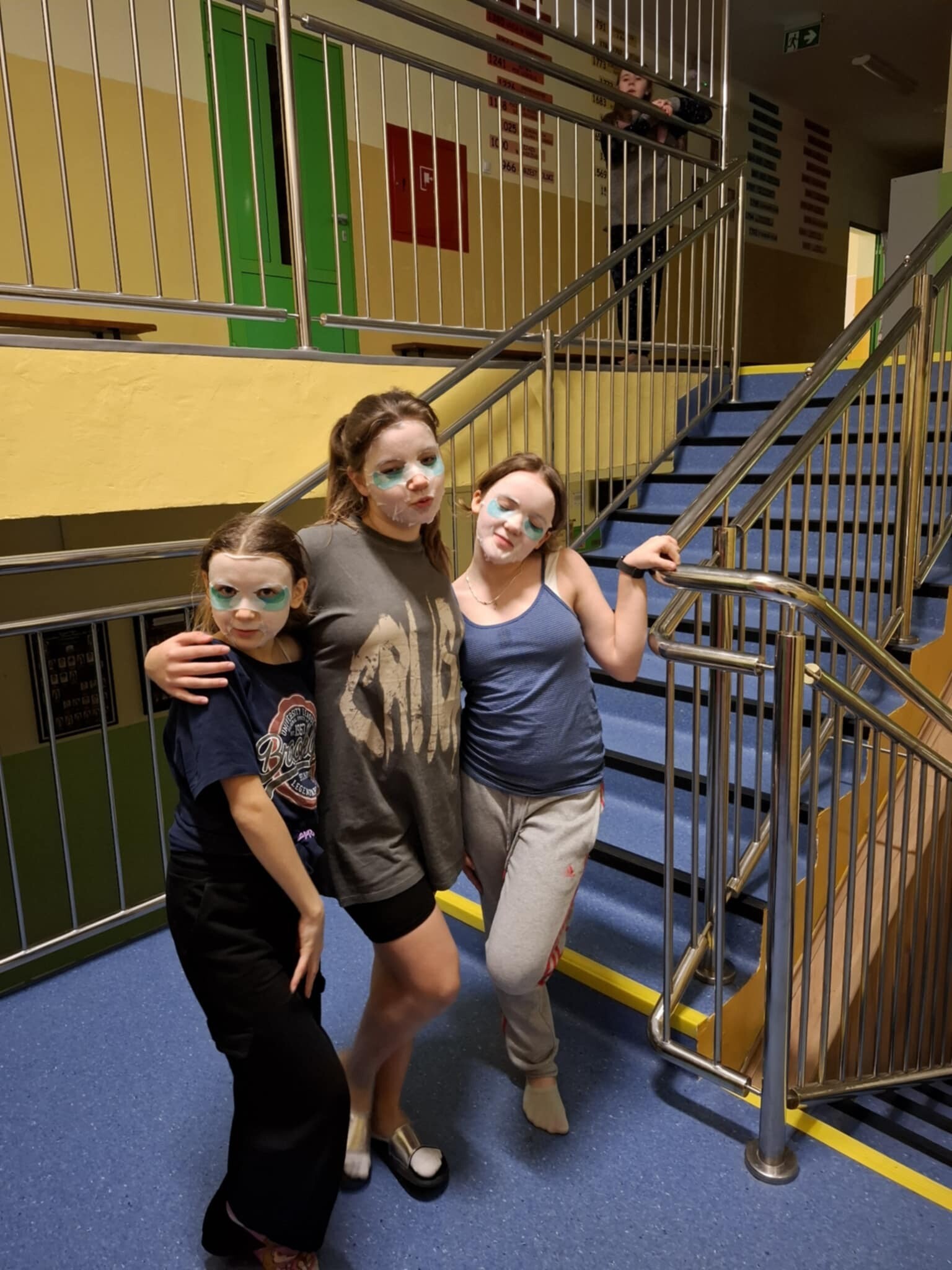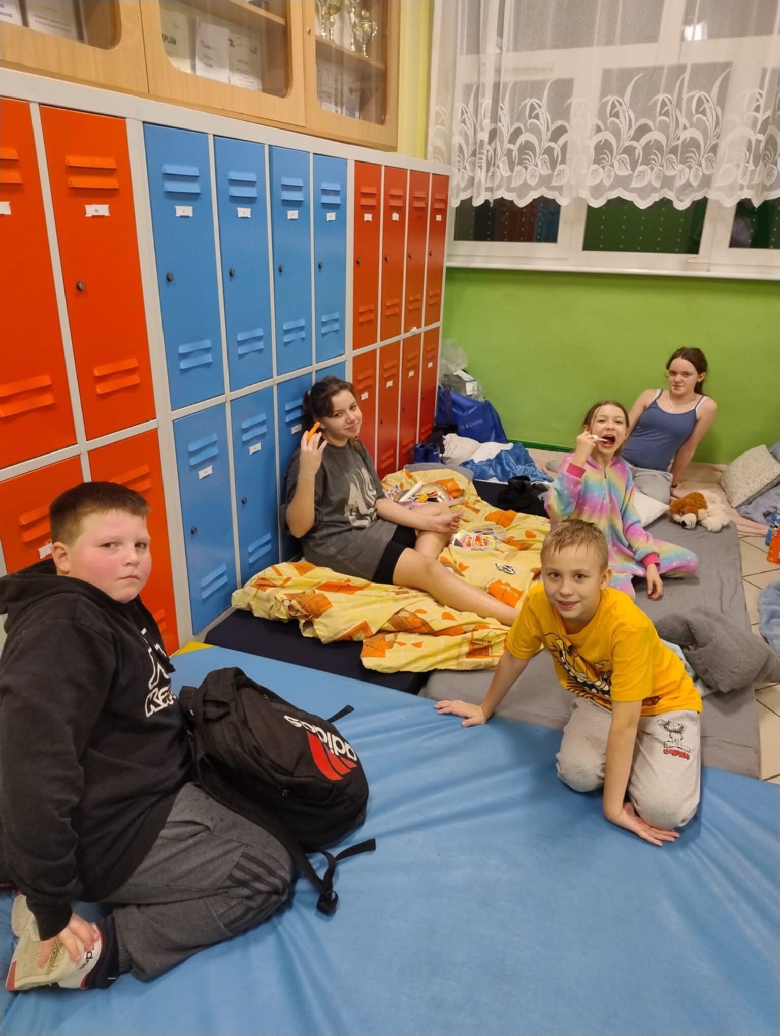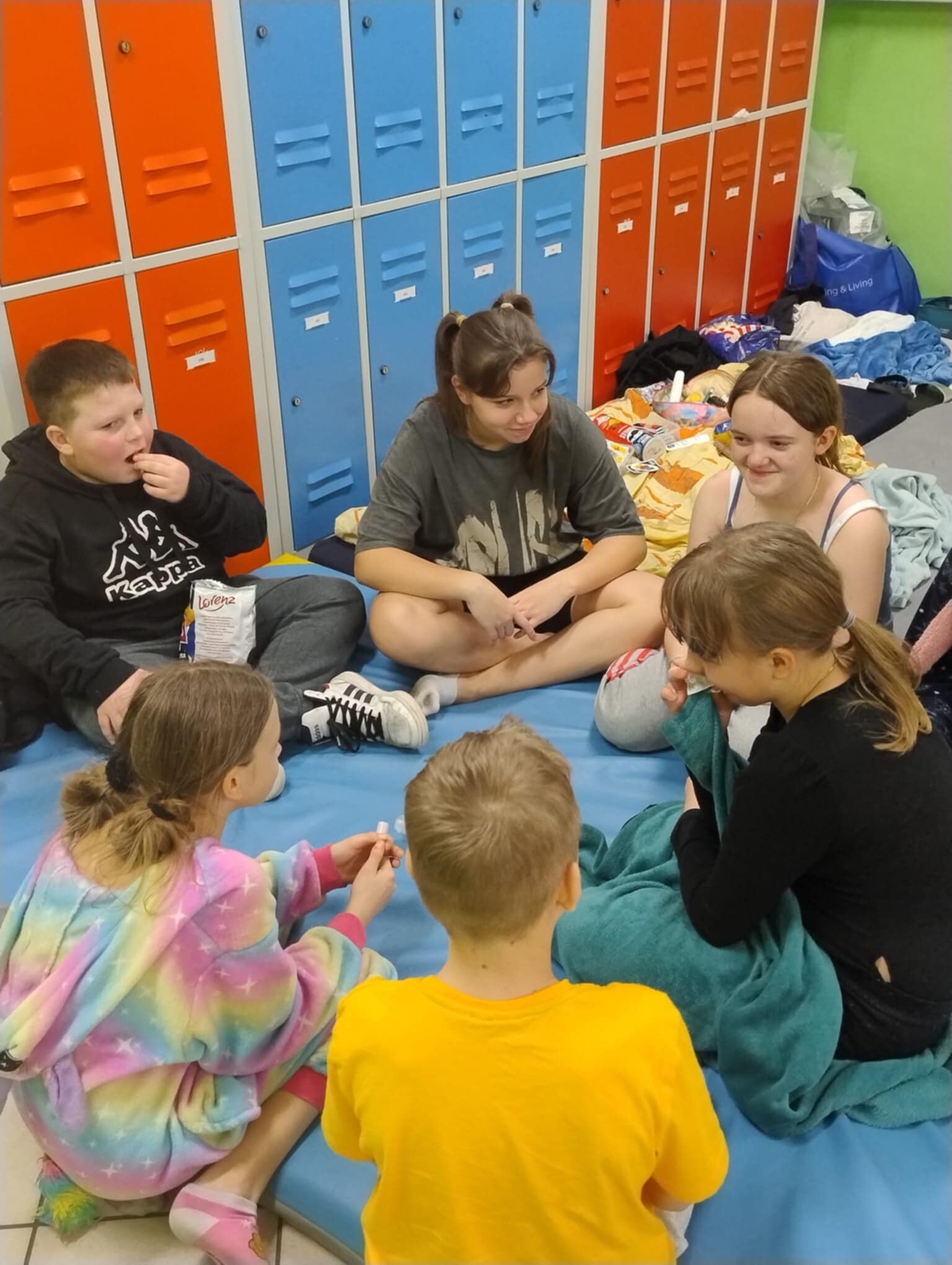 Mnóstwo frajdy sprawiło samo rozkładanie śpiworów i materacy. Po wspólnym przygotowaniu i zjedzeniu pizzy i innych potraw, kiedy zrobiło się już zupełnie ciemno, przyszedł czas na wspólną zabawę. Uczniowie sprawdzili się w rolach kucharzy, poszukiwaczy, tancerzy, miłośników kina i wokalistów. Były też gry, zabawy i konkurencje zespołowe. Niektórzy wykorzystali swój zmysł organizacyjny. Inni zadbali o porządek i bezpieczeństwo w trakcie nocowania. A jeszcze inni zaprezentowali galę ciekawych nocnych przebrań. Każdy miał szansę pokazać się z jak najlepszej strony.