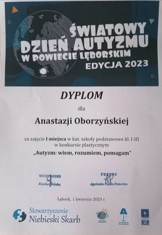 W sobotę na Placu Pokoju w Lęborku po Marszu dla Autyzmu został rozstrzygnięty powiatowy konkurs plastyczny "Autyzm: wiem, rozumiem, pomagam". Uczennica klasy I Ansatazja Oborzyńska zajęła I miejsce. Opiekunem Anastazji była Pani Dorota Boetcher. Poziom konkursu był bardzo wysoki, napłynęło ponad 250 prac. Gratulujemy zwycięstwa.