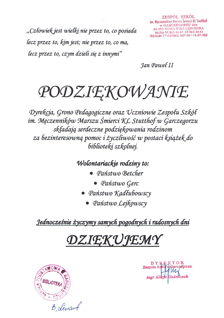 Pani Alicja Guźniczak - Dyrektor Zespołu Szkół w Garczegorzu oraz Pani Bożena Lenart - Nauczyciel/ Bibliotekarz, składają serdeczne podziękowania dla zaangażowanych rodzin w powiększenie dobytku utworów literackich w bibliotece szkolnej.
