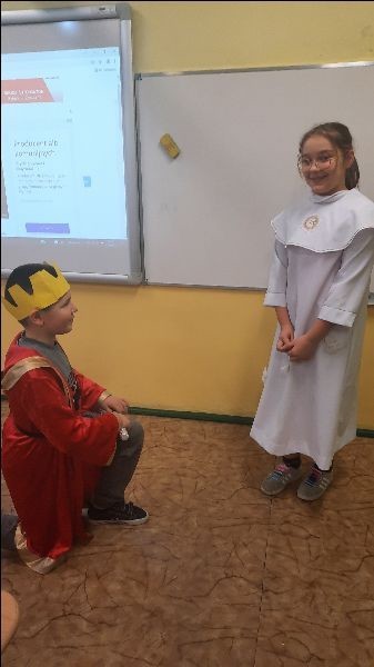 Na lekcji historii w ostatnim czasie zagościli nietypowi goście. Uczniów klasy IV odwiedzili sam Mieszko i Dobrawa. Zaszczycili naszych kochanych czwartaczków możliwością uczestnictwa w ich ślubie. Nie zabrakło księdza i gości weselnych. Taka forma zajęć, nad którymi czuwała Elżbieta Laskiewicz- nauczyciel historii- okazała się dla uczniów wielką przyjemnością. Zachęcamy do obejrzenia fotorelacji.
