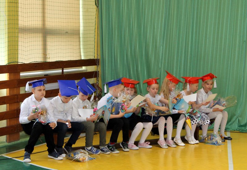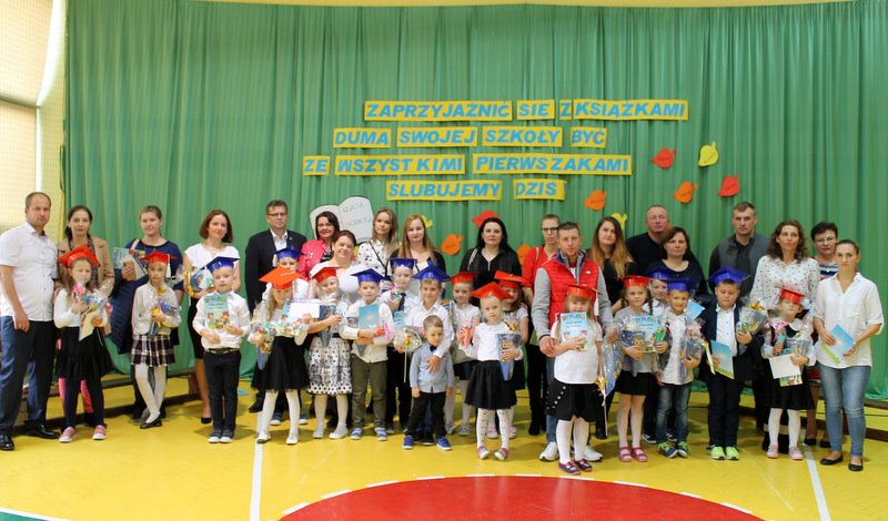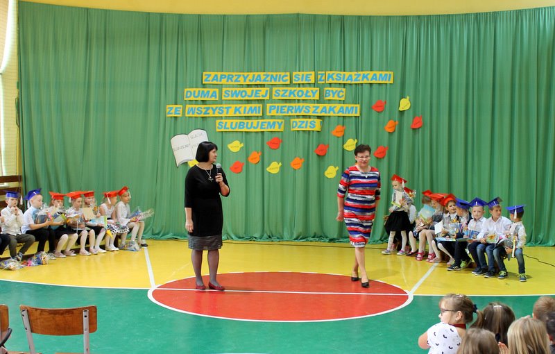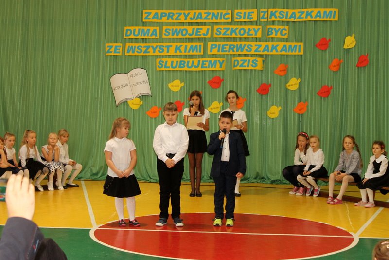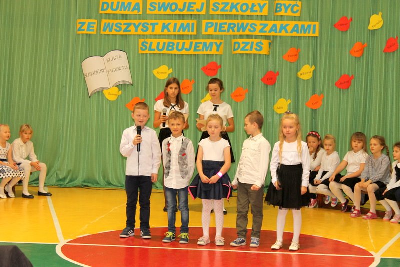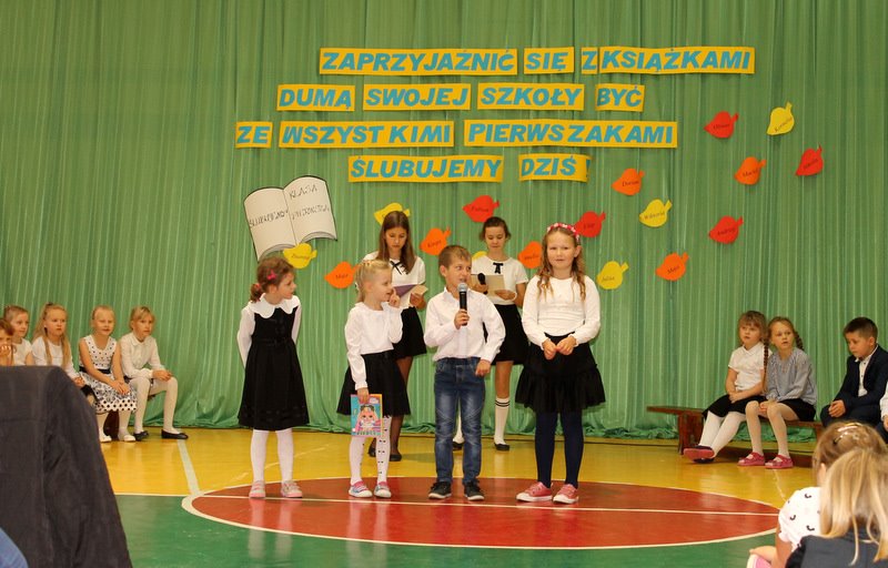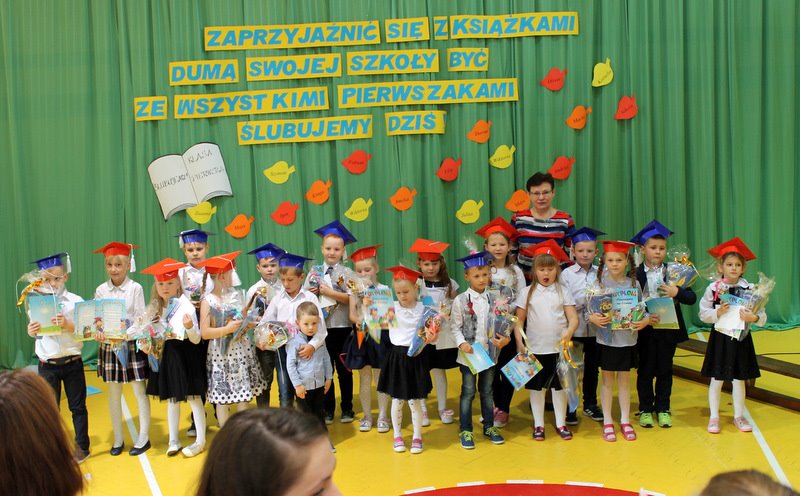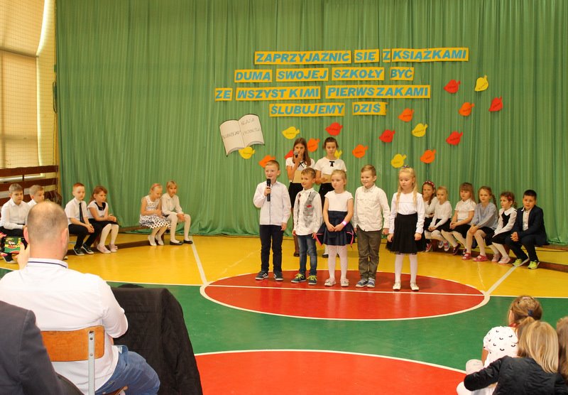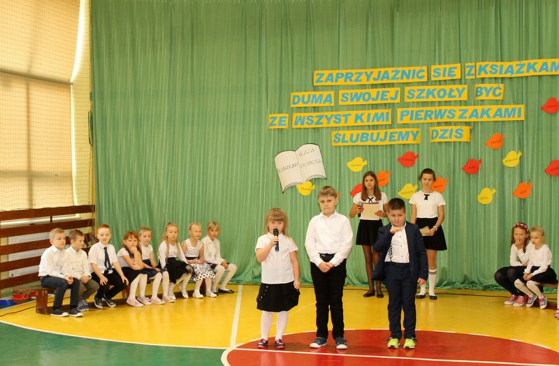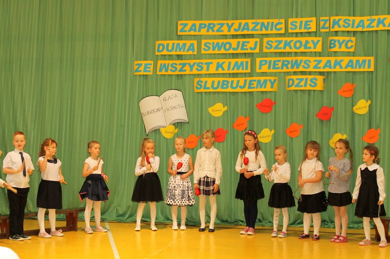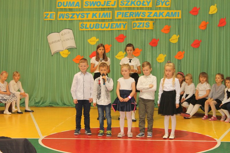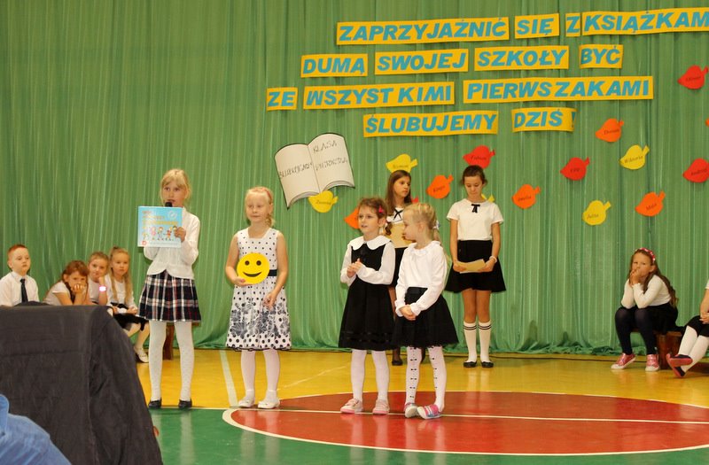 Zanim pierwszaki zostały przyjęte do grona uczniów musiały wykazać się umiejętnościami śpiewu, recytacji, tańca, gry na instrumentach perkusyjnych. Występy dzieci spotkały się z bardzo ciepłym przyjęciem. Mali artyści po każdym występie byli nagradzani brawami. Otrzymali pamiątkowy dyplom pasowania na ucznia, róg obfitości wypełniony słodyczami od rodziców oraz od klasy drugiej. Następnie Pani bibliotekarka sprawdziła znajomość bajek, po czym zostali czytelnikami naszej szkoły. Po części oficjalnej dzieci zostały zaproszone na słodki poczęstunek przygotowany przez Rodziców.