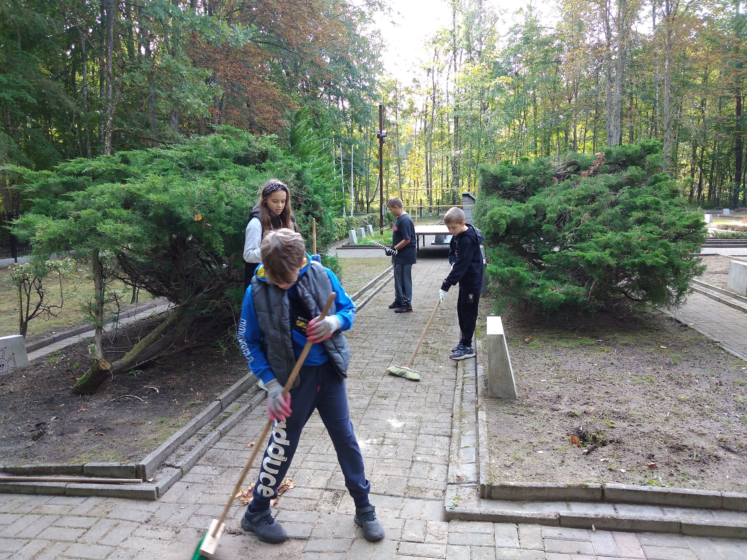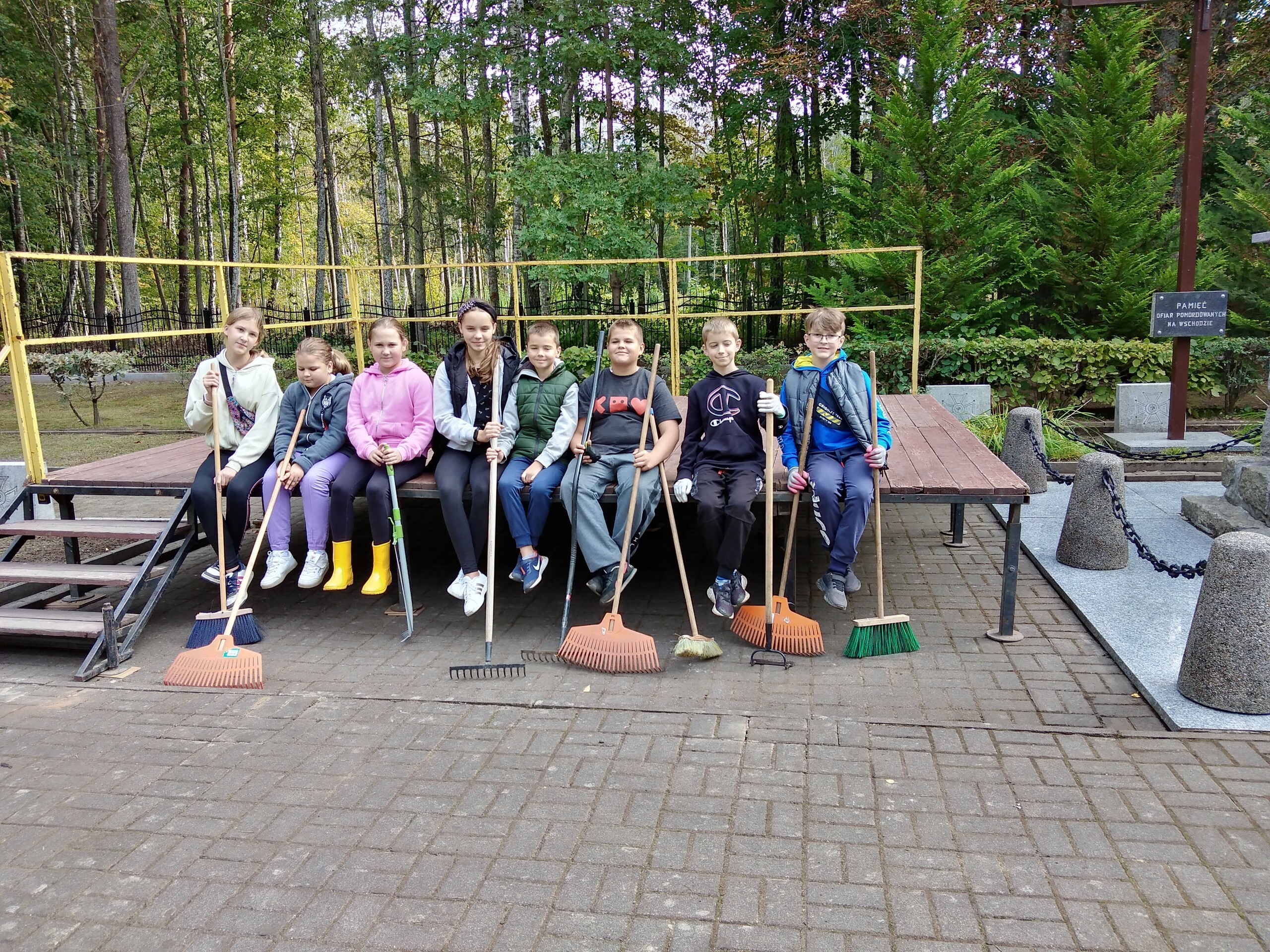 Pogoda sprzyjała, bo nie wiało i spadło niewiele liści. Mimo to przybyli uczniowie mieli co robić. Dzielnie grabili liście, zamiatali chodniki. Zmęczeni, ale zadowoleni usiedli i odpoczywali po zakończonej pracy. Dziećmi opiekowała się p. Irena Bednarczyk.