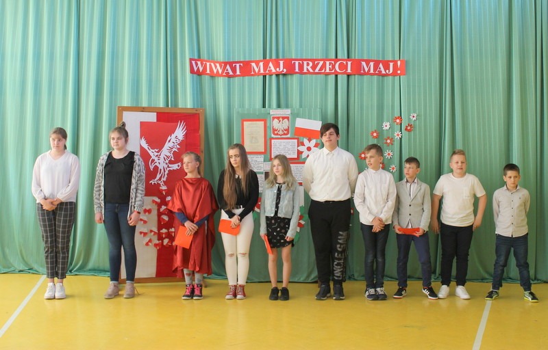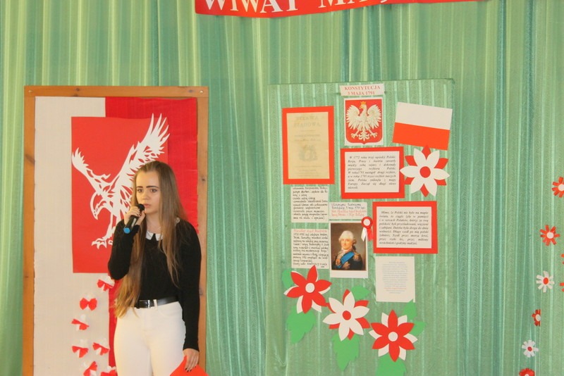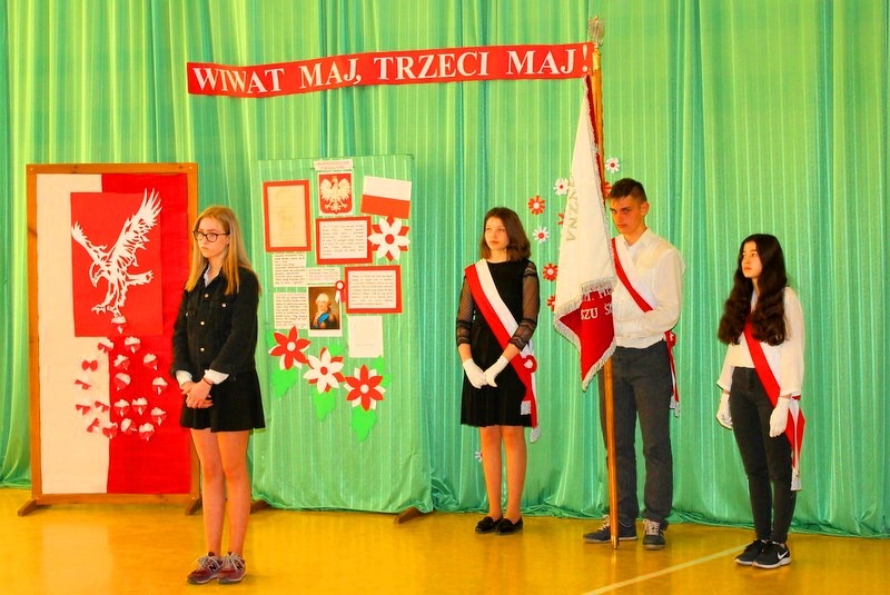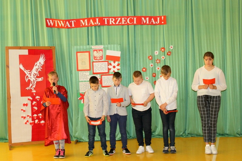 Dnia 30 kwietnia odbyła się w naszej szkole uroczystość z okazji Święta Konstytucji 3 Maja. Przedstawienie o tematyce patriotycznej przygotowała klasa VI pod opieką wychowawczyni pani Honoraty Smentoch. Uroczystość rozpoczęła się wprowadzeniem sztandaru szkoły i odśpiewaniem hymnu.