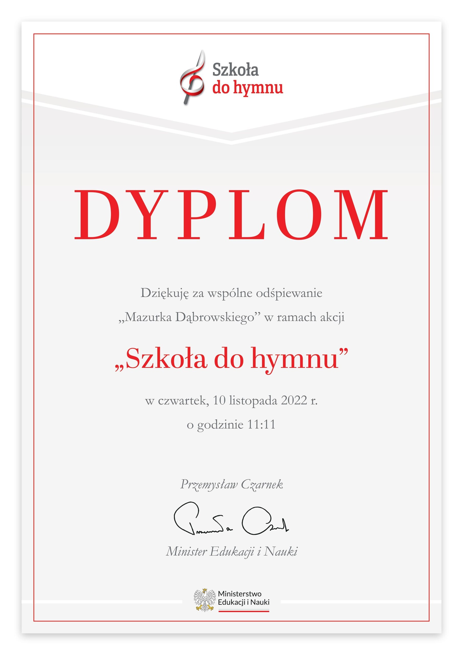 w imieniu Ministra Edukacji i Nauki Przemysława Czarnka serdecznie dziękujemy za udział w akcji „Szkoła do hymnu”. Miło nam poinformować, że w tegorocznej inicjatywie wzięło udział blisko 20,5 tys. przedszkoli, szkół i placówek oświatowych z kraju oraz prawie 360 placówek polonijnych z całego świata. Cieszymy się, że 10 listopada o godz. 11:11 byli Państwo z nami!