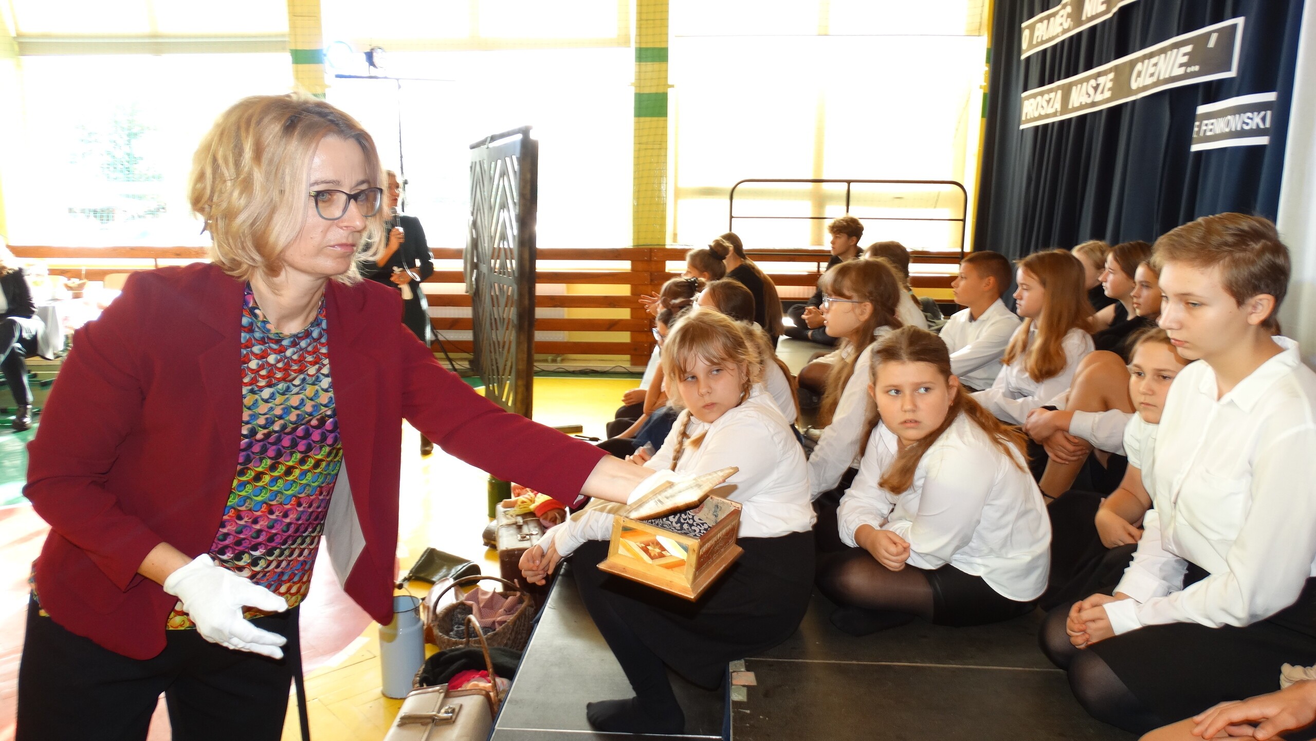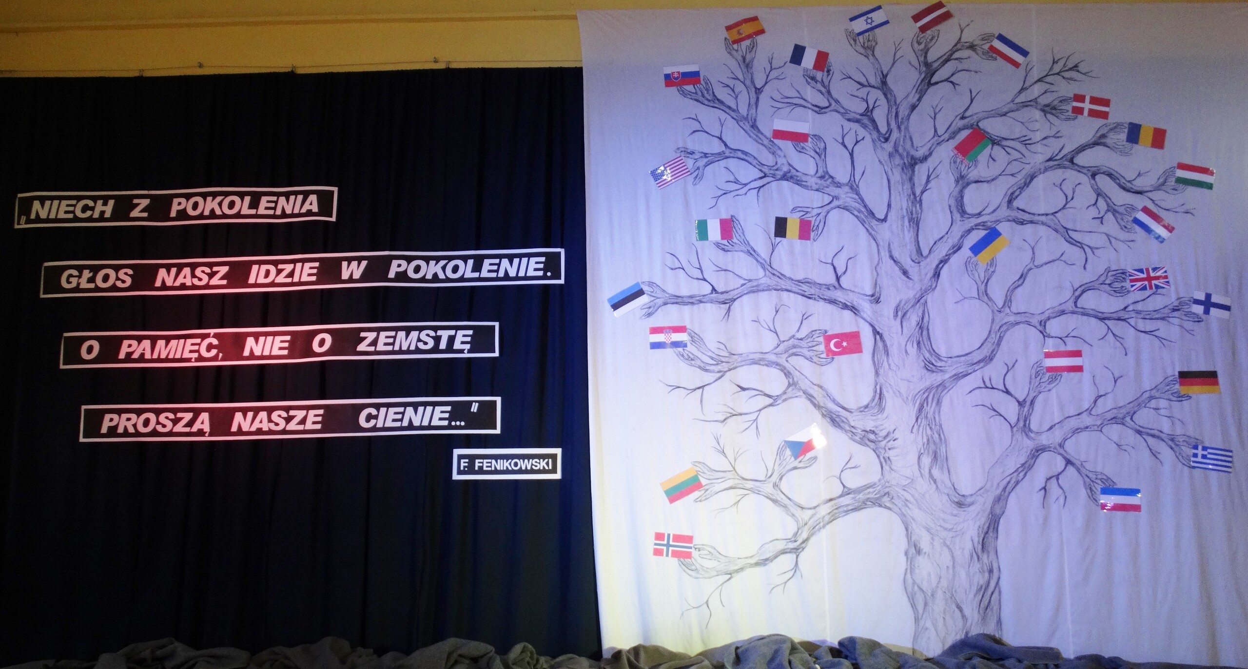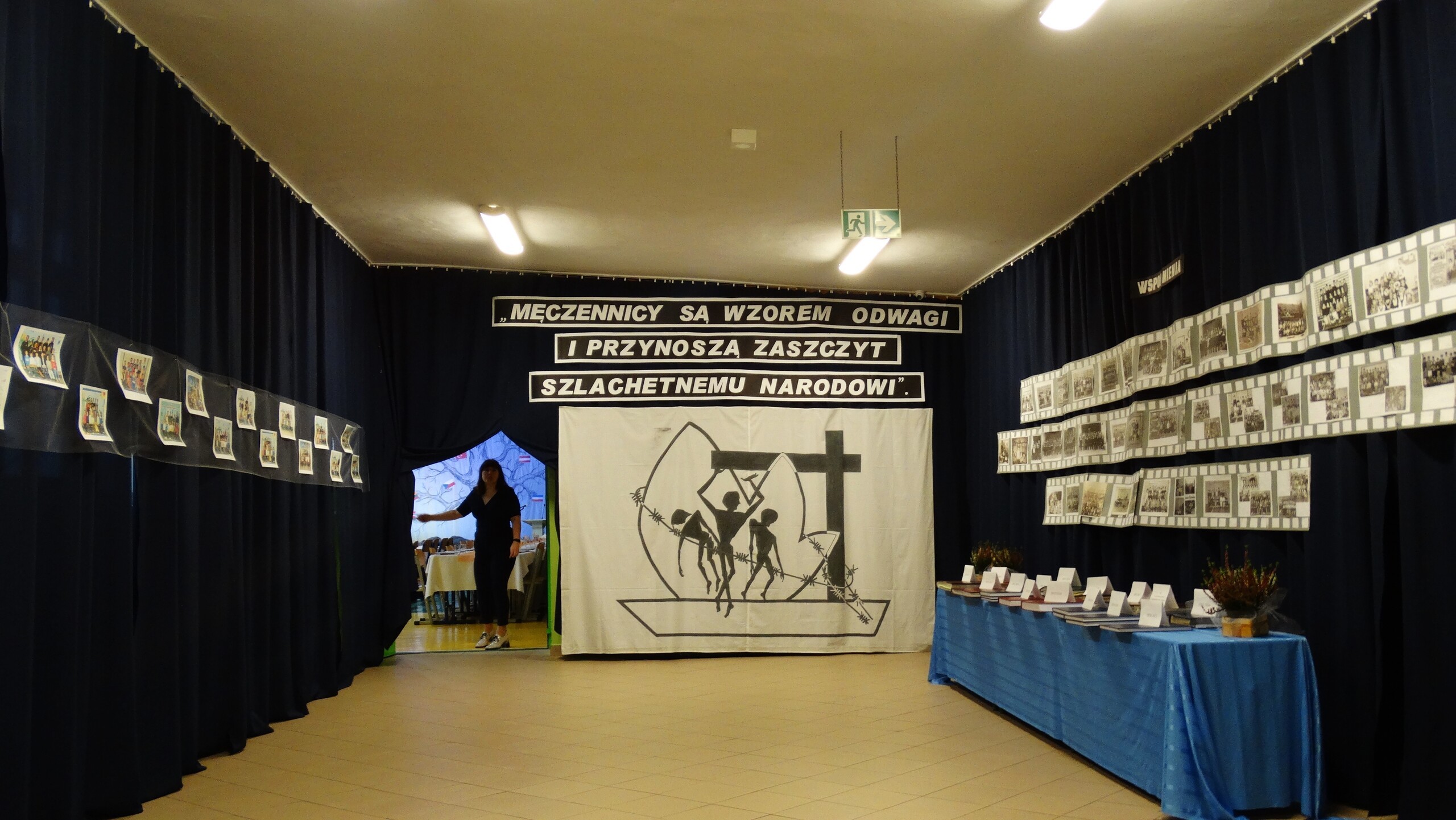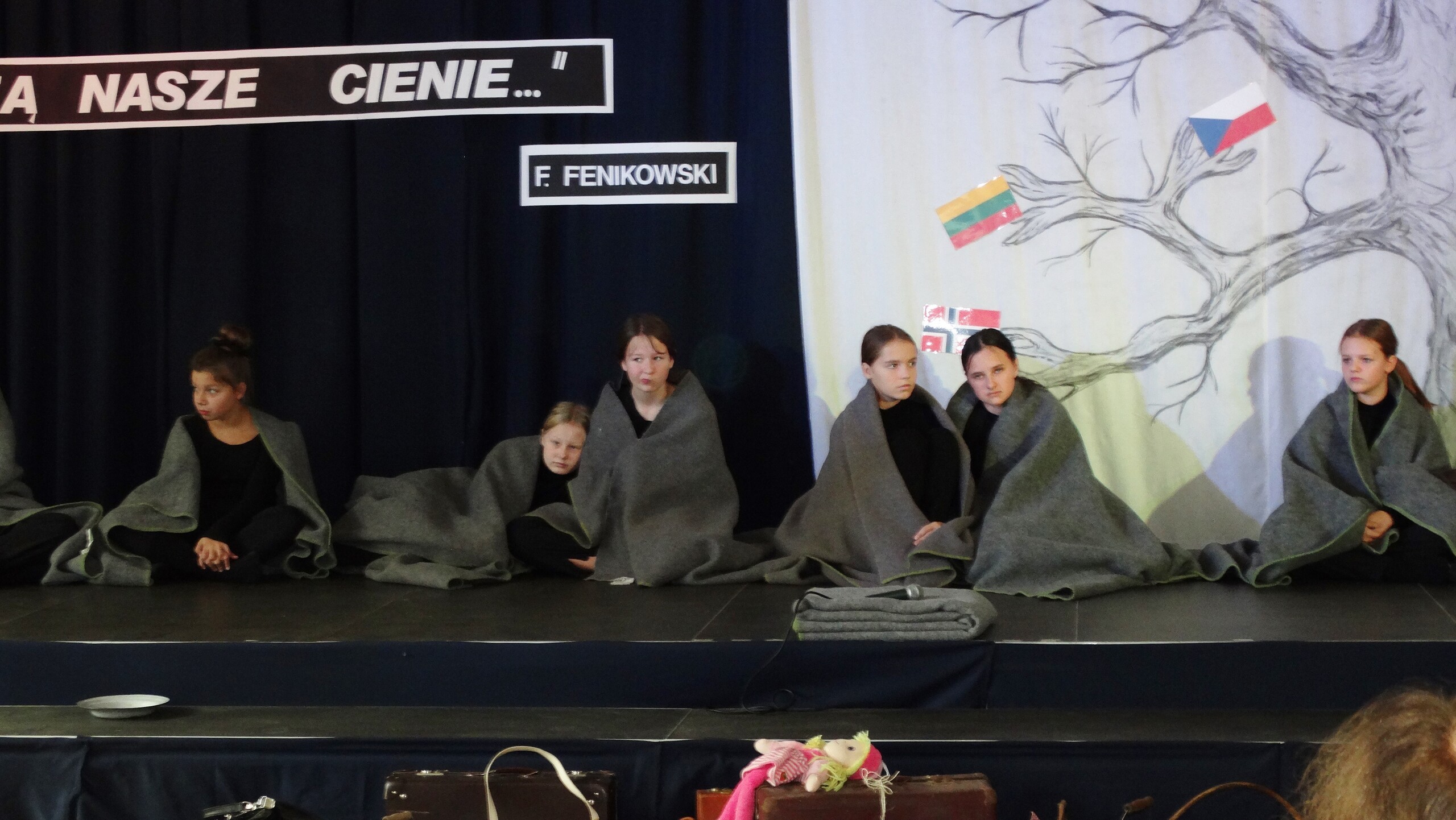 Przez salę wolnym krokiem szła kolumna jeszcze cywilów, którzy podążali w stronę Bramy Śmierci-w inscenizacji brali udział uczniowie, rodzice i nauczyciele przebrani w stroje z epoki lat 40 -ych XX w. Przy przejmującej , poważnej muzyce na scenę weszli uczniowie , którzy wygłaszali wspomnienia byłych więźniów( którzy wówczas mieli 12-16 lat )i wiersze. Jak wszyscy podkreślali zrobili to z sercem i ogromnym zaangażowaniem. Słowną część montażu zakończył chór szkolny, który zaśpiewał pieśń poświęconą więźniom KL Stutthof.