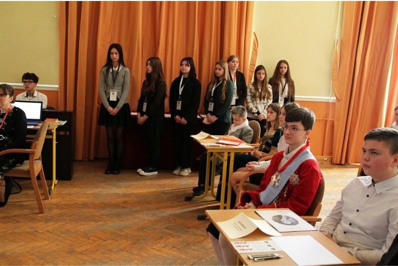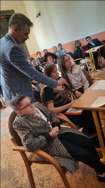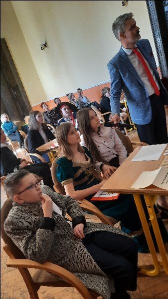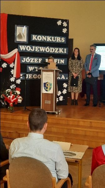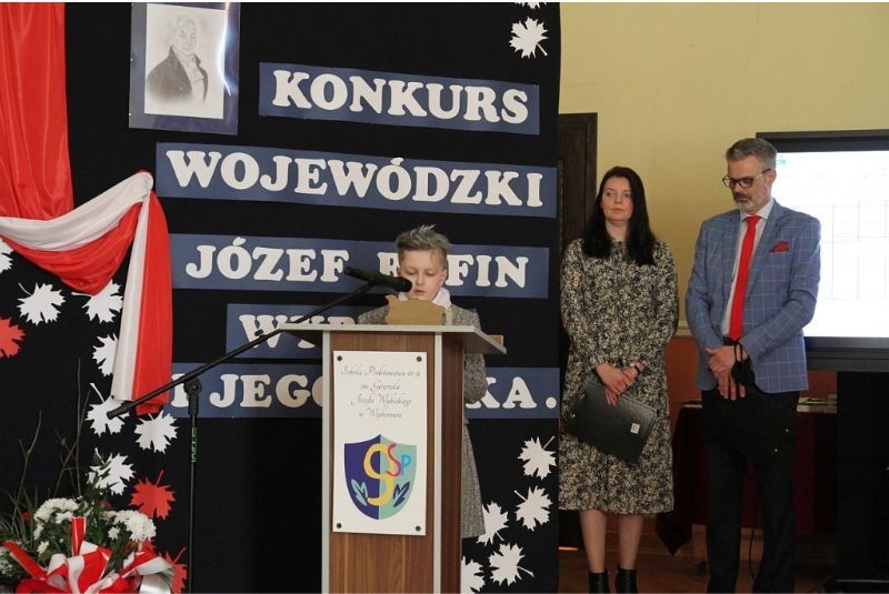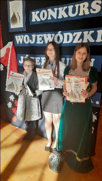 Nasi uczniowie- Julian Rzepka, Karolina Jurczyk i Kinga Zalewska od kilku miesięcy borykali się z trudem konkursu wojewódzkiego- "Józef Rufin Wybicki i jego epoka". Organizatorem konkursu była szkoła Podstawowa nr 9 im. Józefa Wybickiego w Wejherowie. Zadania konkursowe były bardzo wymagające- uczniowie rozwiązywali bardzo szczegółowe testy wiedzy, sporządzali mapę miejscowości związaną z Józefem Wybickim, analizowali herb Rogala rodu Wybickich, projektowali pocztówkę z okazji 200 rocznicy śmierci wybitnego Polaka. Po wykonaniu tych zadań (od października 2021) nasza trójka zakwalifikowała się do finału wojewódzkiego. Radość była ogromna ale pracy jeszcze więcej. Nasi znawcy historii epoki oświecenia musieli wcielić się w postać Wybickiego, przygotować i wygłosić przemówienia w imieniu samego twórcy hymnu- "Napisałem Pieśń Legionów Polskich we Włoszech, ponieważ...", przygotować referat na temat- "Józef Wybicki- wędrowiec". W zmaganiach finałowych rozwiązywali krzyżówki, zadania matematyczne, odczytywali informacje zapisane szyfrem oraz odpowiadali na indywidualne pytania dotyczące życia Józefa Wybickiego.