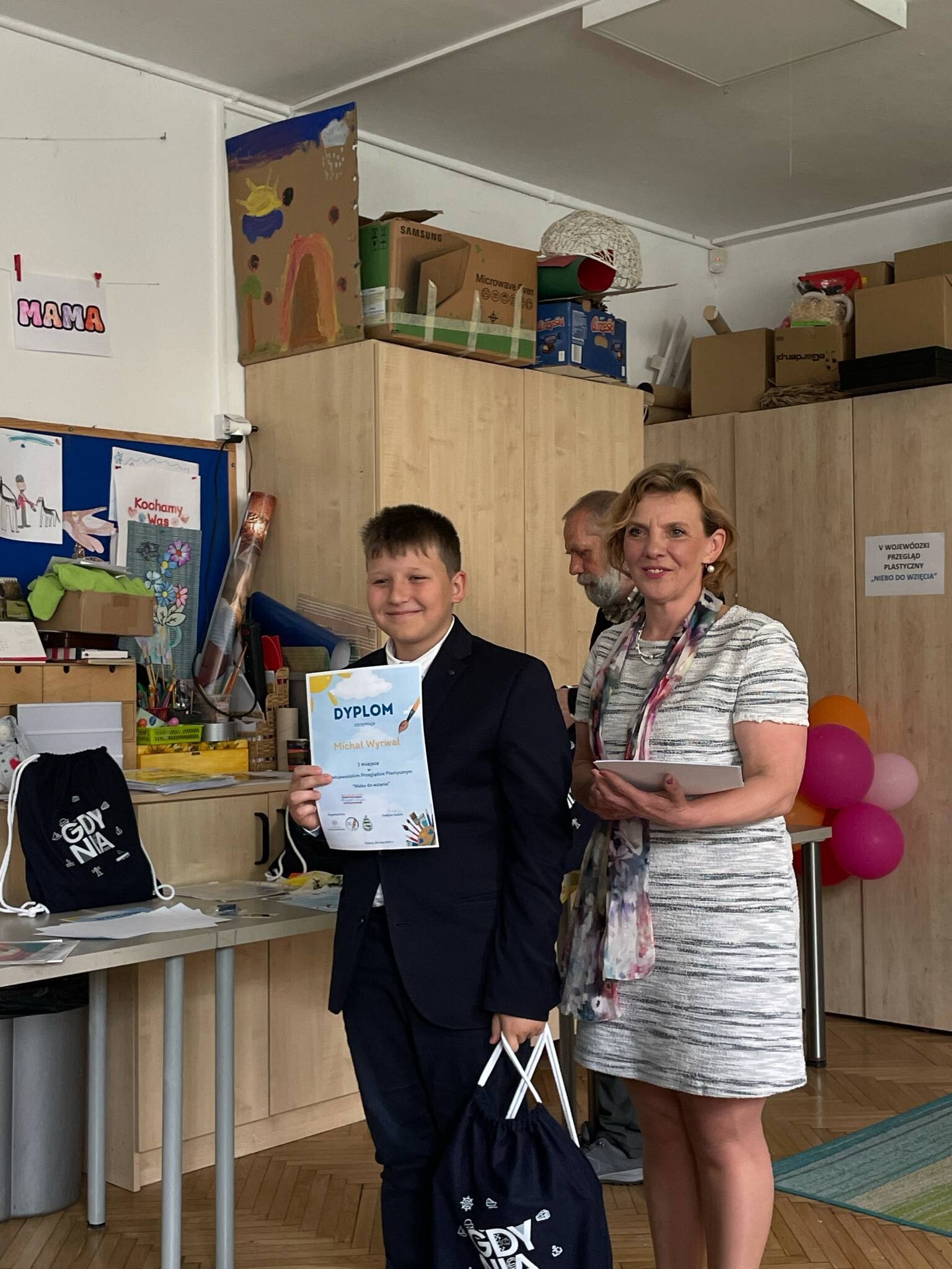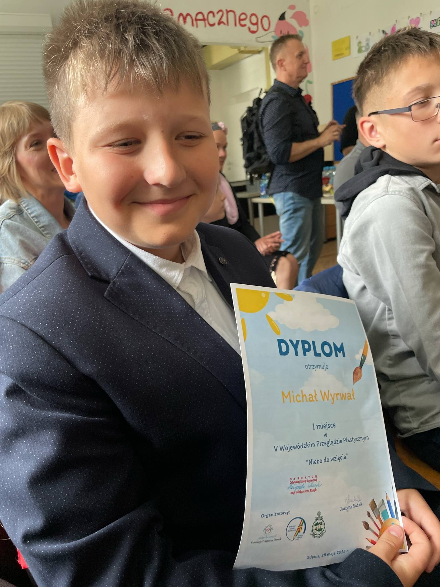 Uczeń naszej szkoły Michał Wyrwał z klasy 4 został laureatem Wojewódzkiego Przeglądu Plastycznego - „Niebo do wzięcia". Konkurs organizowany był przez Gdyńską Szkołę Społeczną i Fundację Przytulny Domek. Gratulujemy Michałowi wygranej i życzymy dalszych artystycznych sukcesów!