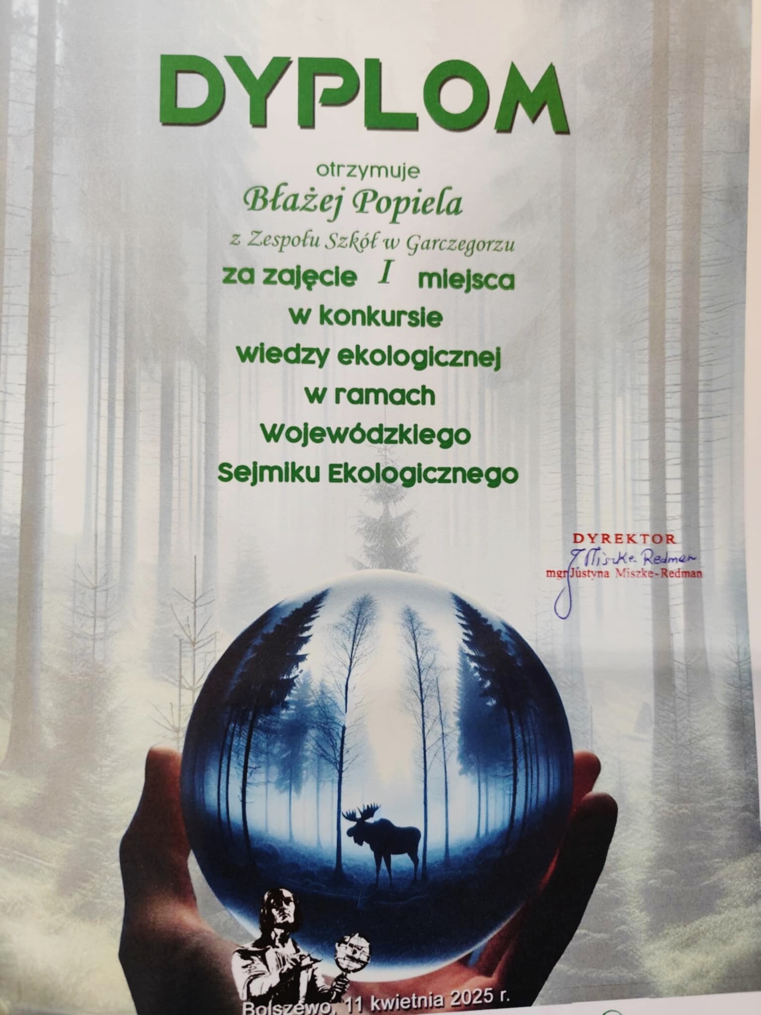 Z ogromną radością i dumą dzielimy się wspaniałą wiadomością – Błażej Popiela , uczeń klasy 8, po raz kolejny udowodnił, że marzenia, pasja i ciężka praca prowadzą do sukcesu! Zdobył I miejsce w wojewódzkim konkursie pt. Wojewódzki Sejmik Ekologiczny, organizowanym przez Szkołę Podstawową nr 1 w Bolszewie, pokazując nie tylko swoją wiedzę i talent, ale także wytrwałość i determinację. O wysokim poziomie konkursu świadczy fakt, że zanim wyłoniono zwycięzcę, odbyła się podwójna dogrywka, w której Błażej musiał się zmierzyć ze swoim rywalem. Gratulujemy Ci Błażej, z całego serca! Twój sukces to również ogromna radość dla całej społeczności szkolnej. Składamy również serdeczne podziękowania i gratulacje Rodzicom – to dzięki Państwa wsparciu i zaangażowaniu Błażej może sięgać po najwyższe laury. Jesteś dla nas inspiracją! Trzymamy kciuki za kolejne wyzwania i wierzymy, że to dopiero początek pięknej drogi!