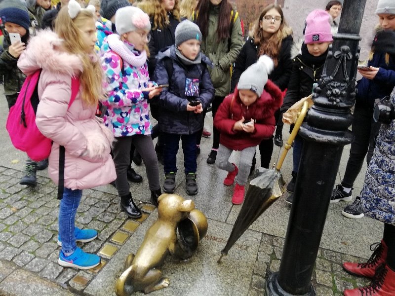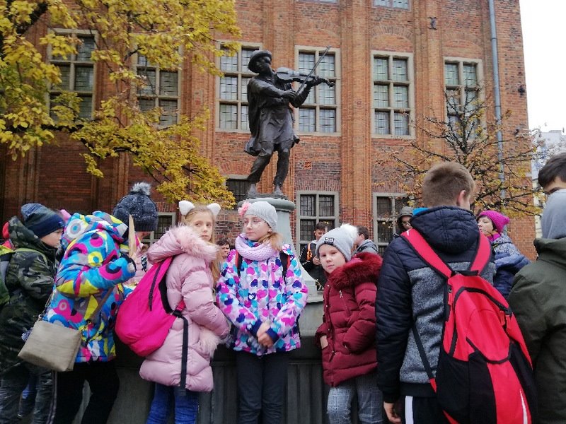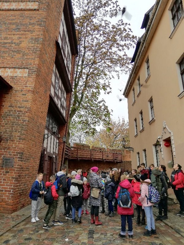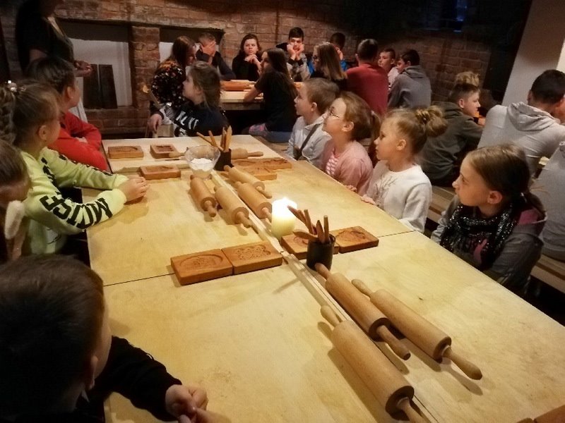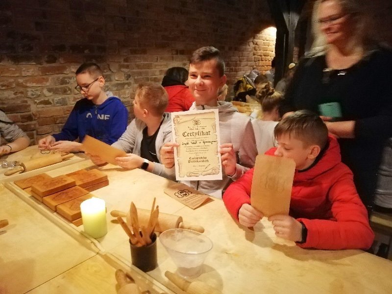 Kolejnym punktem naszej wycieczki były warsztaty w Toruńskiej Piernikarni Mistrza Bogumiła. Uczniowie własnoręcznie wykonywali pierniki. Dowiedzieli się z jakich składników piecze się ,, Katarzynki " oraz poznali legendę o ,, Toruńskich piernikach ". Mogli także kupić sobie tradycyjne ciastka wypiekane w piernikarni. Przed kolejnym zwiedzaniem udaliśmy się na ciepły posiłek do baru. Potem spotkaliśmy się z przewodnikiem,który oprowadzał nas po Starym Mieście. Zaczęliśmy od zwiedzania kościoła w którym został ochrzczony Mikołaj Kopernik. Następnie przeszliśmy pod dom w którym mieszkał do osiemnastego roku życia. Tam zrobiliśmy sobie wspólne zdjęcie. Potem udaliśmy się pod Krzewą Wieżę. Poznaliśmy jej historię i próbowaliśmy stanąć plecami przy ścianie tej wieży. Nikomu się nie udało. Wąską uliczką udaliśmy się nad Wisłę, gdzie znajdował się szron . Ostatnim punktem programu był spacer po mieście i wizyta w Dworze Artusa. Był także czas przeznaczony na zakup pamiątek. Przed powrotem do domu udaliśmy się wspólnie na ciepły posilek. W drodze powrotnej uczniowie odpowiadali na pytania pilota. Za poprawne odpowiedzi otrzymali nagrody. Szczęśliwi i zadowoleni wróciliśmy późnym wieczorem do domu.