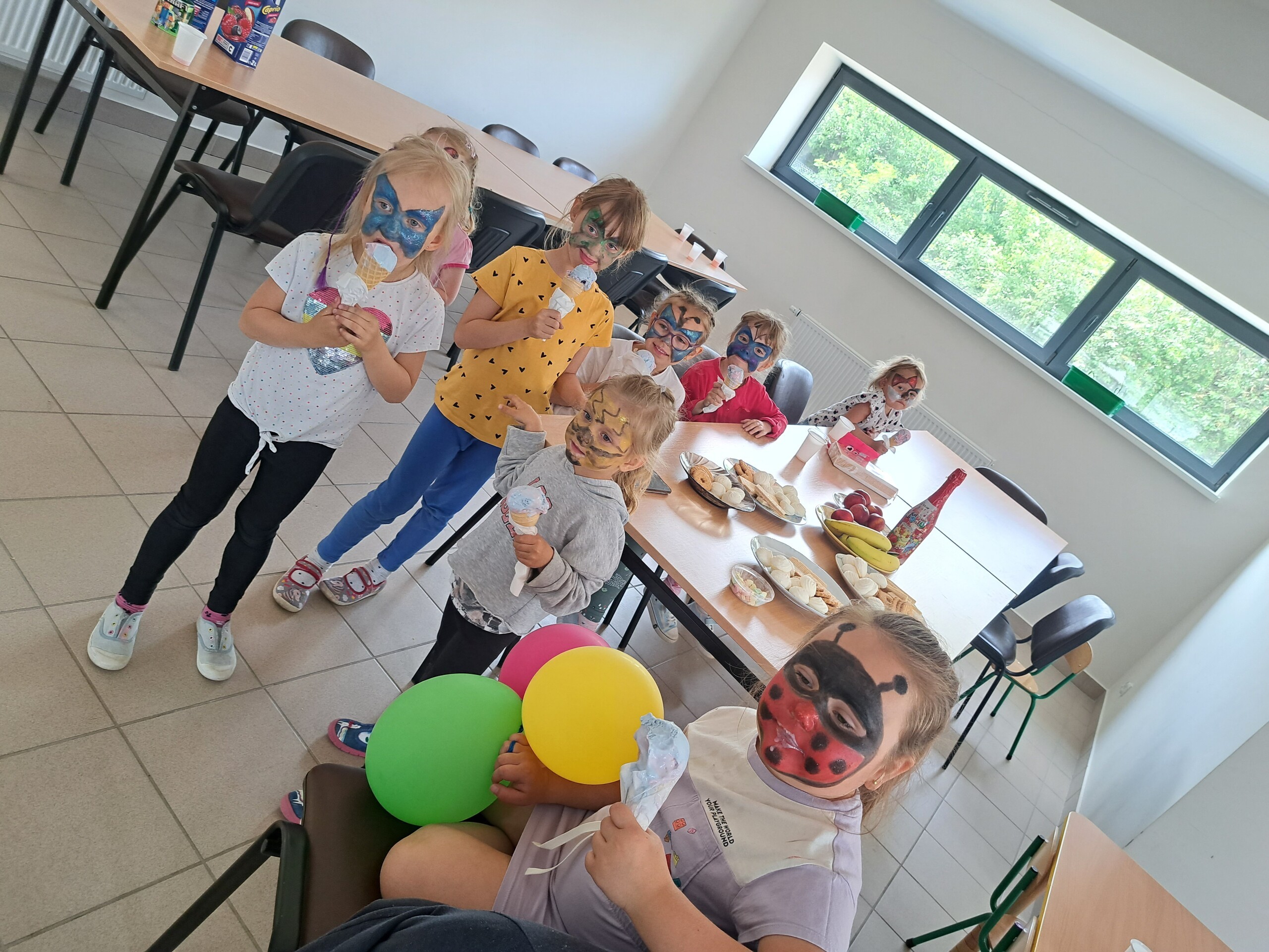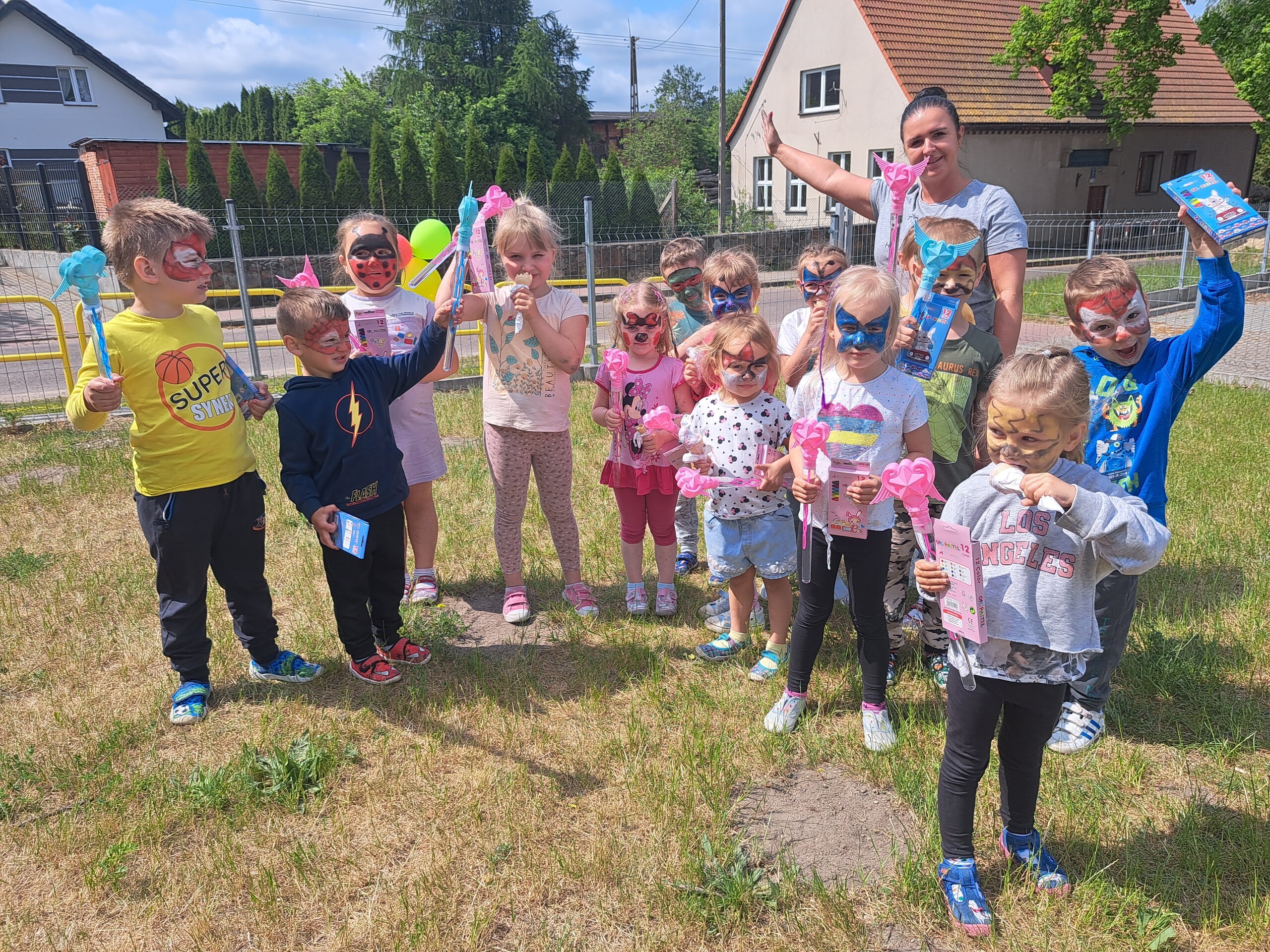 W oddziale przedszkolnym dzieci świętowały Dzień Dziecka. Nie zabrakło świetnych humorów, pomalowanych buziek i kolorowych proszków holi. Wszyscy świetnie się bawiliśmy, zajadając smażone kiełbaski, gofry z owocami oraz lody.