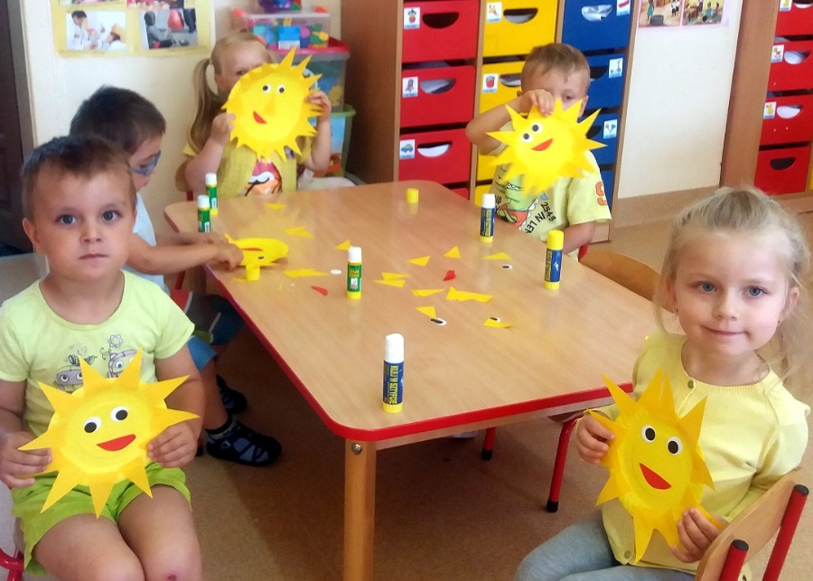 4. Wykonajcie pracę plastyczną: Uśmiechnięte słoneczko. Promykami mogą być trójkąciki lub Wasze dłonie.