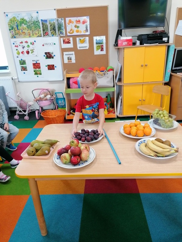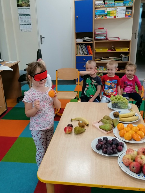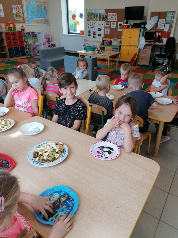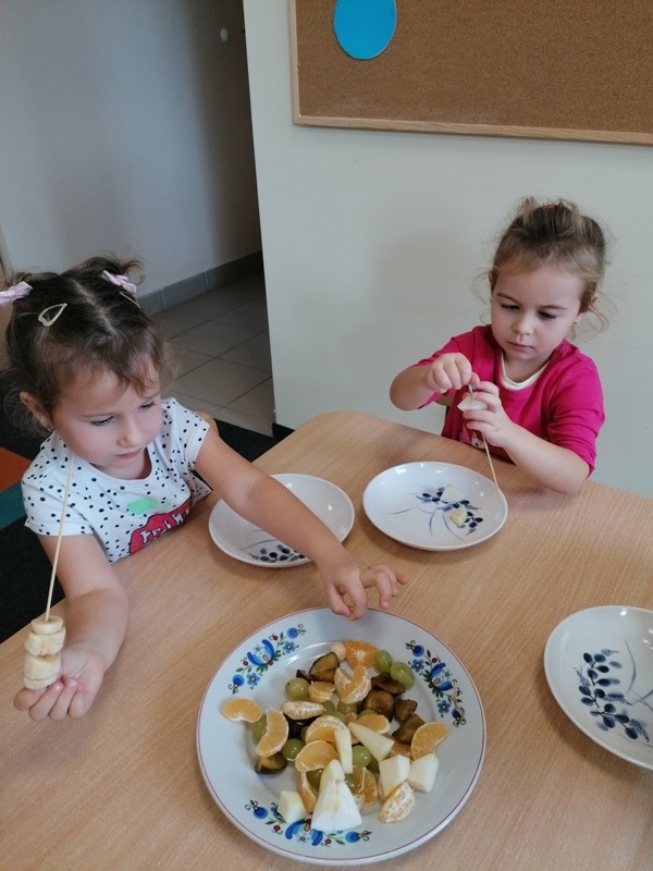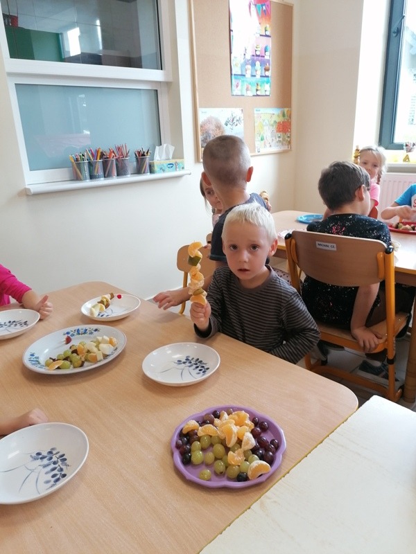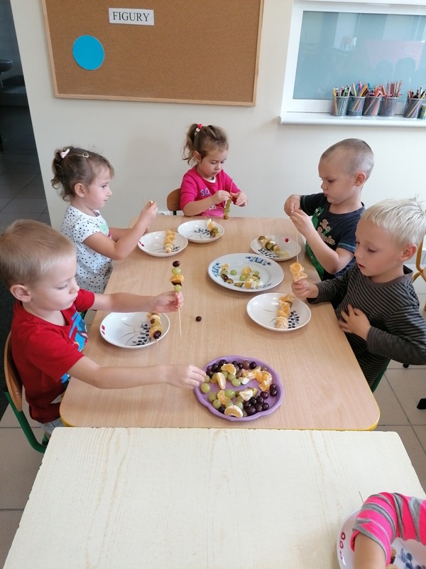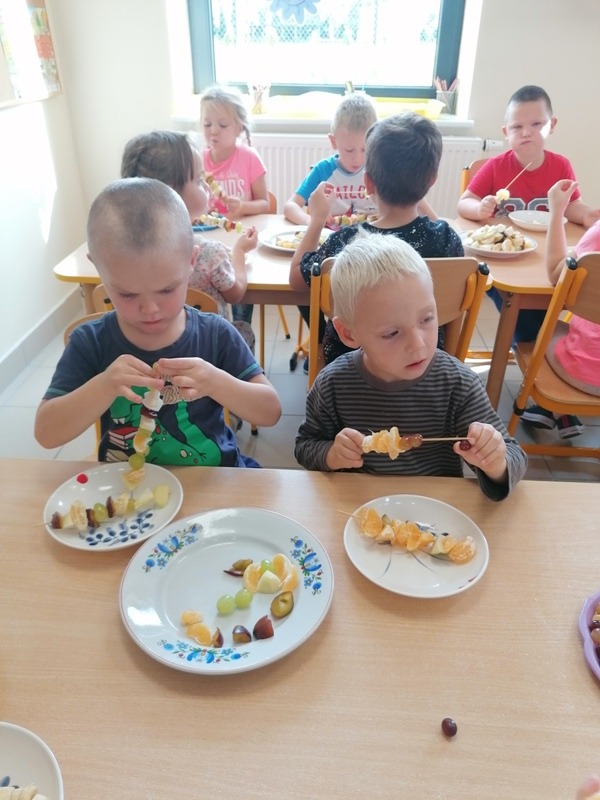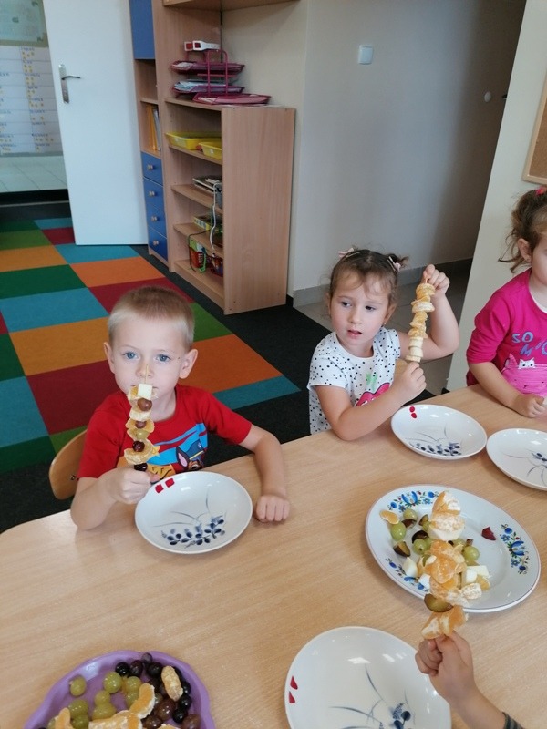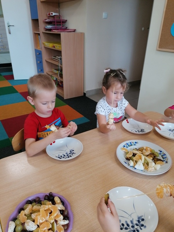 Podczas zajęć na temat owoców, bawiliśmy się w rozpoznawanie ich po smaku i dotyku oraz wykonaliśmy kolorowe, smaczne szaszłyki. Każdy przedszkolak swojego własnoręcznie wykonanego szaszłyka zjadł ze smakiem.