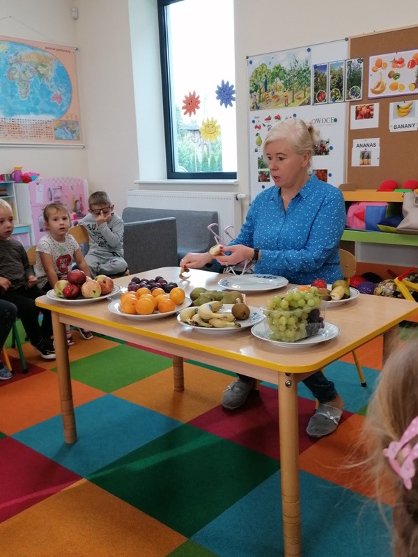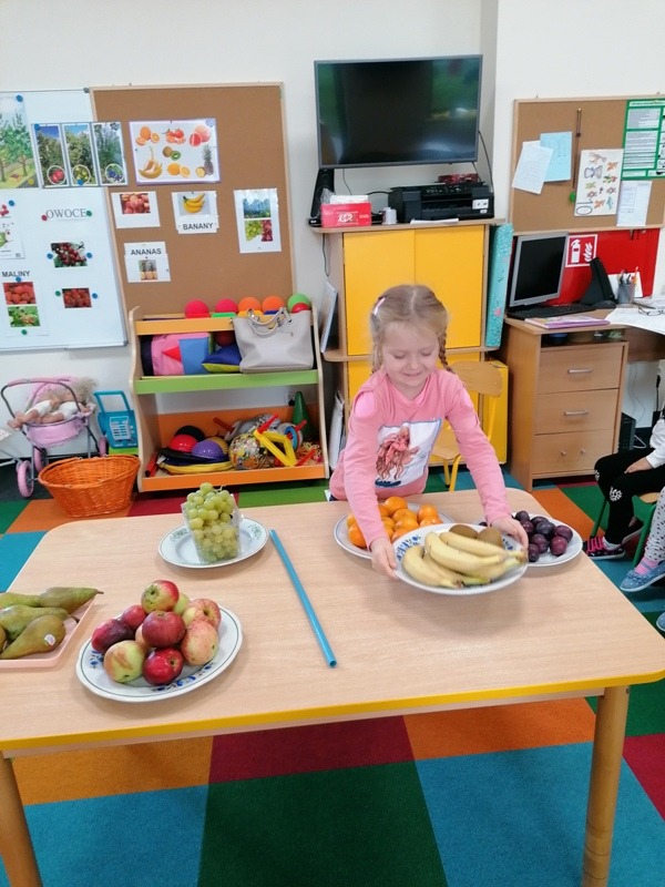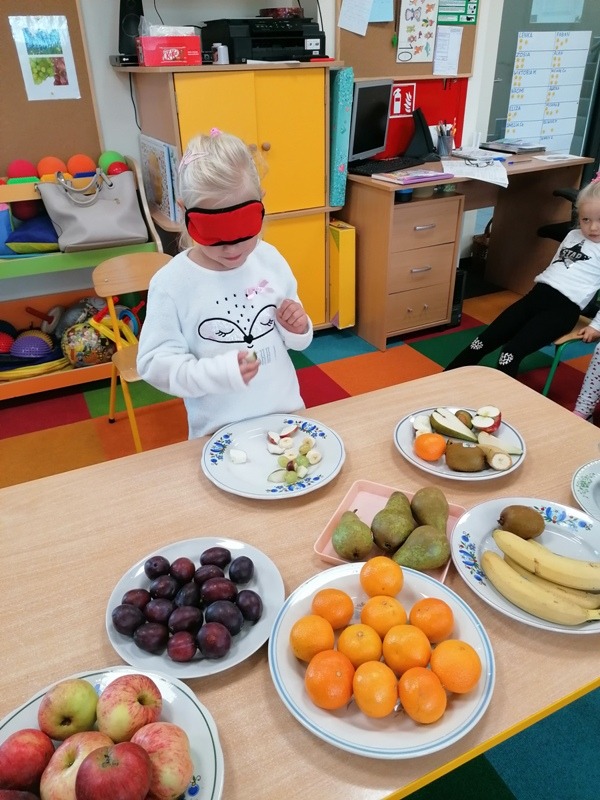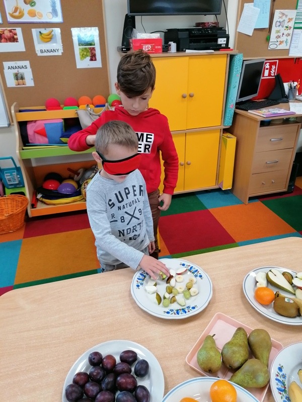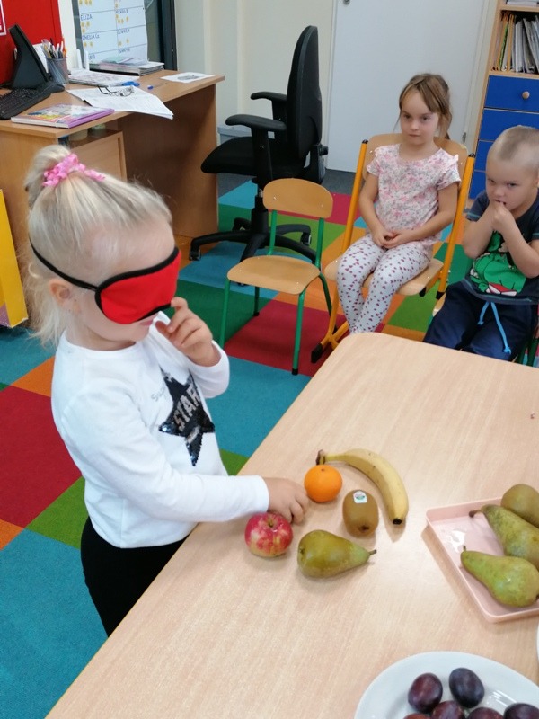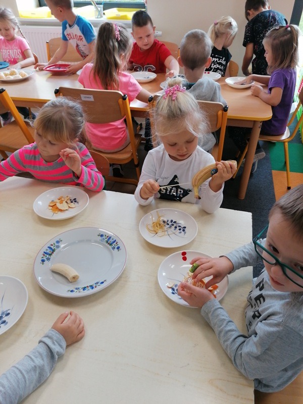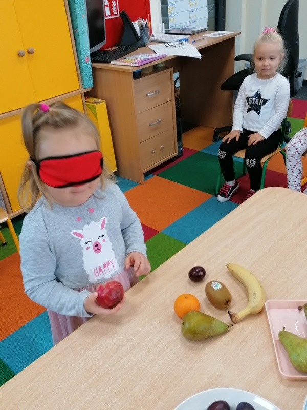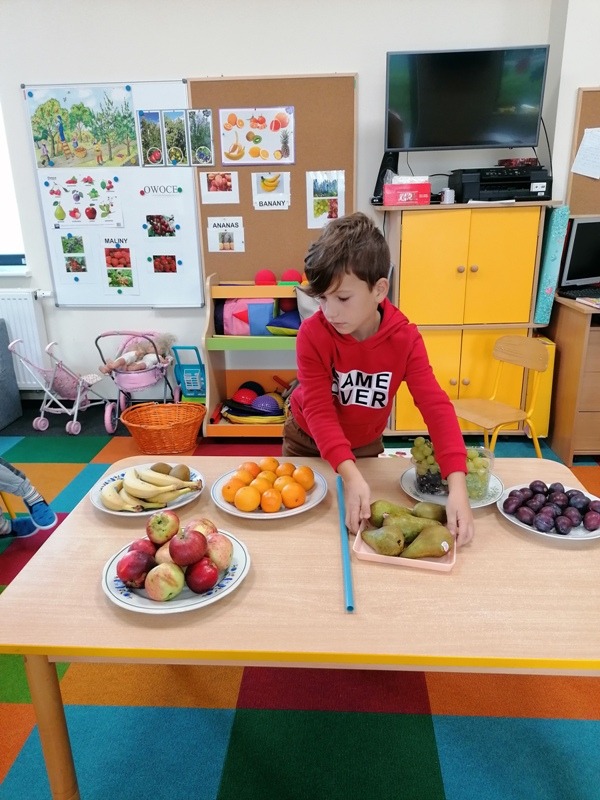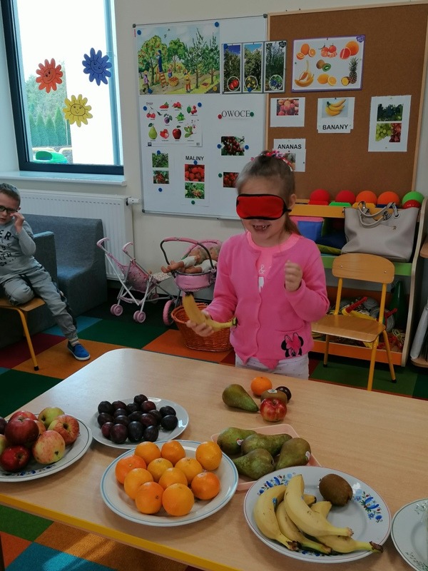Podczas zajęć na temat owoców, bawiliśmy się w rozpoznawanie ich po smaku i dotyku oraz wykonaliśmy kolorowe, smaczne szaszłyki. Każdy przedszkolak swojego własnoręcznie wykonanego szaszłyka zjadł ze smakiem.