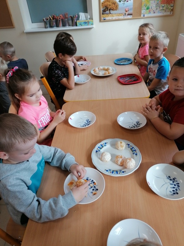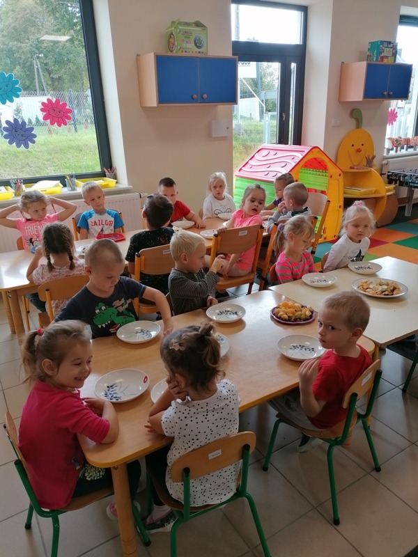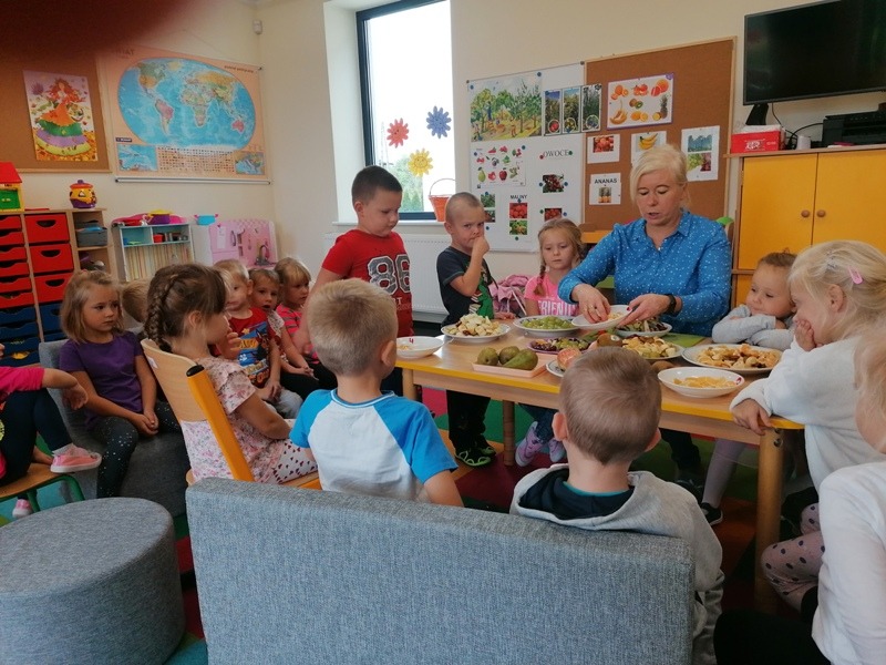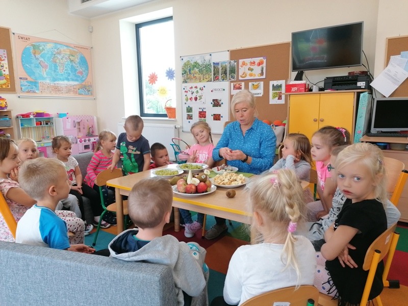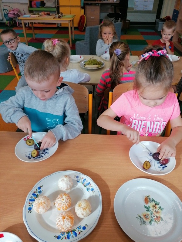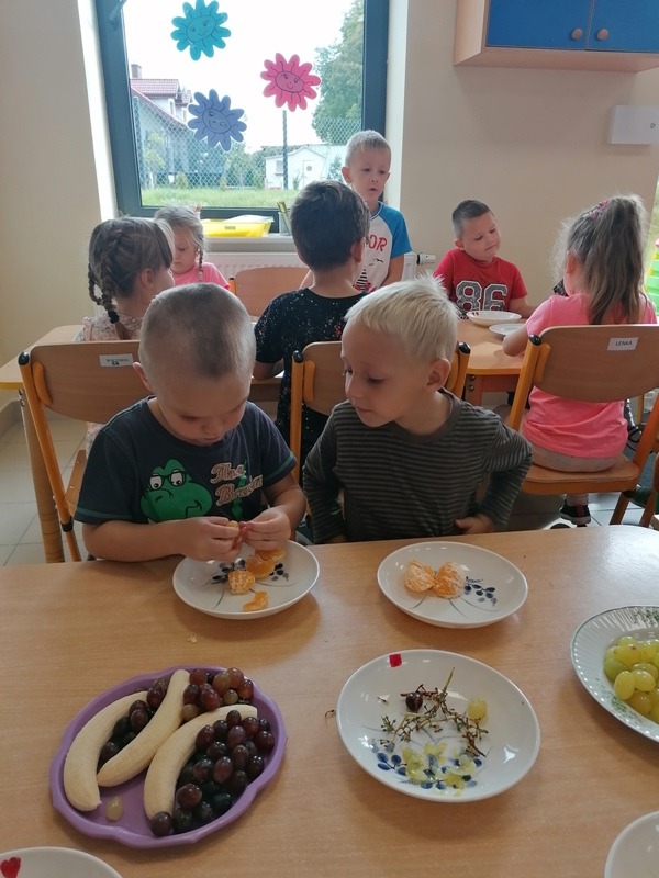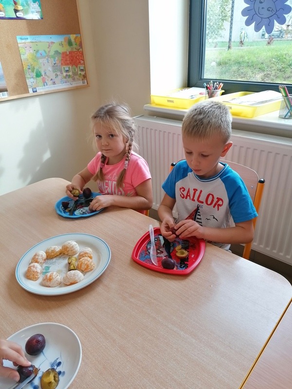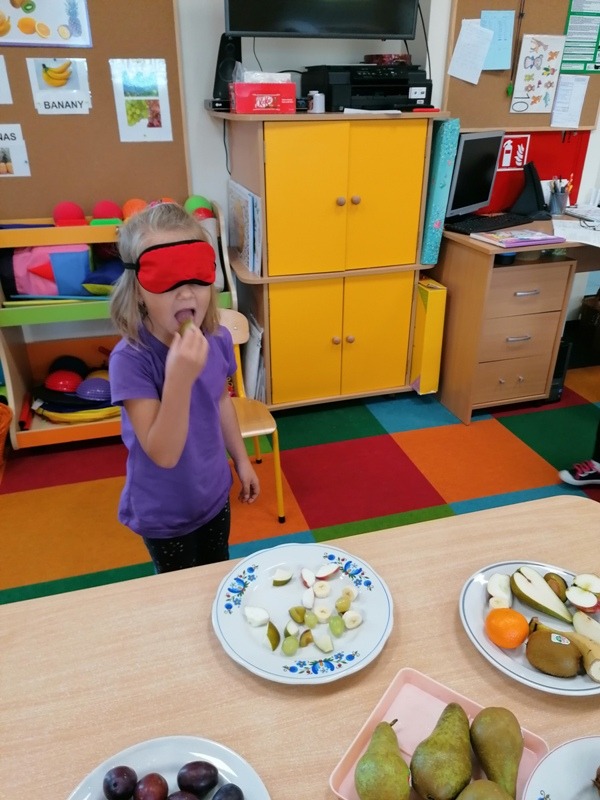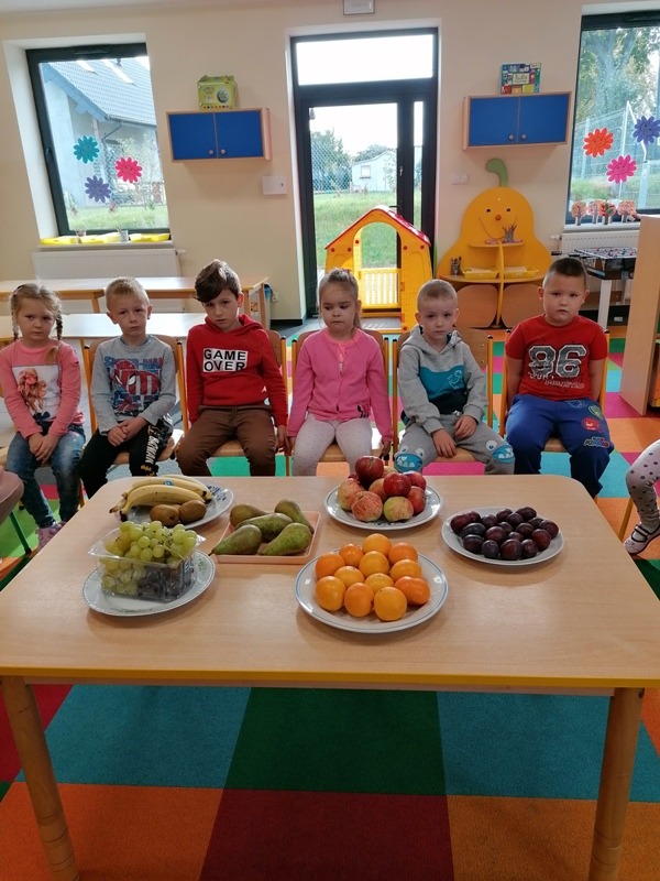 Podczas zajęć na temat owoców, bawiliśmy się w rozpoznawanie ich po smaku i dotyku oraz wykonaliśmy kolorowe, smaczne szaszłyki. Każdy przedszkolak swojego własnoręcznie wykonanego szaszłyka zjadł ze smakiem.