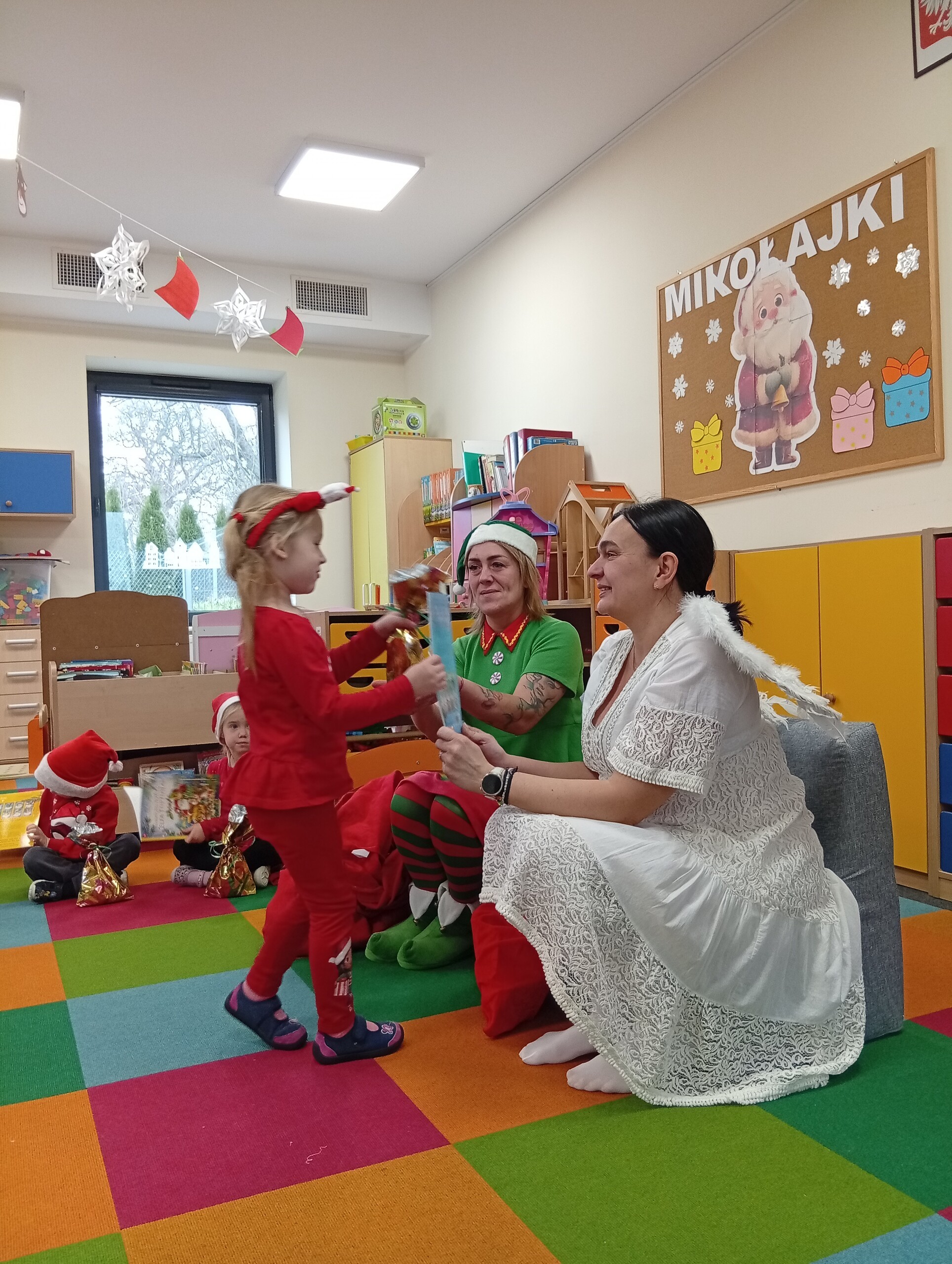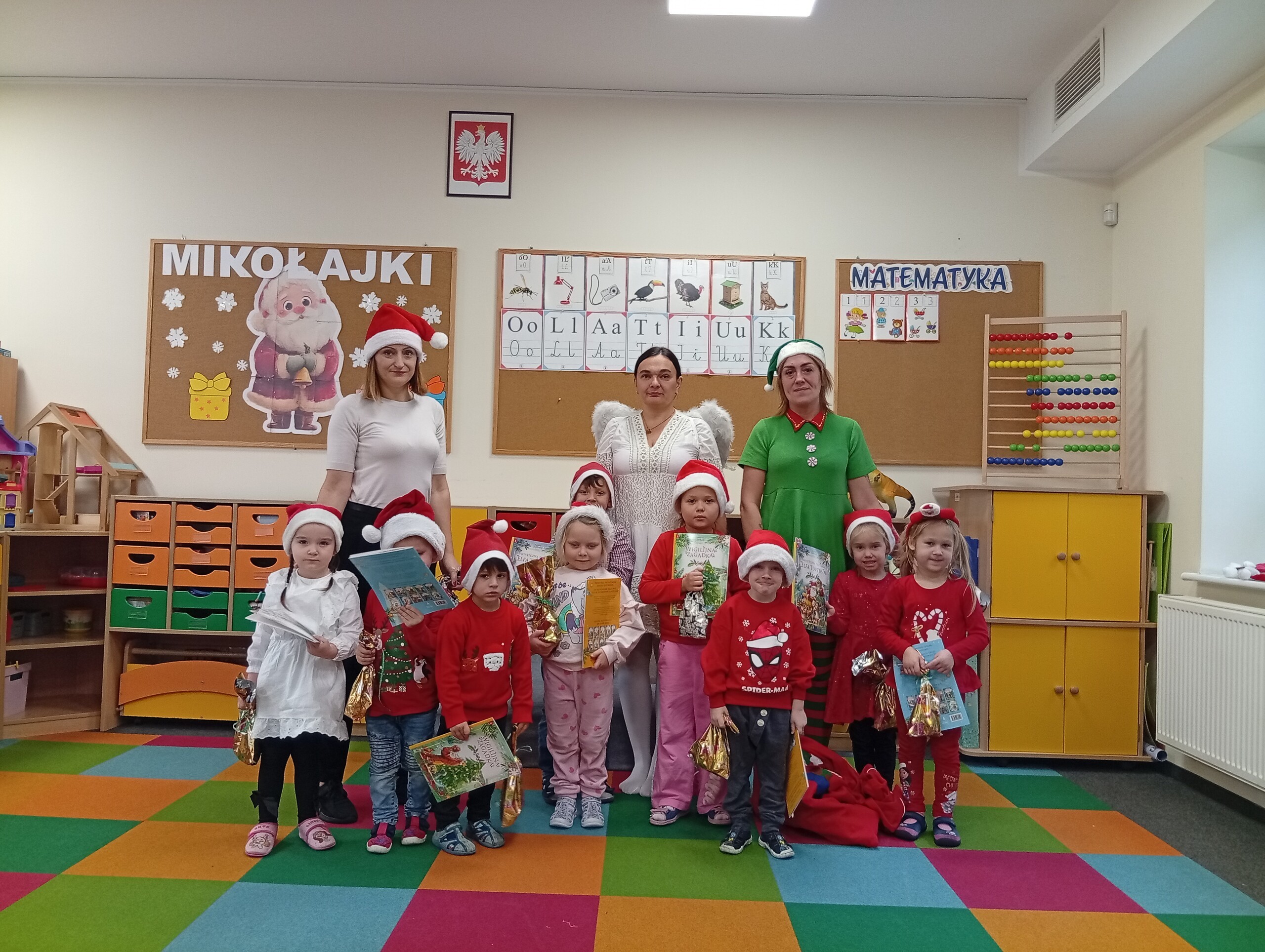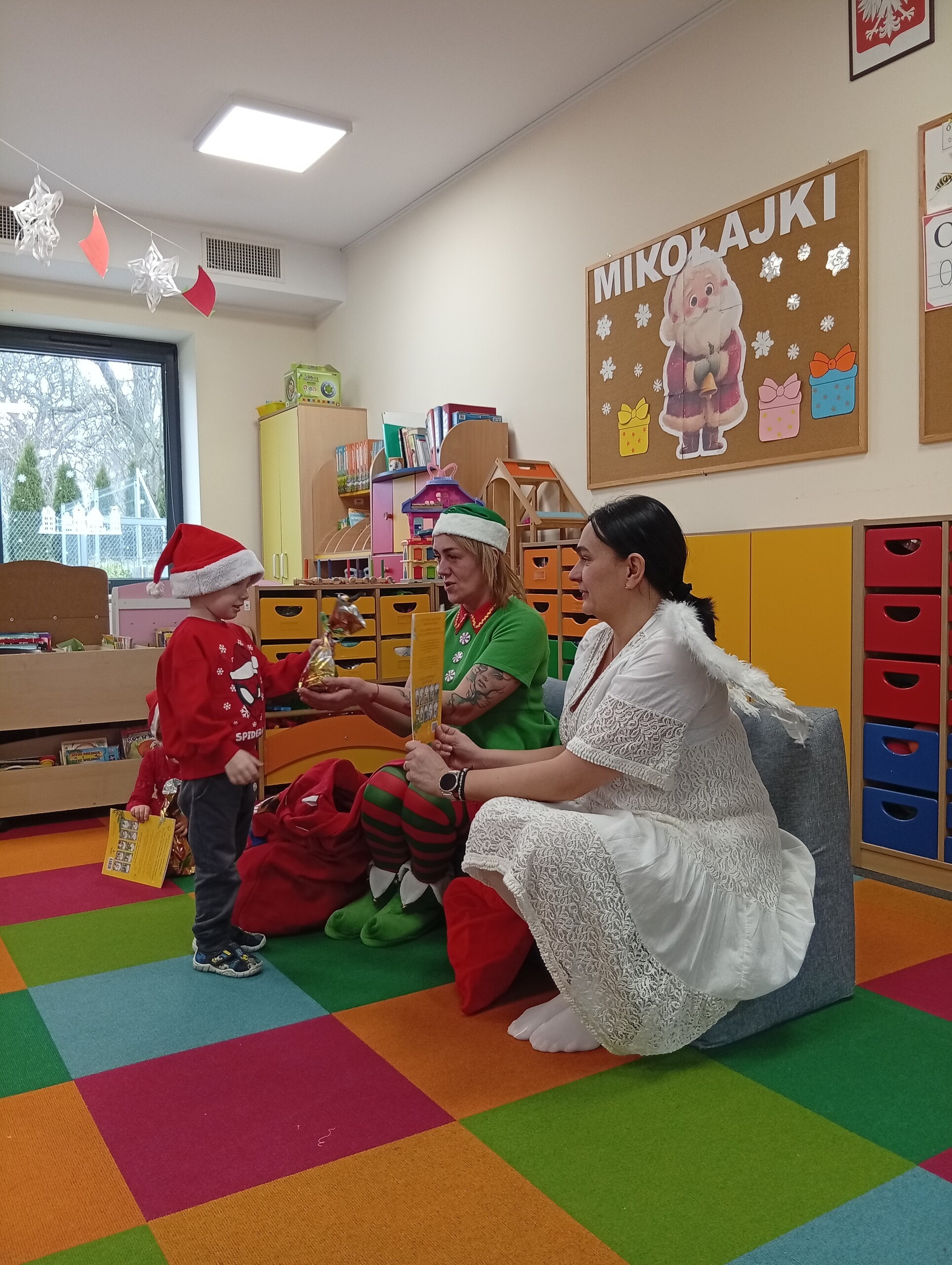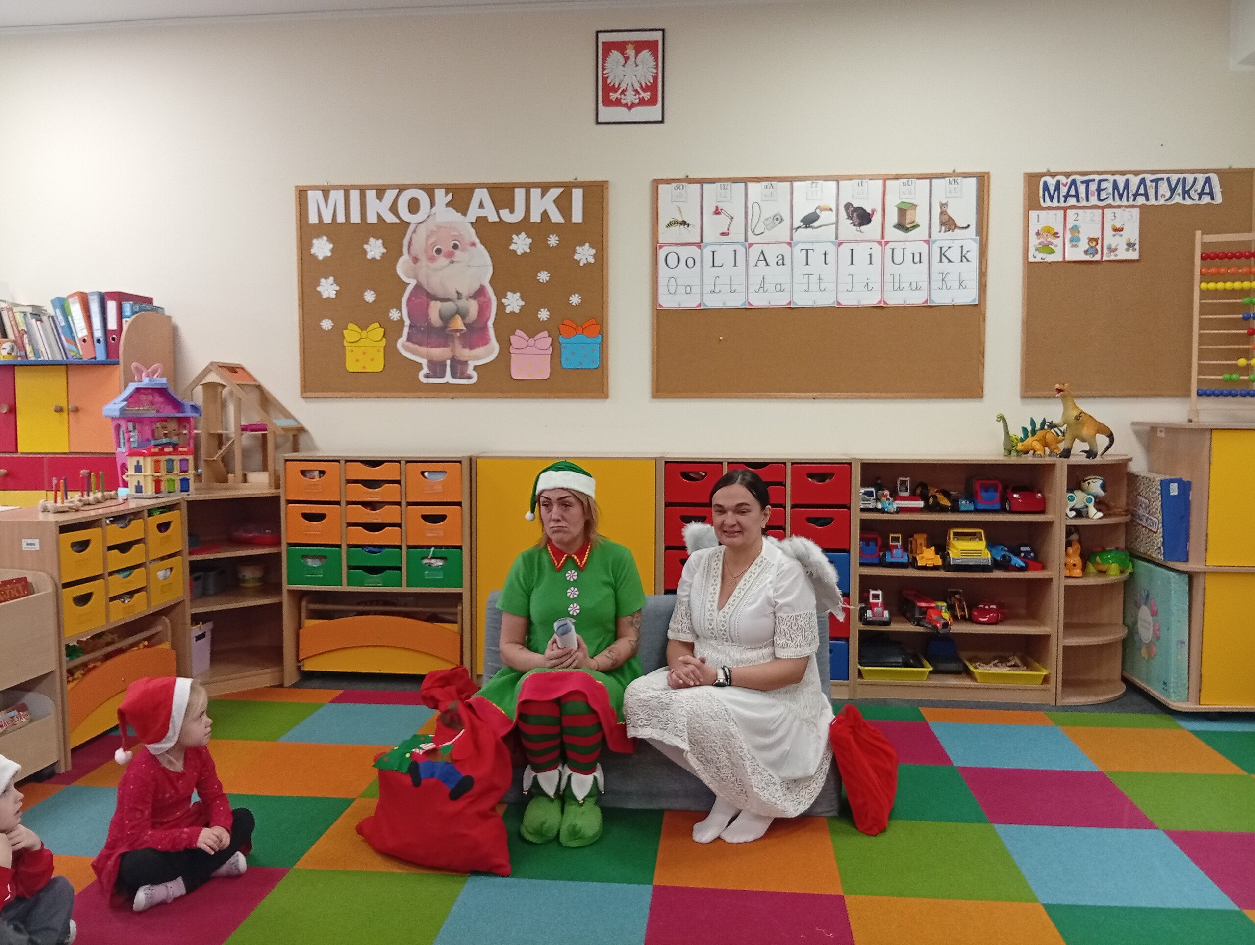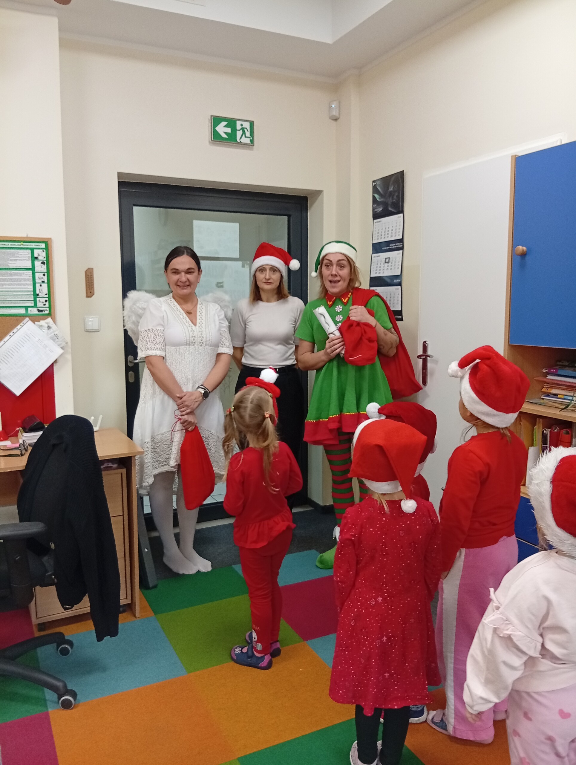 Dziś z okazji zbliżających się Mikołajek, w przedszkolu odwiedzili nas pomocnicy Świętego Mikołaja: Elf i Aniołek. Przyjechali z listem od niego oraz z workiem pełnym prezentów. Ta wizyta sprawiła dzieciom ogromną radość więc w podziękowaniu, przedszkolaki zaśpiewały naszym gościom mikołajkową piosenkę.