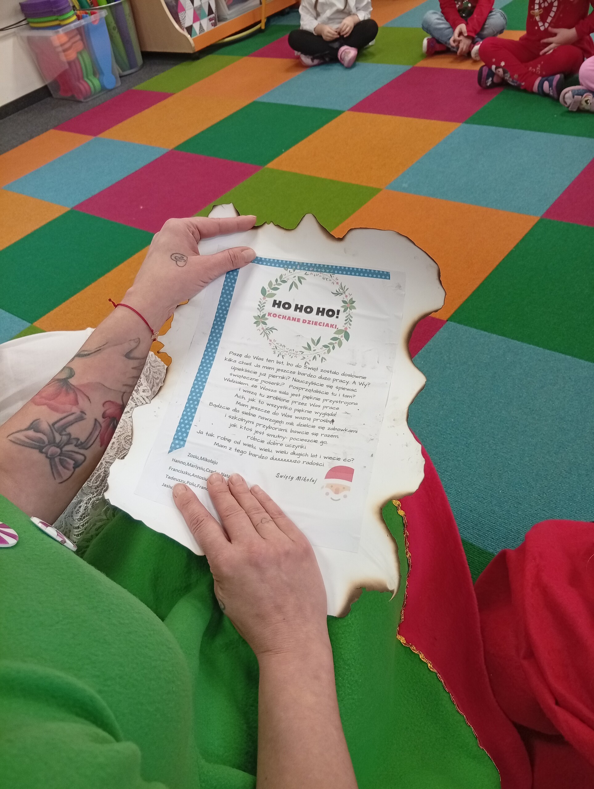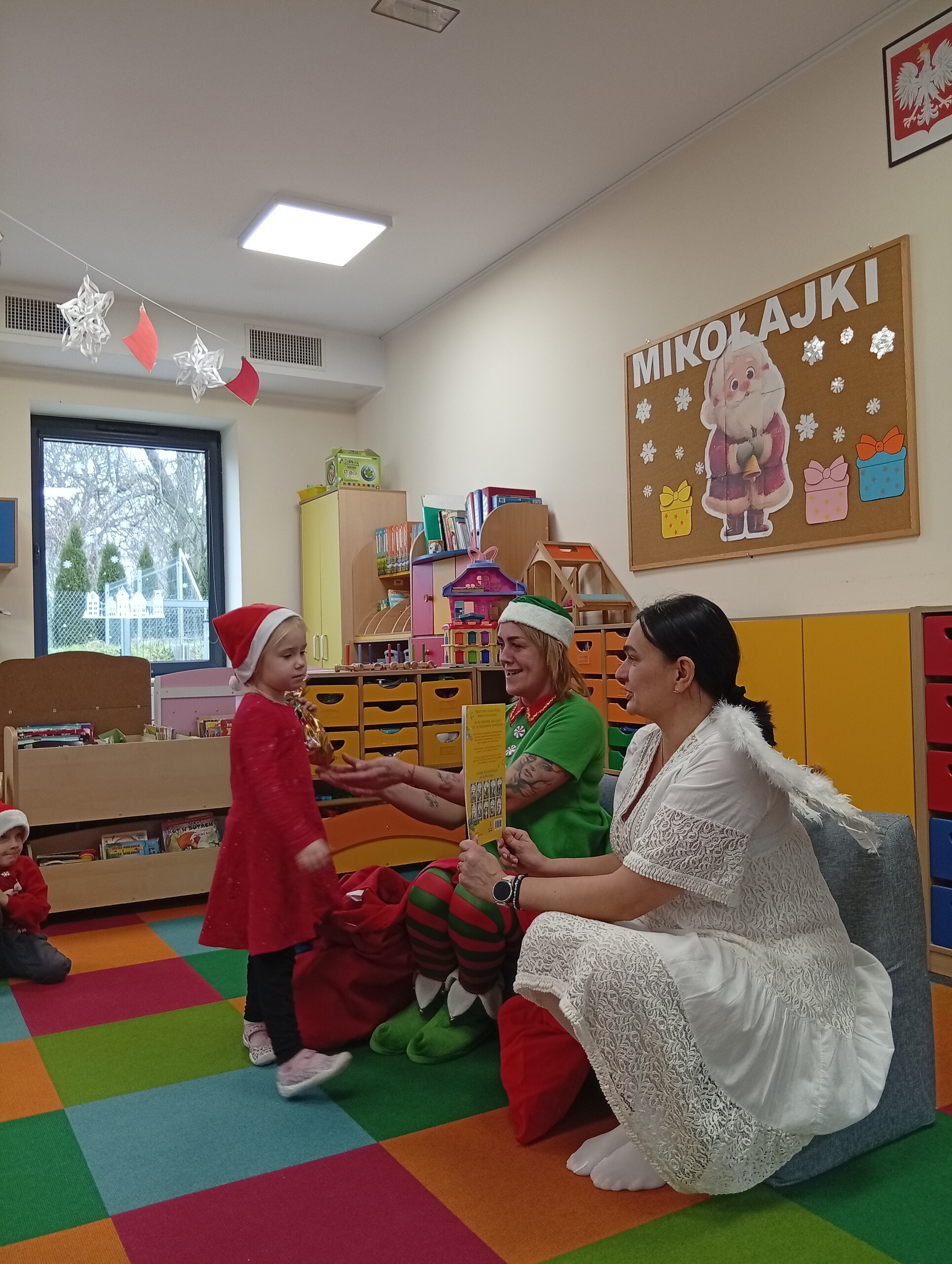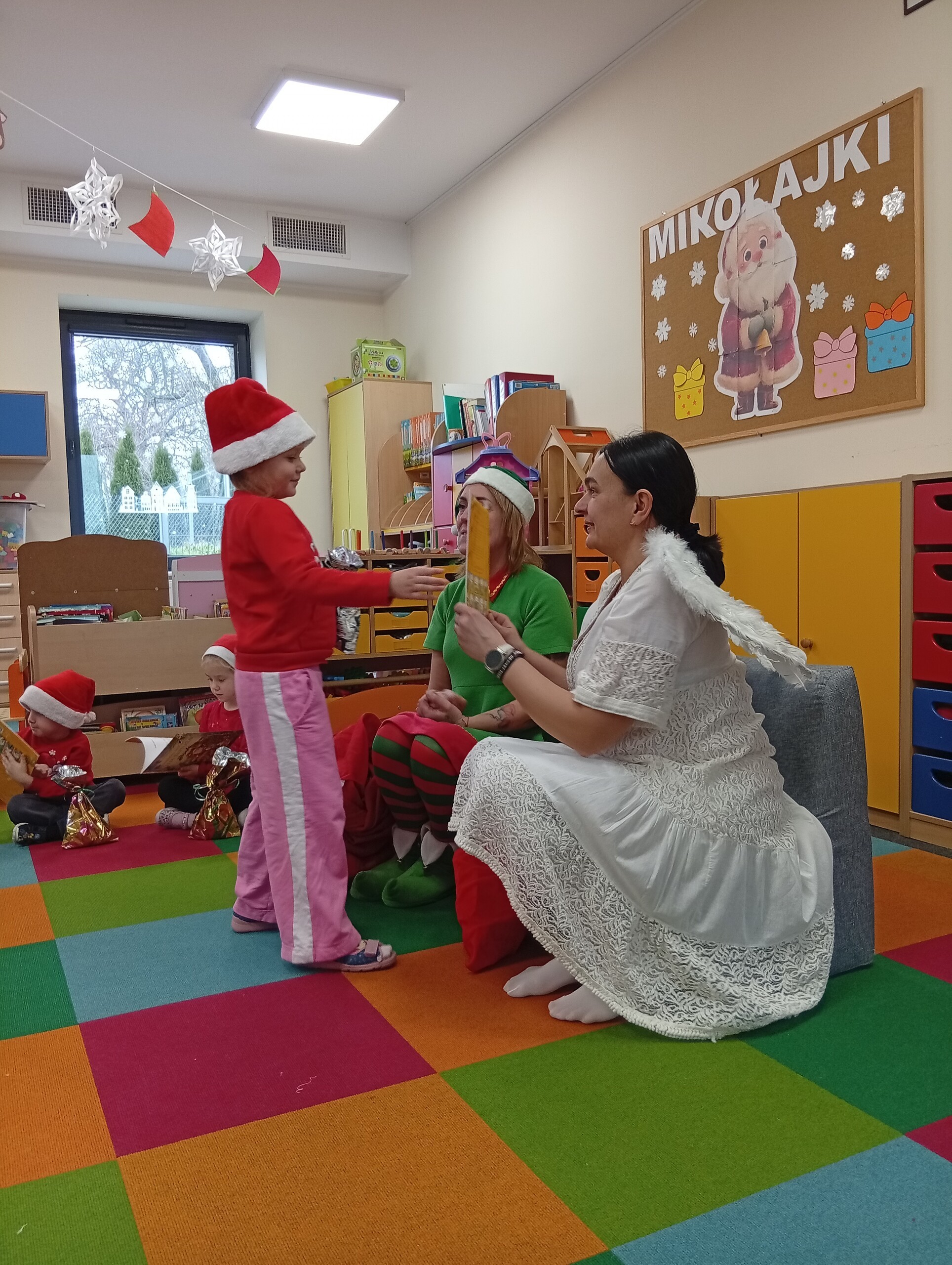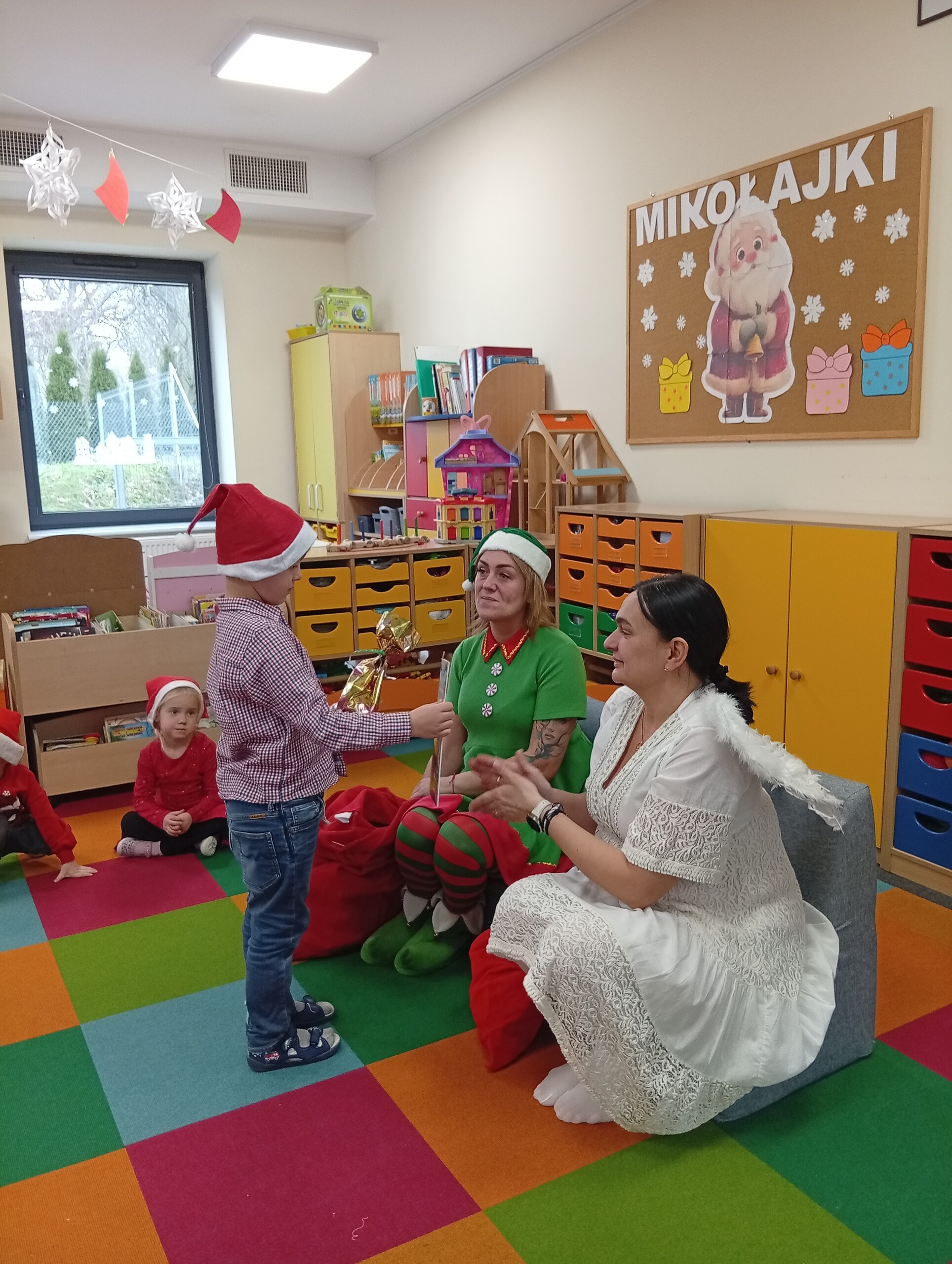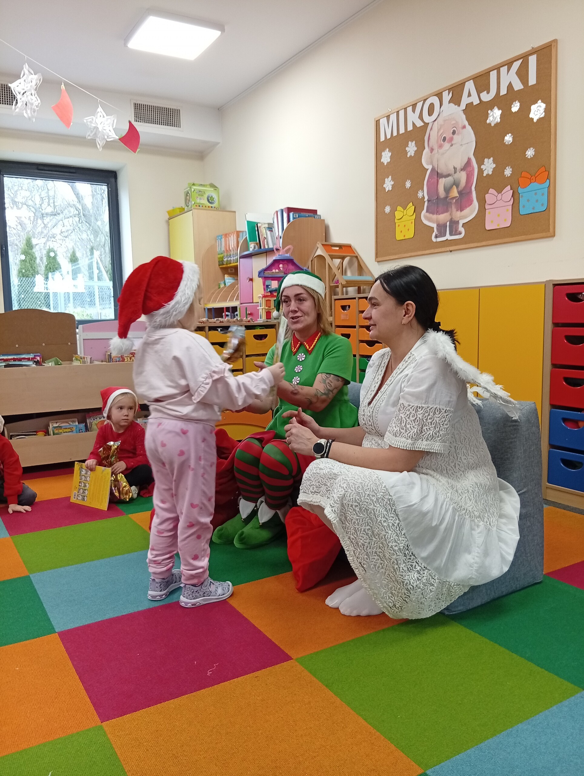 Dziś z okazji zbliżających się Mikołajek, w przedszkolu odwiedzili nas pomocnicy Świętego Mikołaja: Elf i Aniołek. Przyjechali z listem od niego oraz z workiem pełnym prezentów. Ta wizyta sprawiła dzieciom ogromną radość więc w podziękowaniu, przedszkolaki zaśpiewały naszym gościom mikołajkową piosenkę.