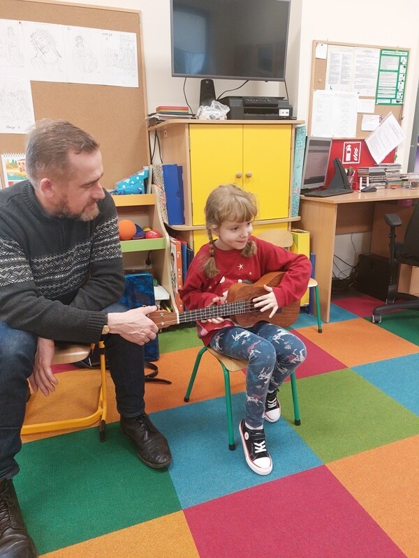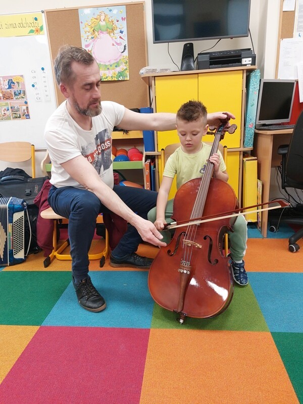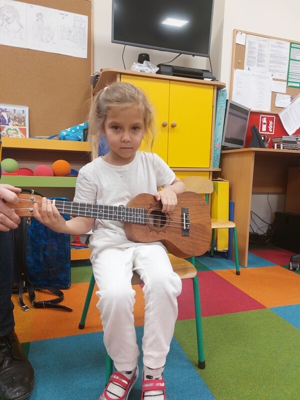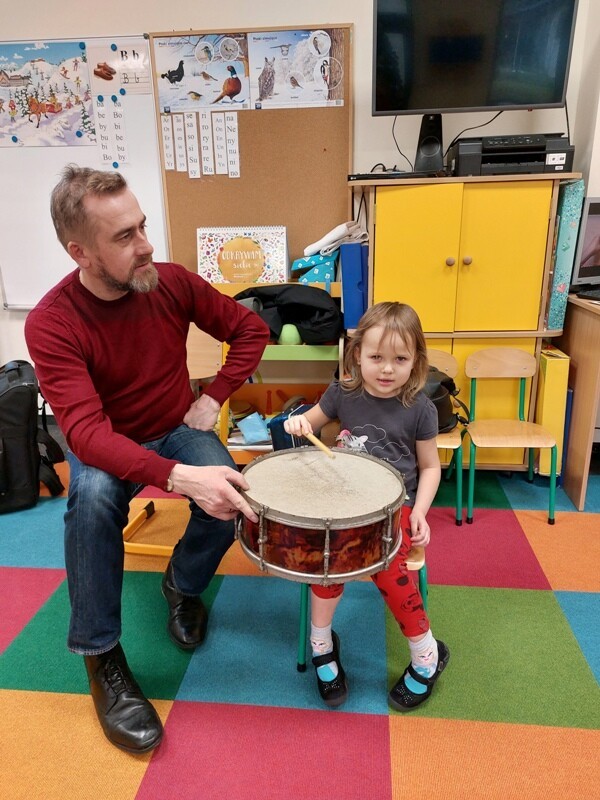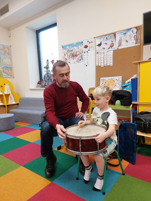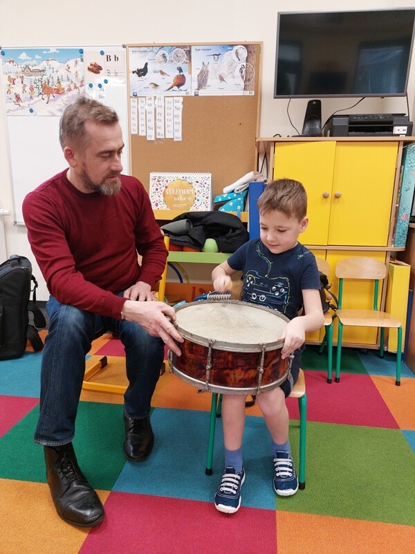 Na zajęcia z rytmiki Pan Andrzej często przynosi różne instrumenty. Przedszkolaki mają możliwość obejrzeć je oraz spróbować zagrać dowolną melodię. Takie doświadczenie sprawia dzieciom wiele radości oraz rozwija ich umiejętności muzyczne.