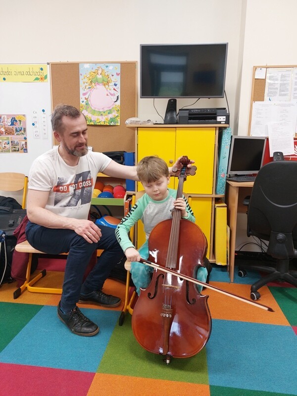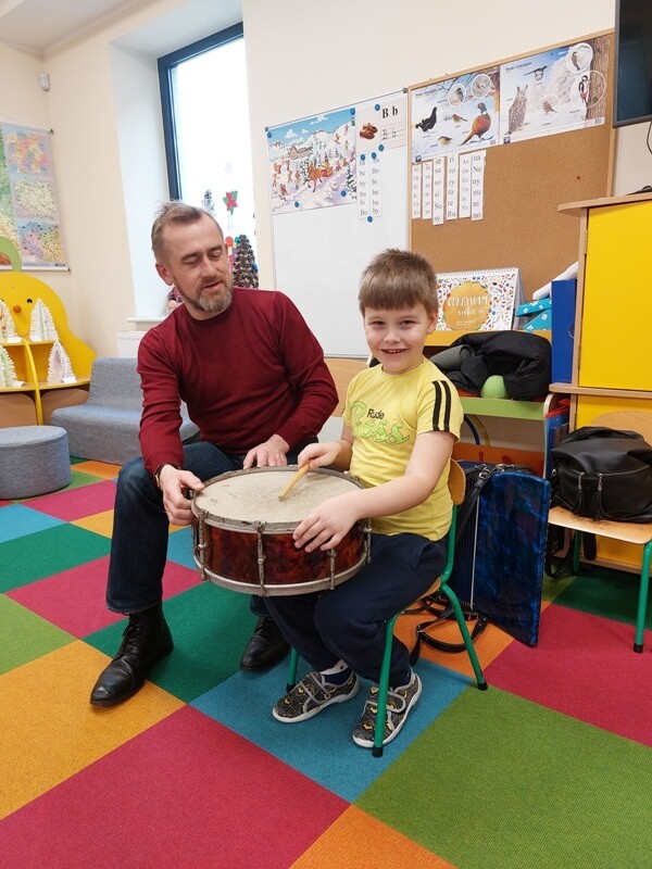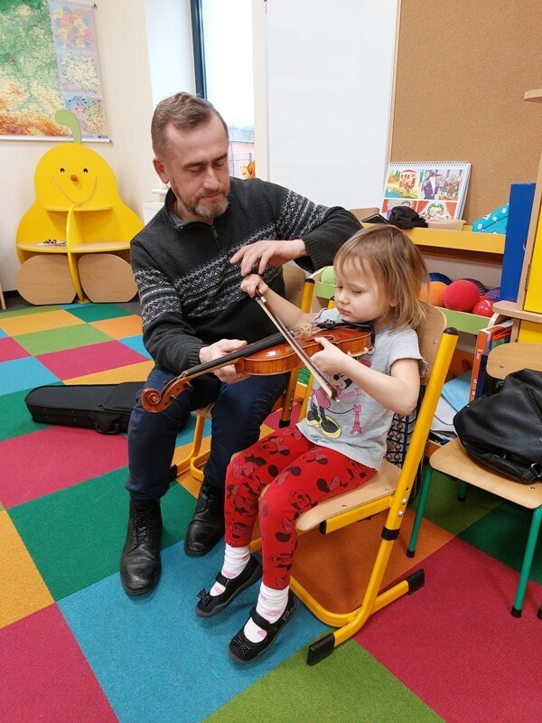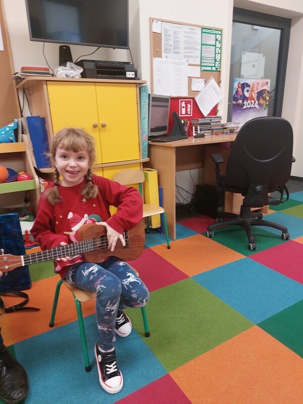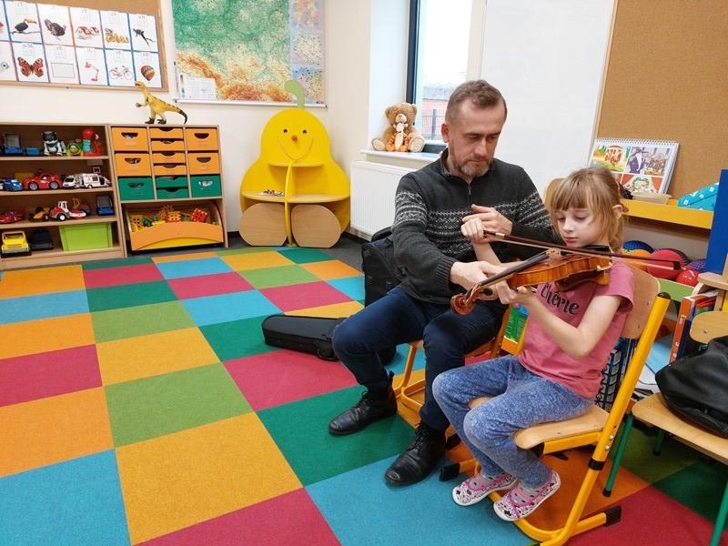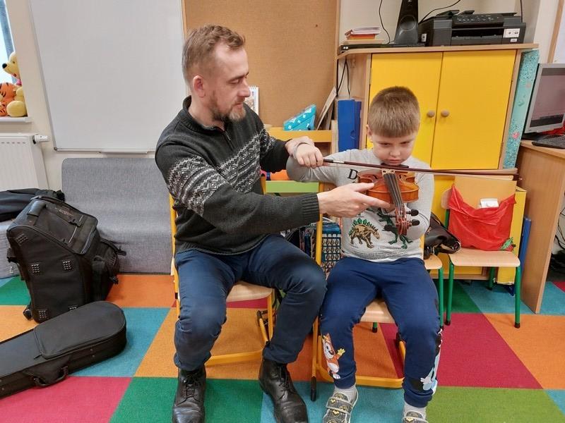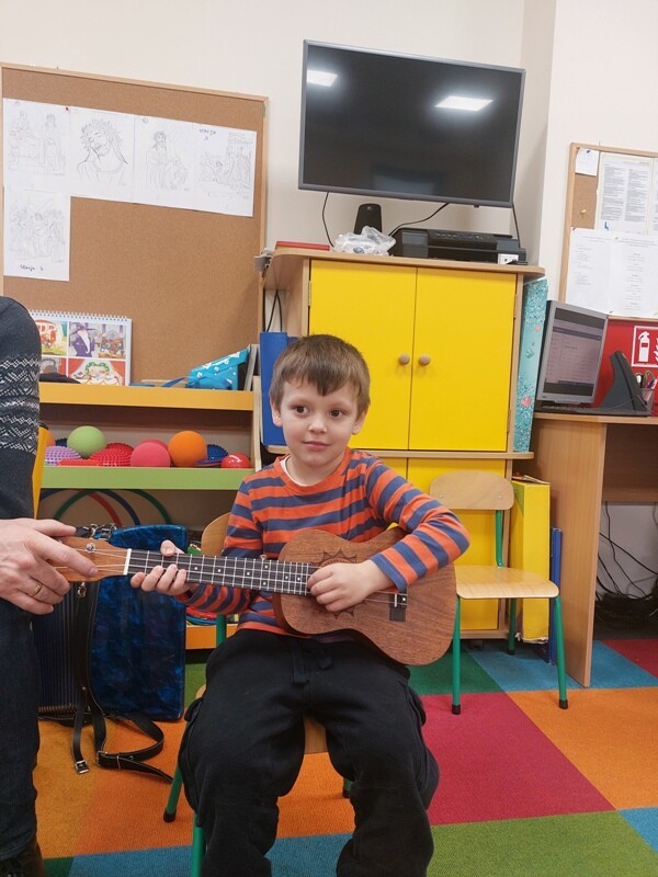 Na zajęcia z rytmiki Pan Andrzej często przynosi różne instrumenty. Przedszkolaki mają możliwość obejrzeć je oraz spróbować zagrać dowolną melodię. Takie doświadczenie sprawia dzieciom wiele radości oraz rozwija ich umiejętności muzyczne.