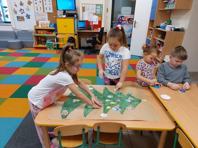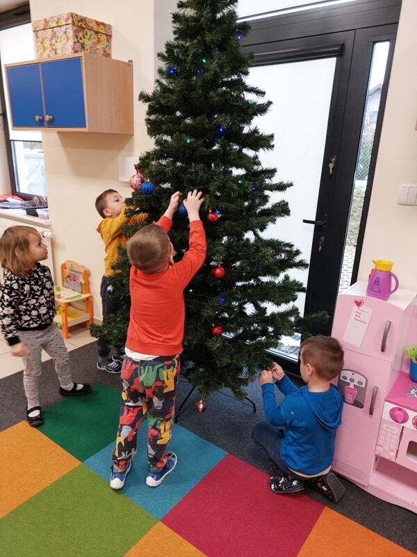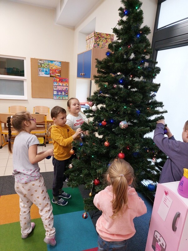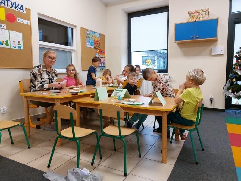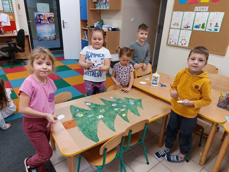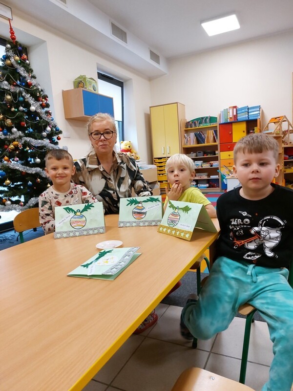 W przedszkolu rozpoczęlismy przygotowania do świąt Bożego Narodzenia. Dzieci pomalowały farbami kontur dużej choinki, którą ozdobiły własnoręcznie wykonanymi bombkami. Wykonały kartki świąteczne dla rodziców oraz wystroiły przedszkolną choinkę. Do pomocy w wykonaniu kartek świątecznych zaangażowała się również Pani Sara - blibliotekarka z Janowic, za co serdecznie dziękujemy.