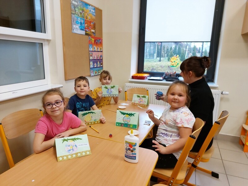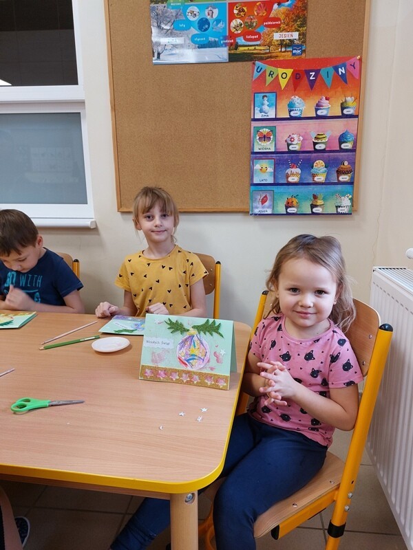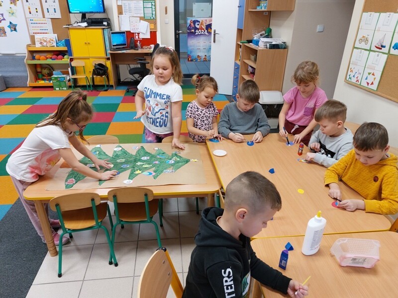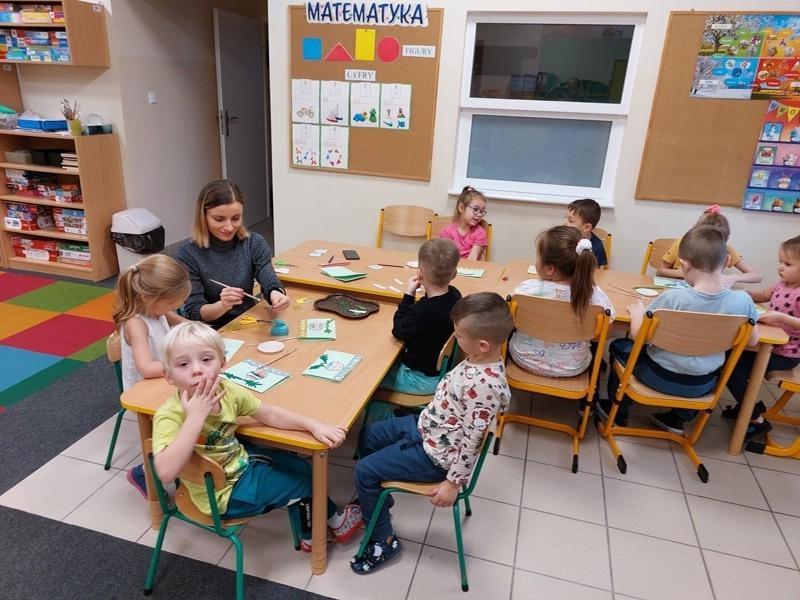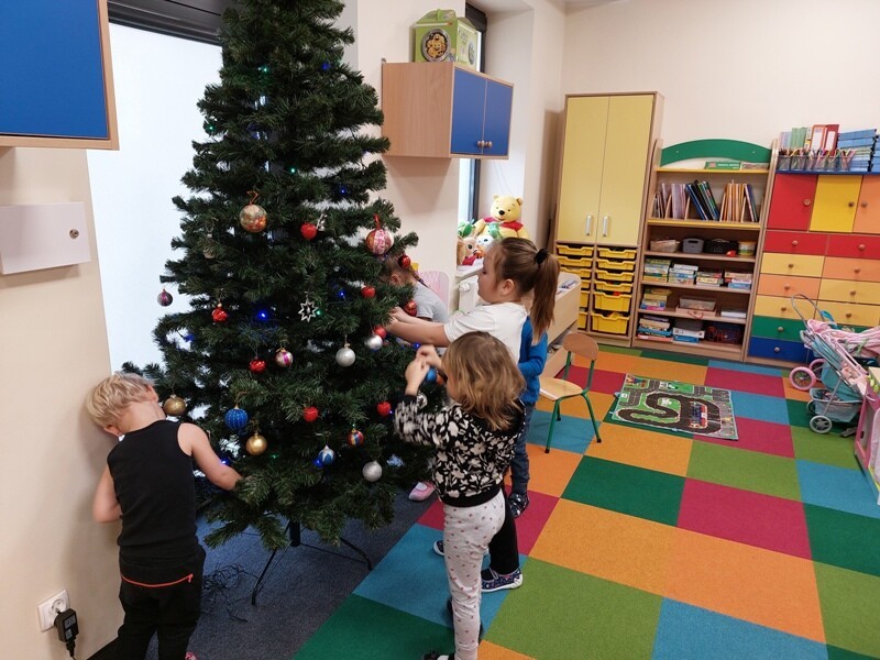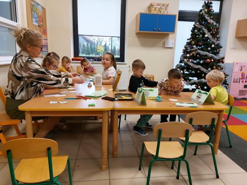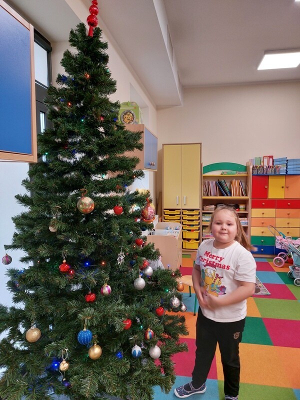 W przedszkolu rozpoczęlismy przygotowania do świąt Bożego Narodzenia. Dzieci pomalowały farbami kontur dużej choinki, którą ozdobiły własnoręcznie wykonanymi bombkami. Wykonały kartki świąteczne dla rodziców oraz wystroiły przedszkolną choinkę. Do pomocy w wykonaniu kartek świątecznych zaangażowała się również Pani Sara - blibliotekarka z Janowic, za co serdecznie dziękujemy.