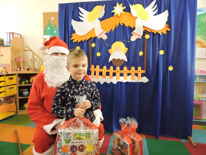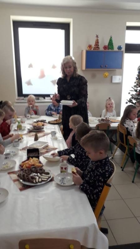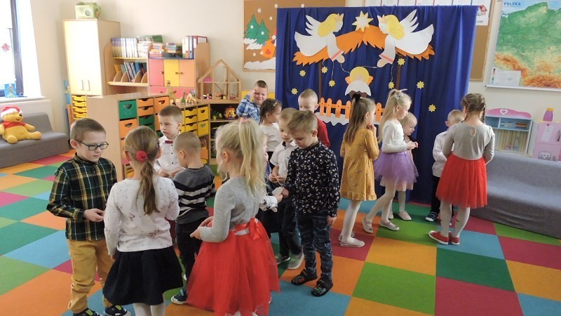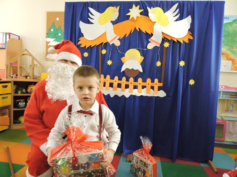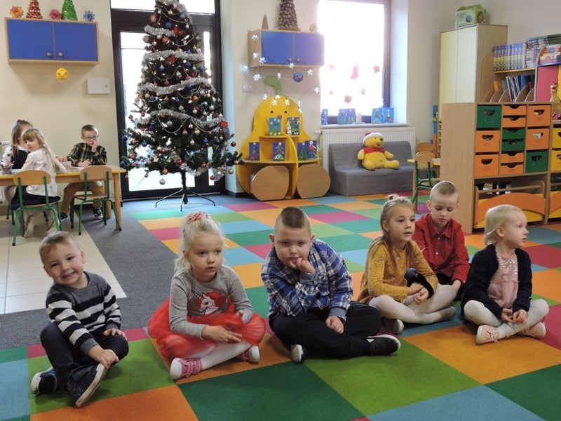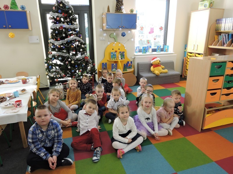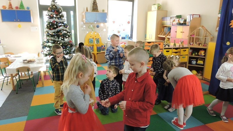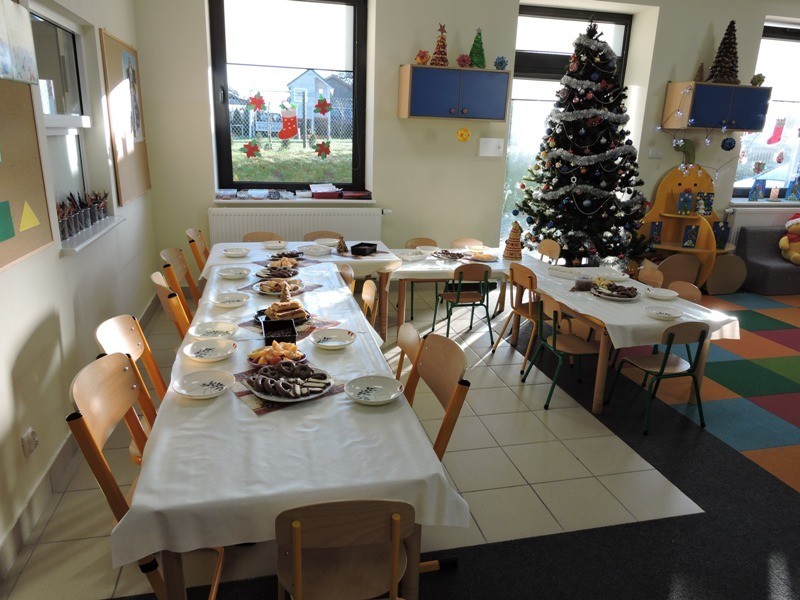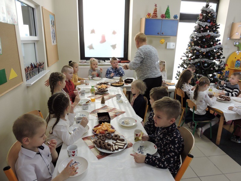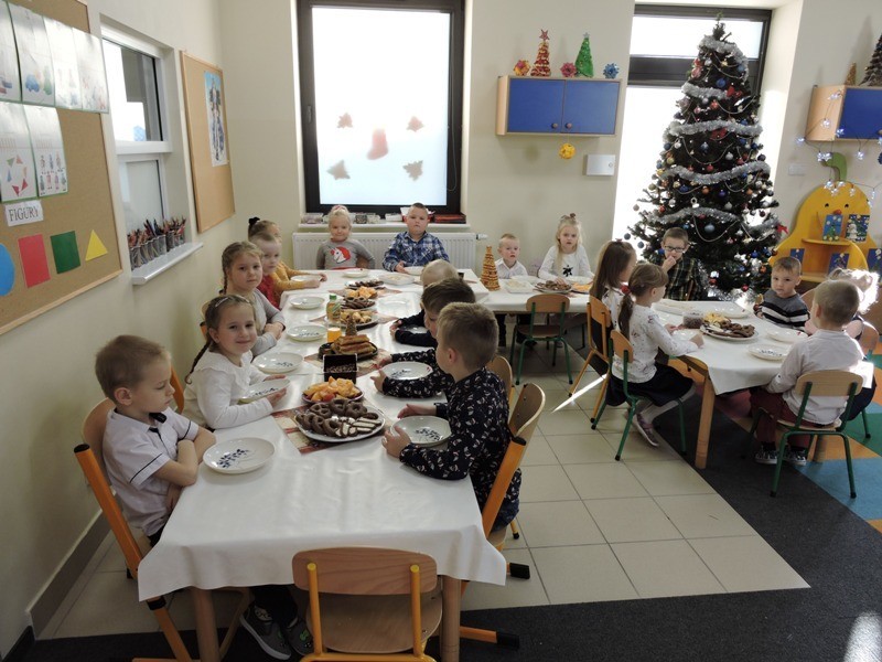 17 grudnia w naszym przedszkolu, przy współpracy z Panią Mirosławą Makles - bibliotekarką w Janowicach, odbyła się uroczysta Wigilia. Dzieci słuchały bożenarodzeniowych opowieści, rozmawiały o świątecznych tradycjach i zwyczajach, składały sobie życzenia i dzieliły się opłatkiem. Nie zabrakło też wspólnego kolędowania. Po życzeniach i śpiewie kolęd, przedszkolaki usiadły do odświętnie udekorownych stołów, na których nie brakowało tradycyjnych potraw związanych z Wigilią: pierogów, barszczu, pierniczków, pasztecików i pomarańczy. W tym roku przybył również do przedszkola Mikołaj, na którego dzieci z utęsknieniem czekały.