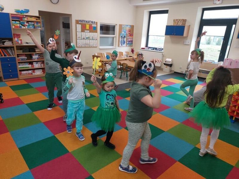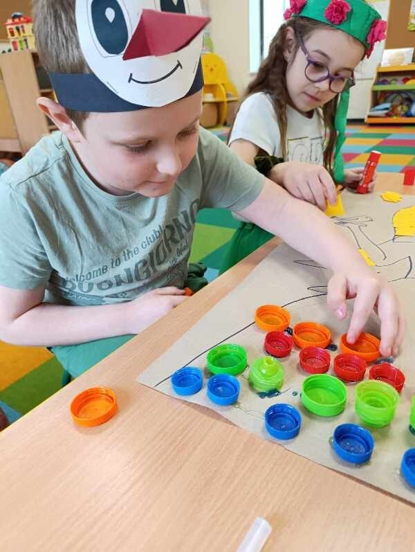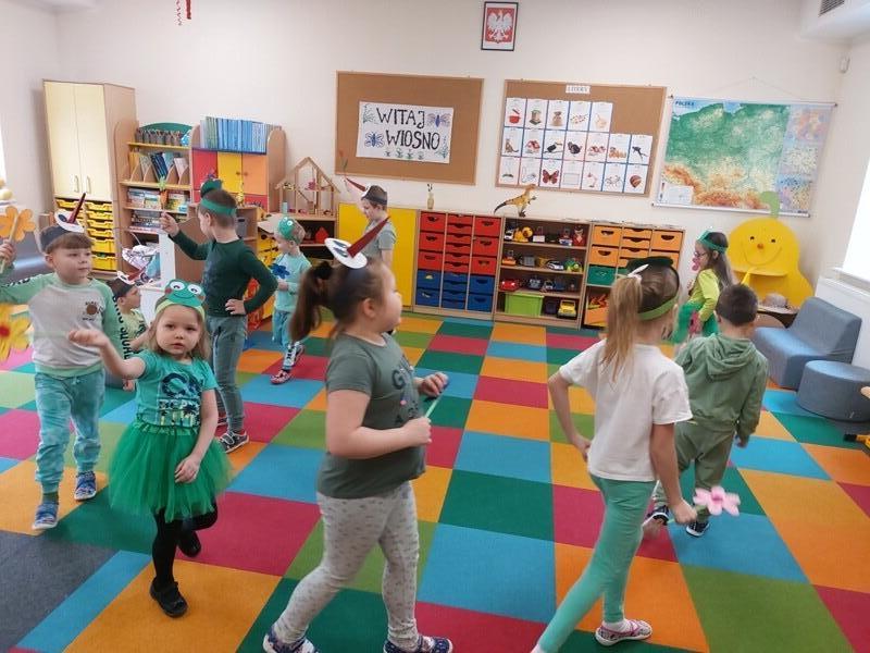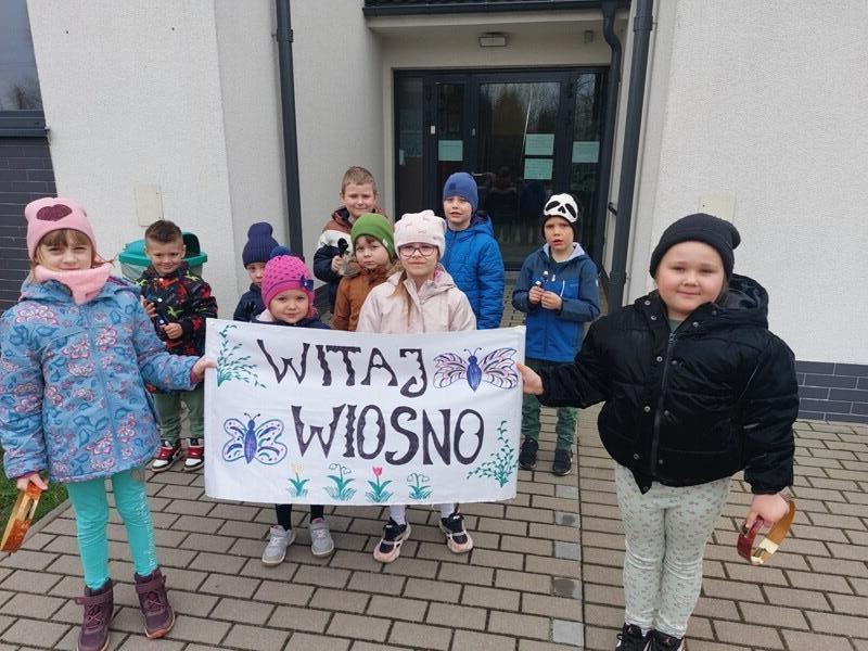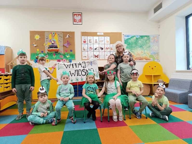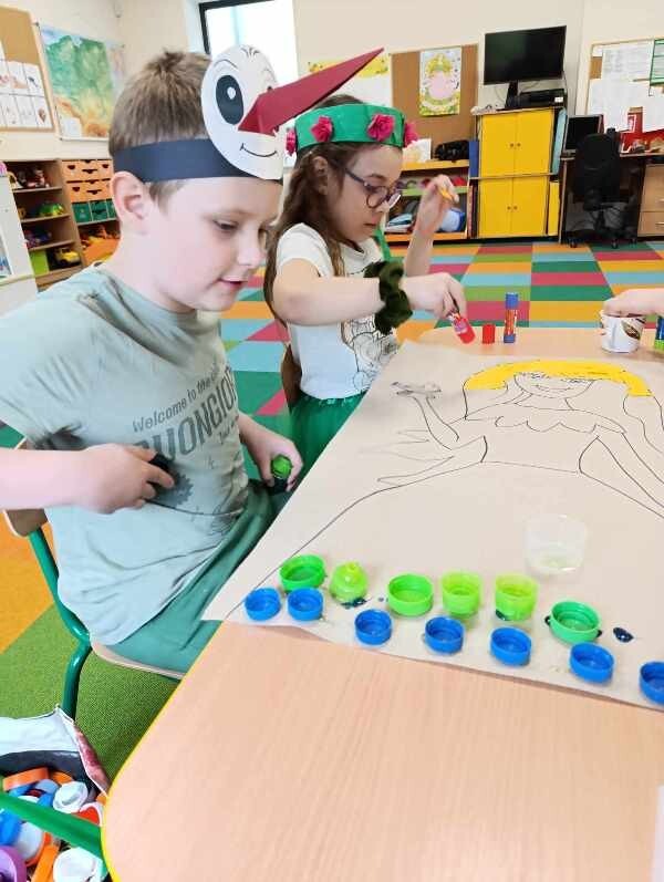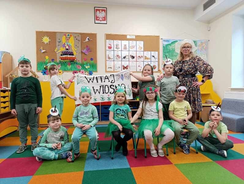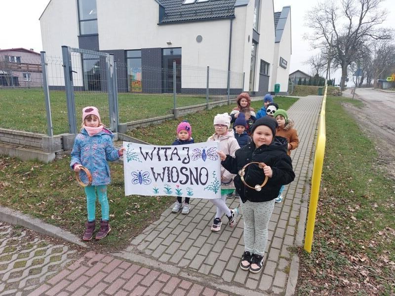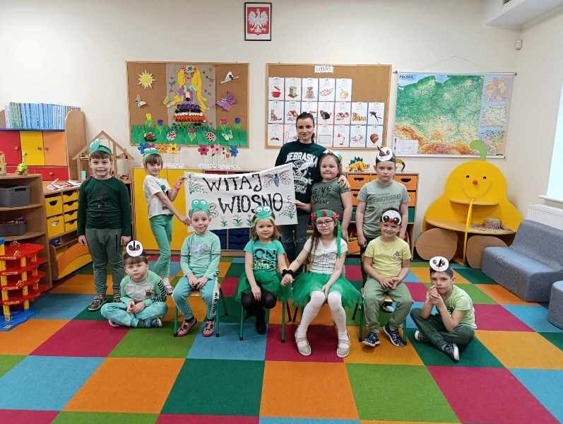 21 marca z radością powitaliśmy wiosnę. Przedszkolaki wzięły udział w wiosennym korowodzie z instrumentami, aby obwieścić mieszkańcom Janowic, że nadeszła Wiosna. Wykonaliśmy również wspólną dekorację dla Pani Wiosny, której sukienkę ozdobiliśmy z kolorowych kapsli. Dziękujemy Pani Sarze - bibliotekarce z Janowic za udział w obchodach Pierwszego Dnia Wiosny i pomoc w wykonaniu naszej wiosennej dekoracji .