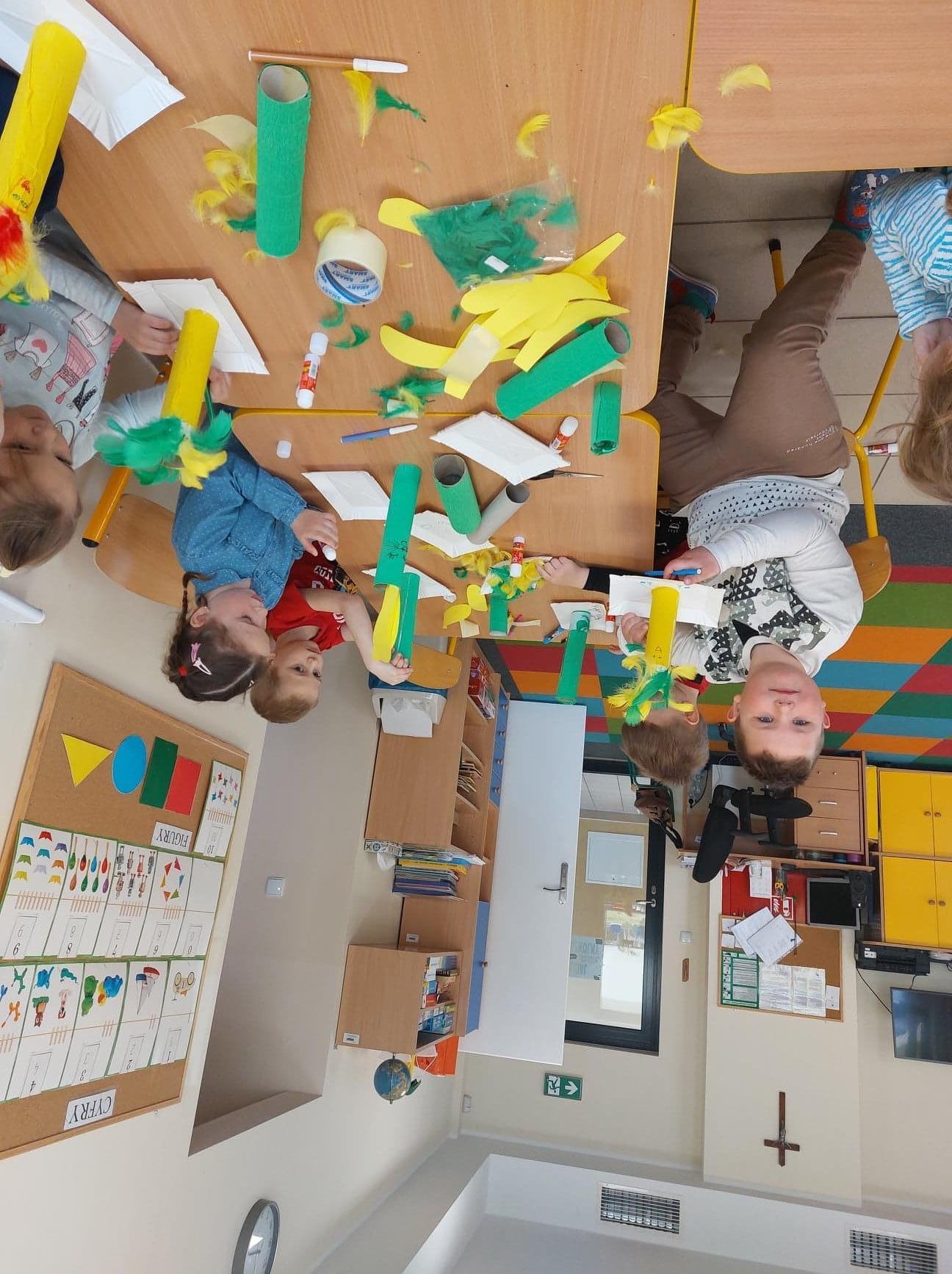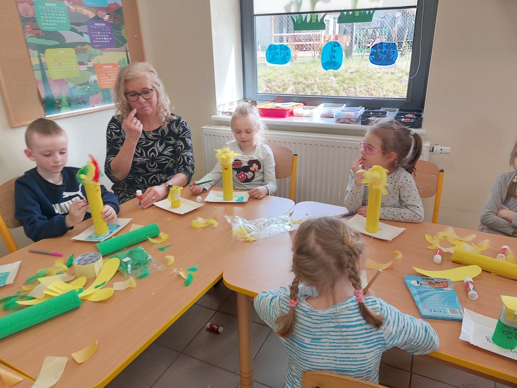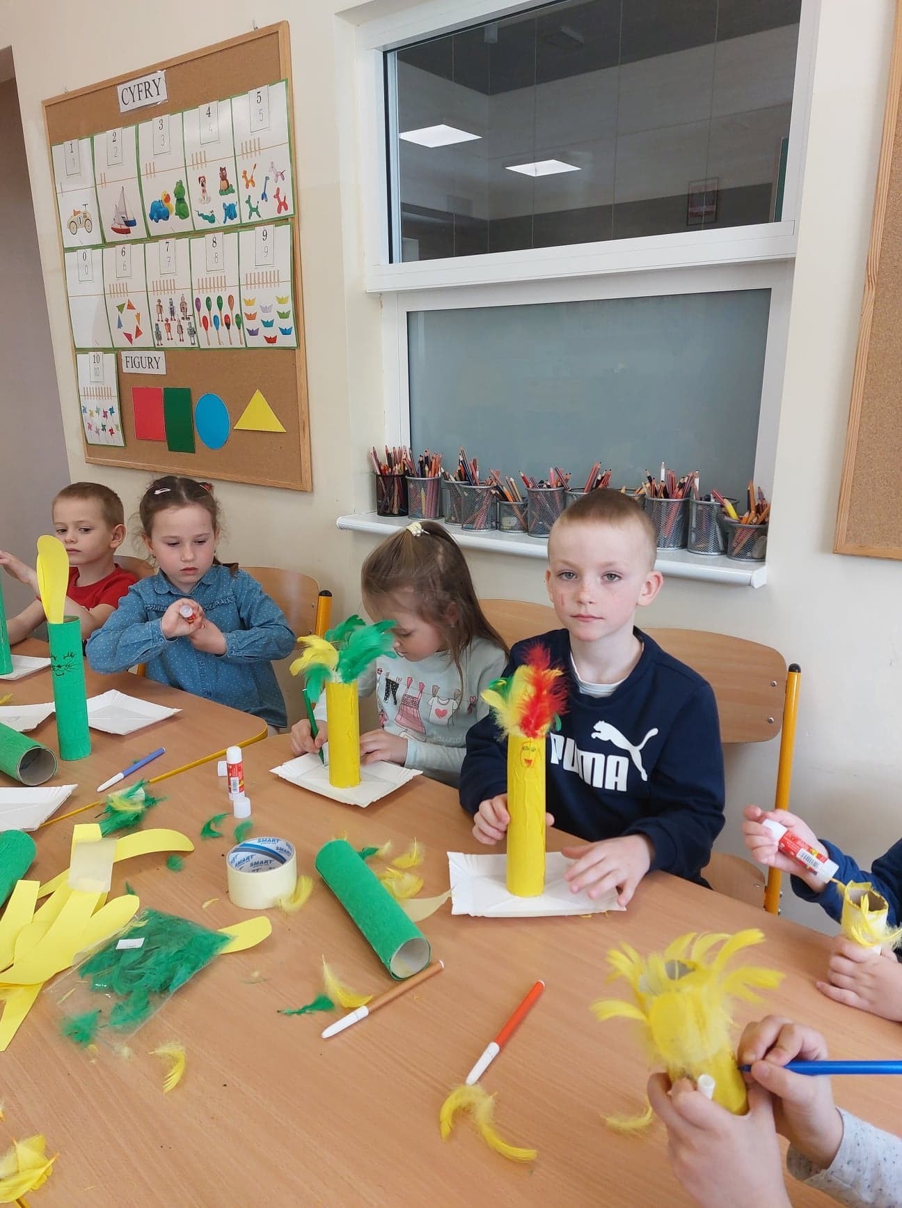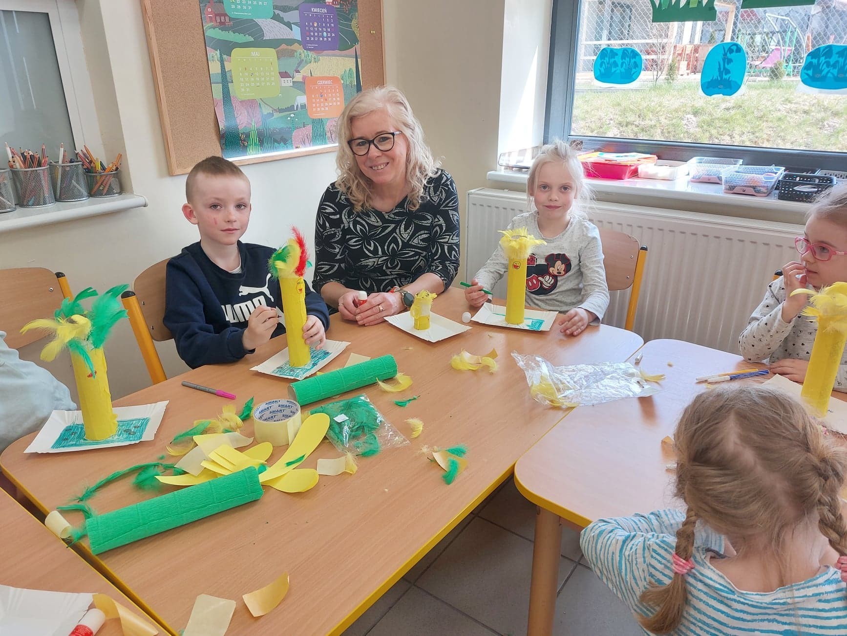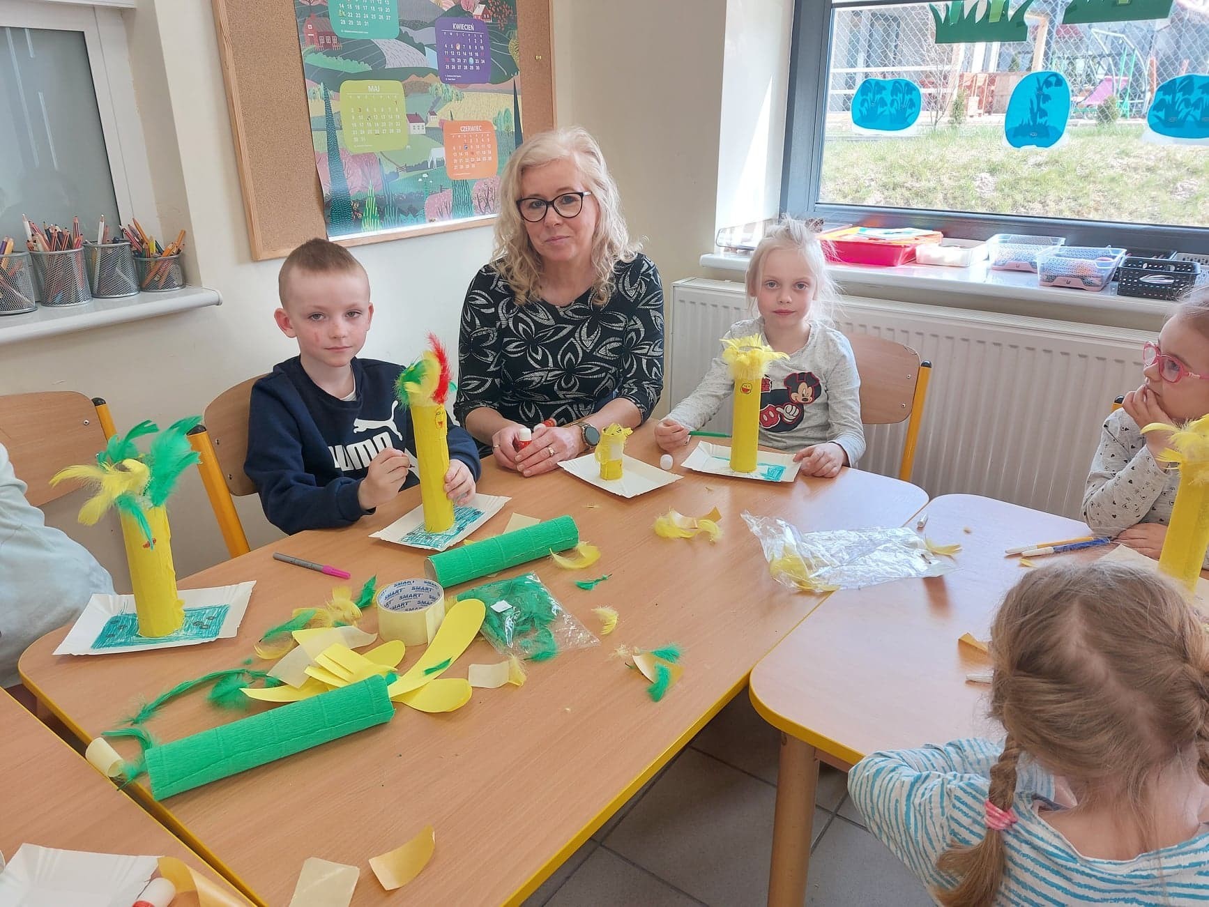 13 kwietnia odwiedziła nas pani Sara, bibliotekarka Biblioteki Publicznej w Janowicach. Przygotowała dla dzieci ciekawą pracę plastyczną. Z wykorzystaniem kolorowych piórek i papierowych rolek, wykonaliśmy śmieszne zajączki i kurczaki. Każdy swoją pracę zabrał do domu, aby zdobiła wielkanocny stół.