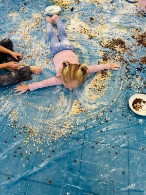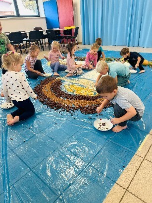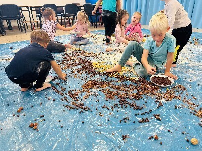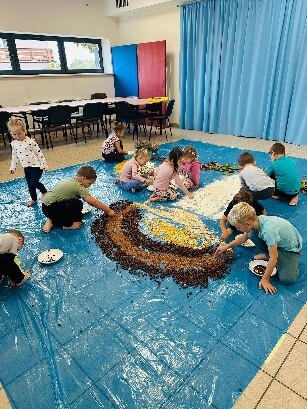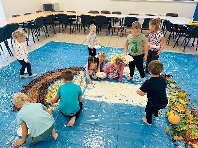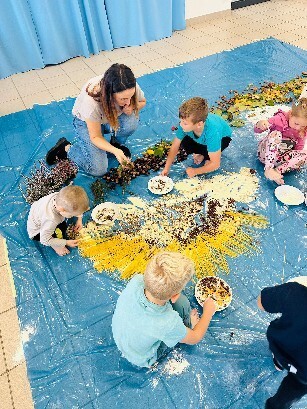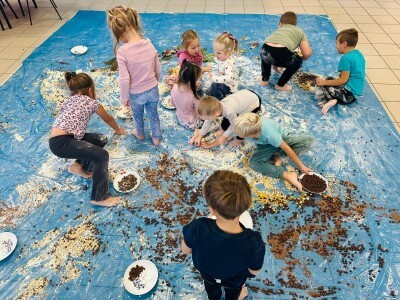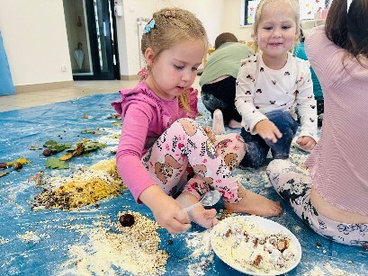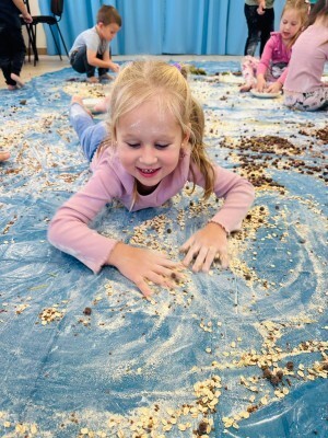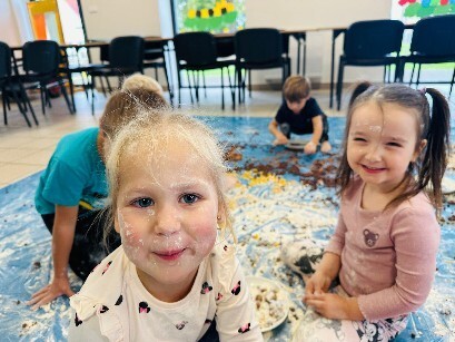 Podczas zajęć dydaktycznych przedszkolaki miały wyjątkową okazję wziąć udział w zabawie sensorycznej z wykorzystaniem produktów spożywczych. Miała ona na celu stymulację zmysłów (dotyk, węch, wzrok, smak, słuch), oswajanie z nowymi teksturami i smakami, wspieranie rozwoju poznawczego oraz budowanie pozytywnej relacji z jedzeniem. Poprzez zabawę z żywnością, np. mąką czy makaronem, dzieci redukują nadwrażliwość, usprawniają motorykę małą i uczą się. Były to zajęcia pełne radości i wspaniałej zabawy.