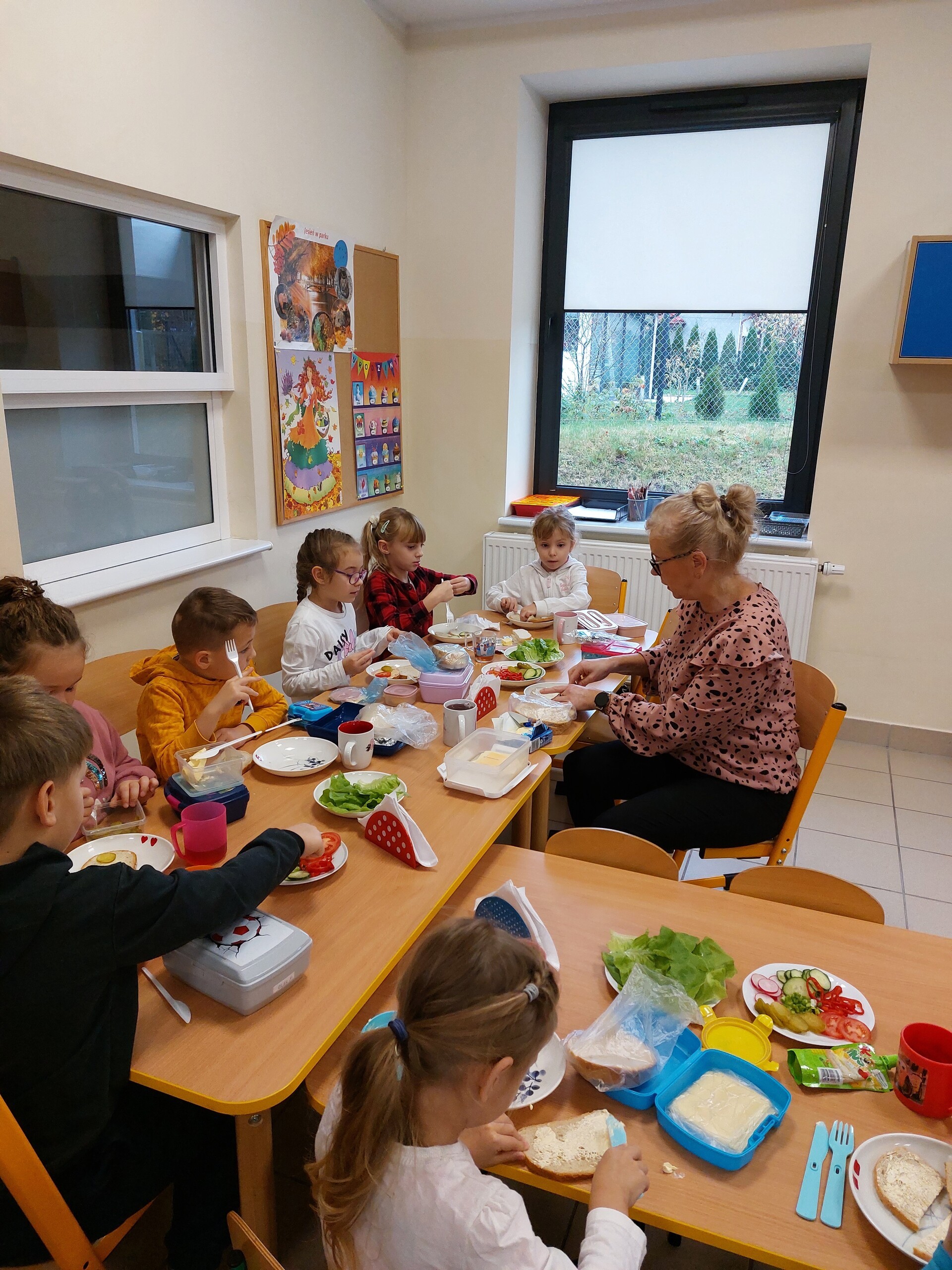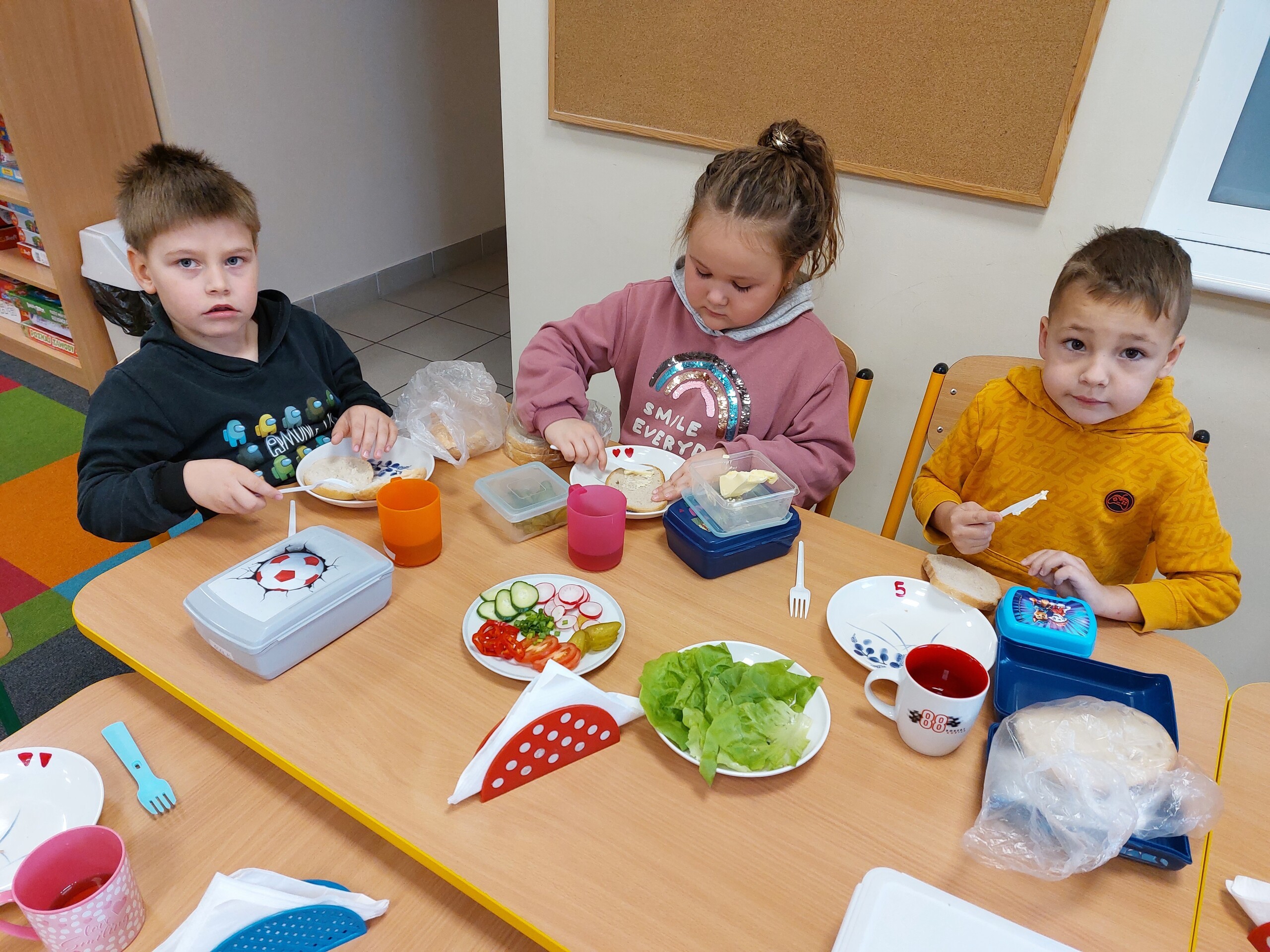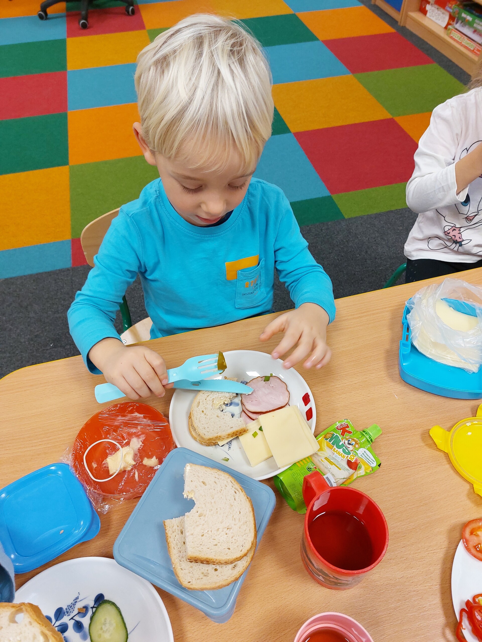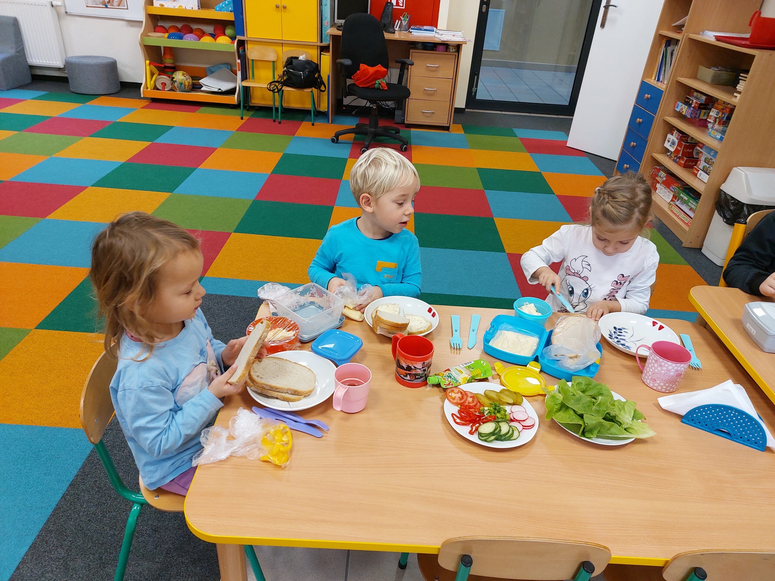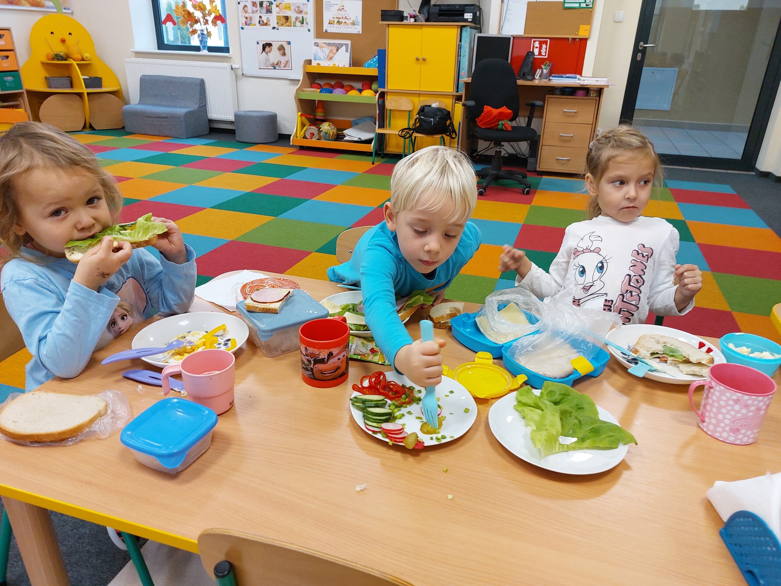 W ramach zajęć, promujących zdrowy tryb życia, przedszkolaki samodzielnie przygotowały śniadanie. Pod okiem nauczyciela wykonały kanapki, ozdabiając je ulubionymi warzywami. Kolorowe śniadanie wszystkim bardzo smakowało.
