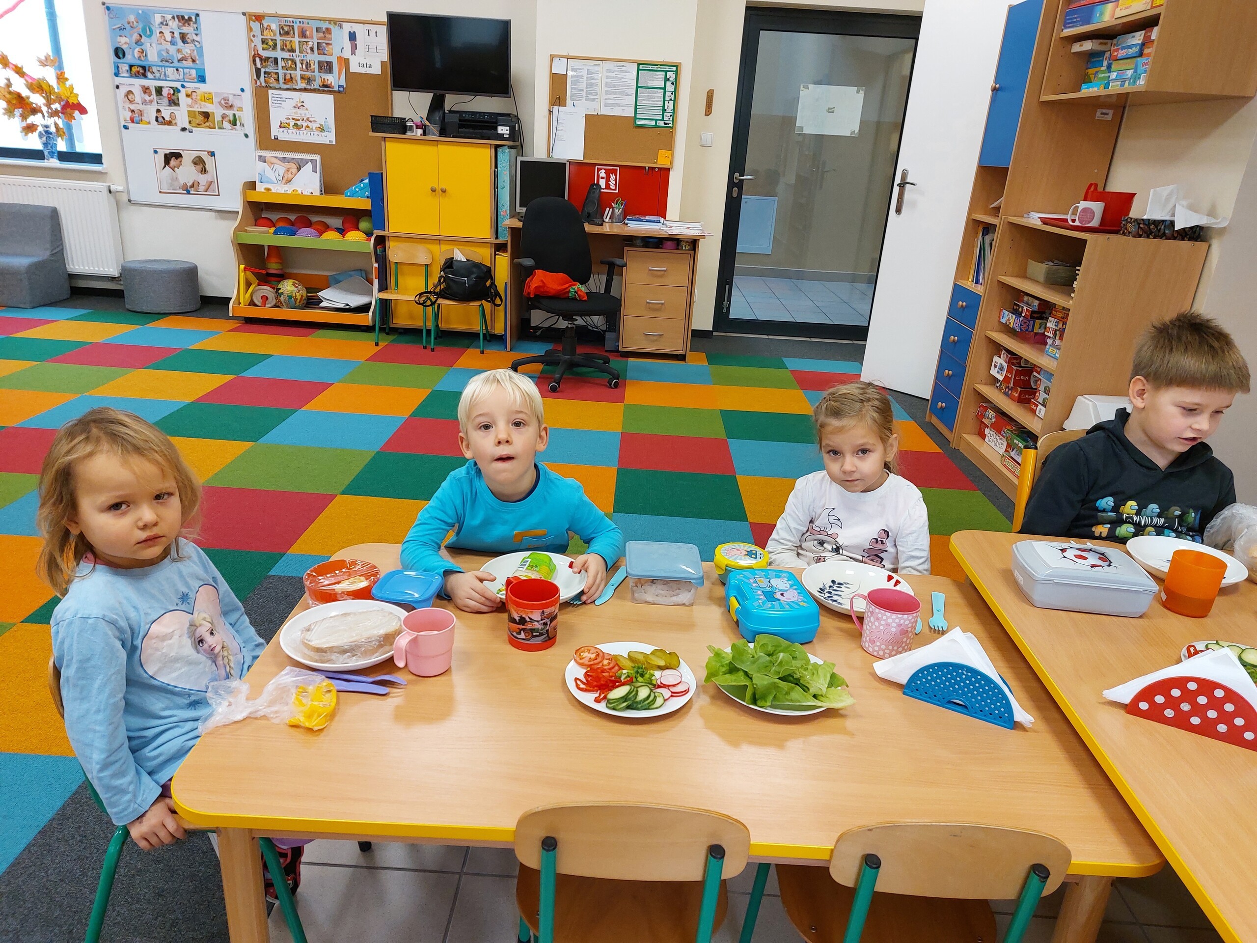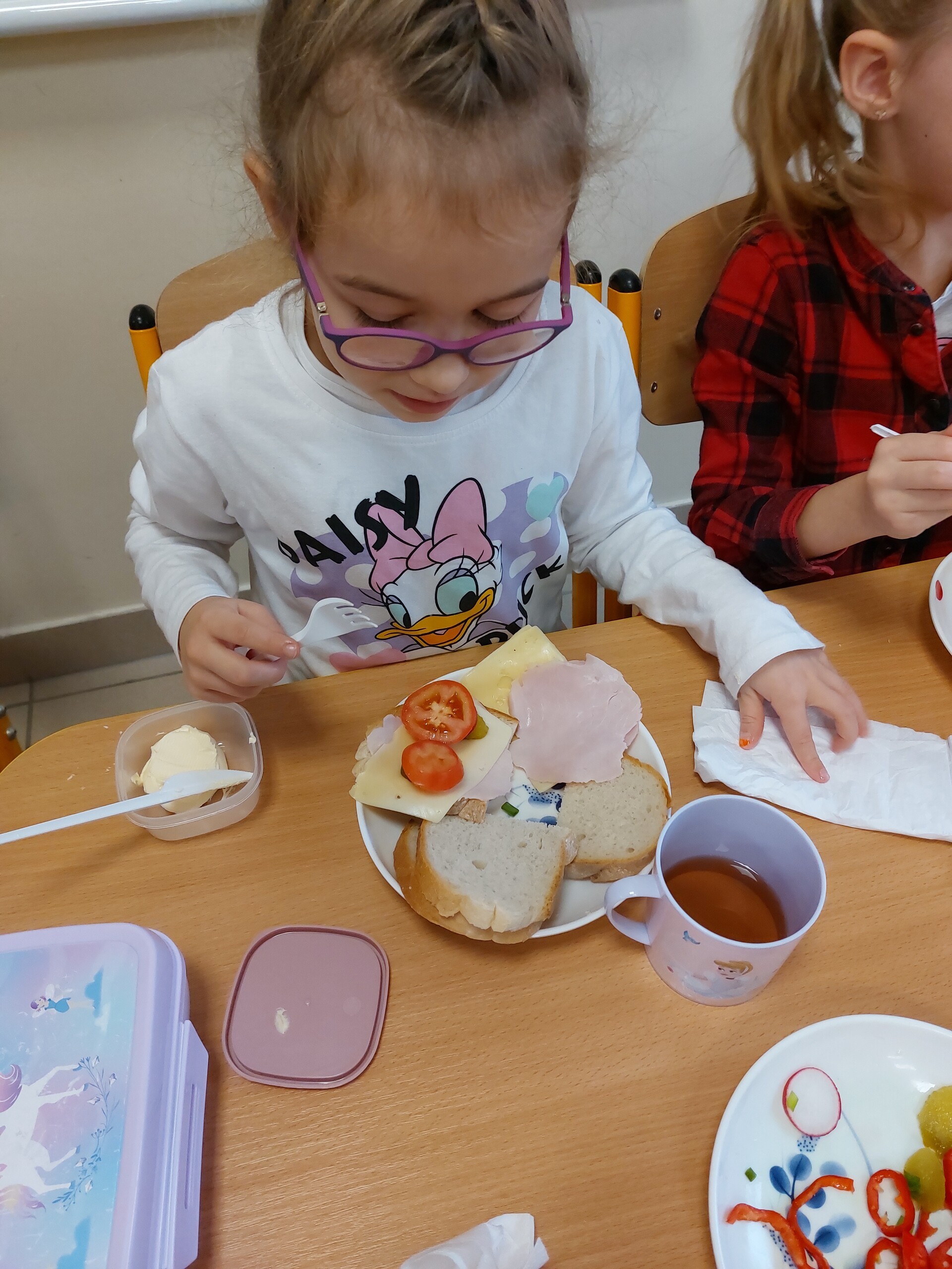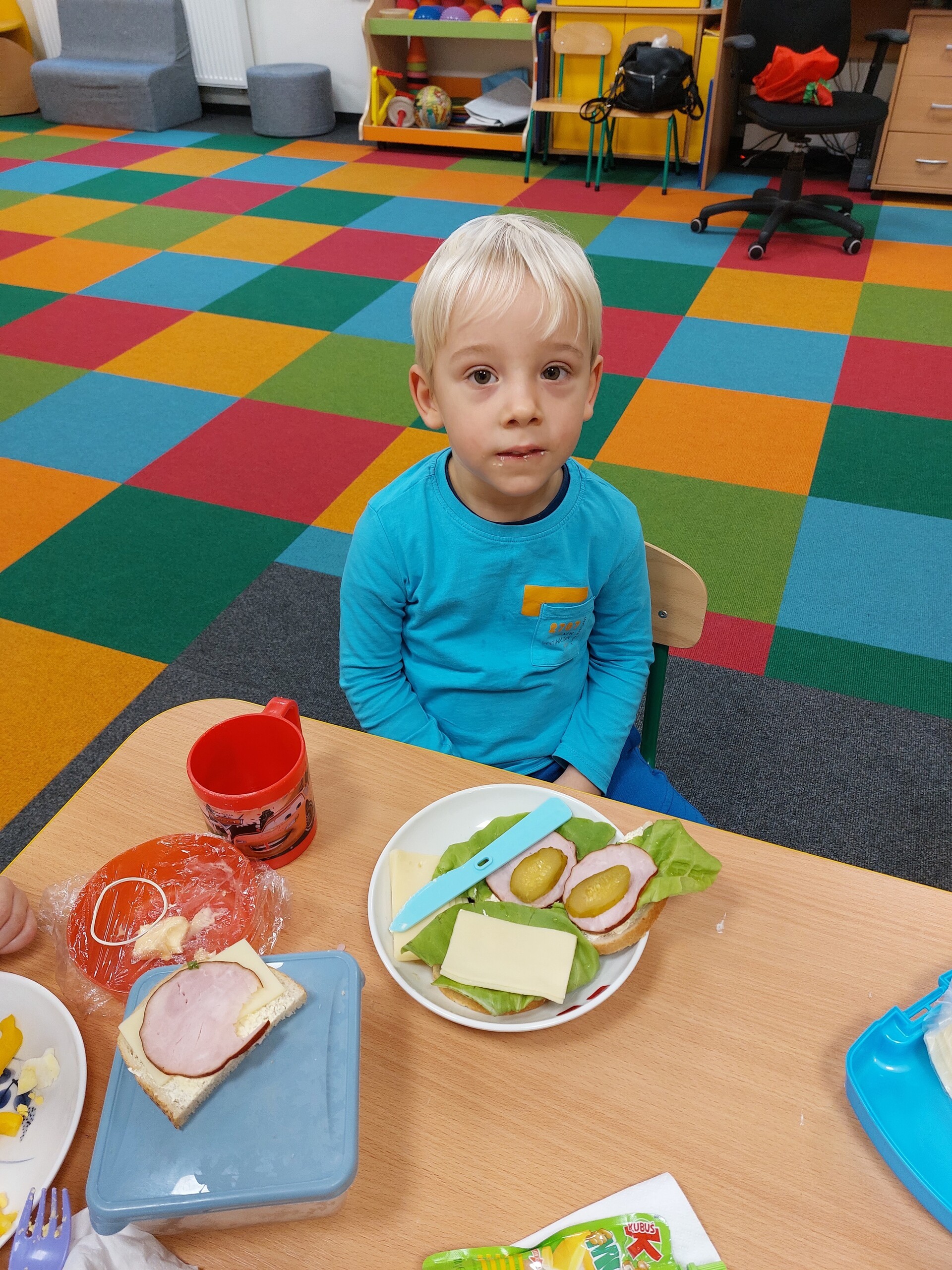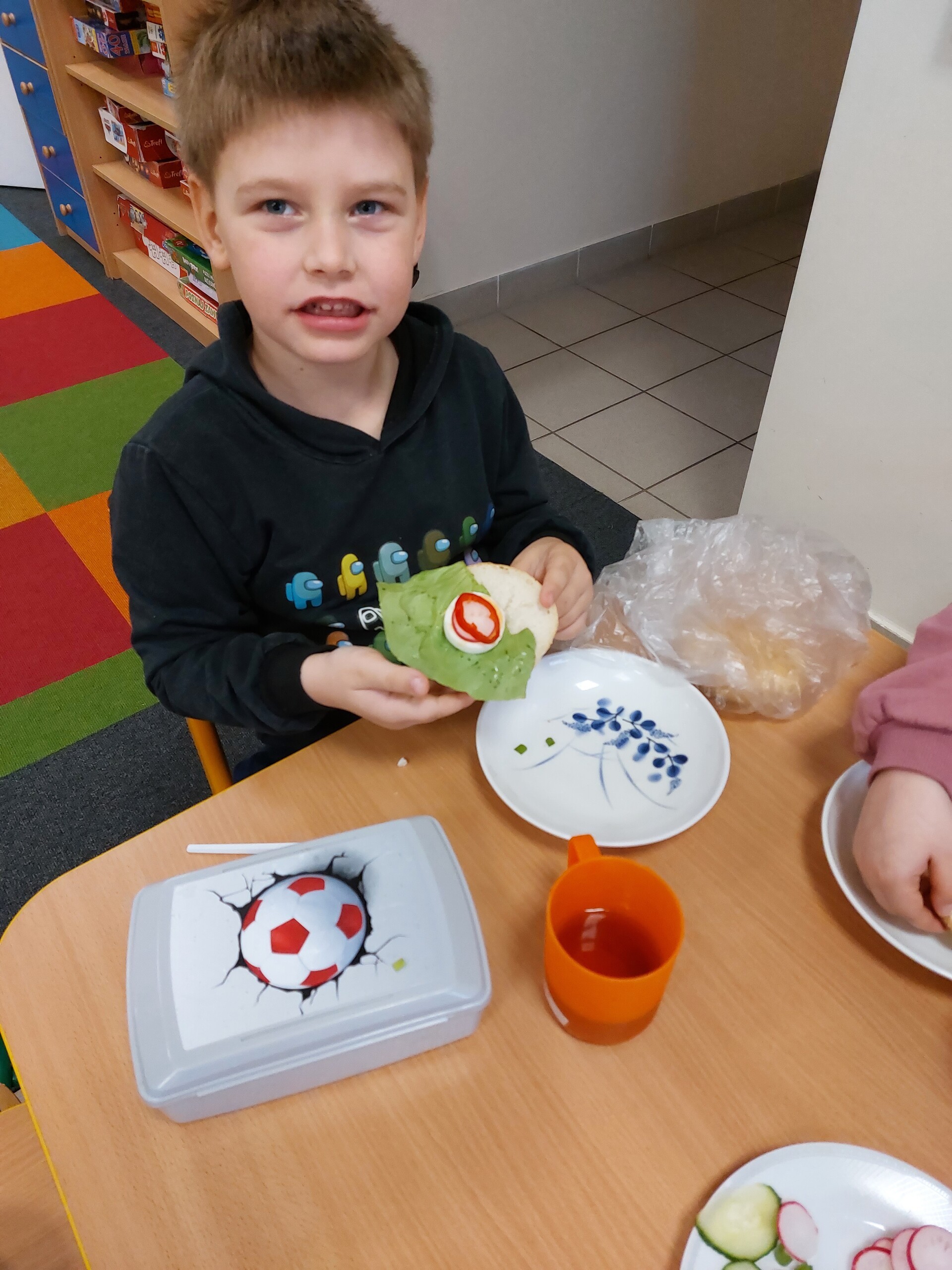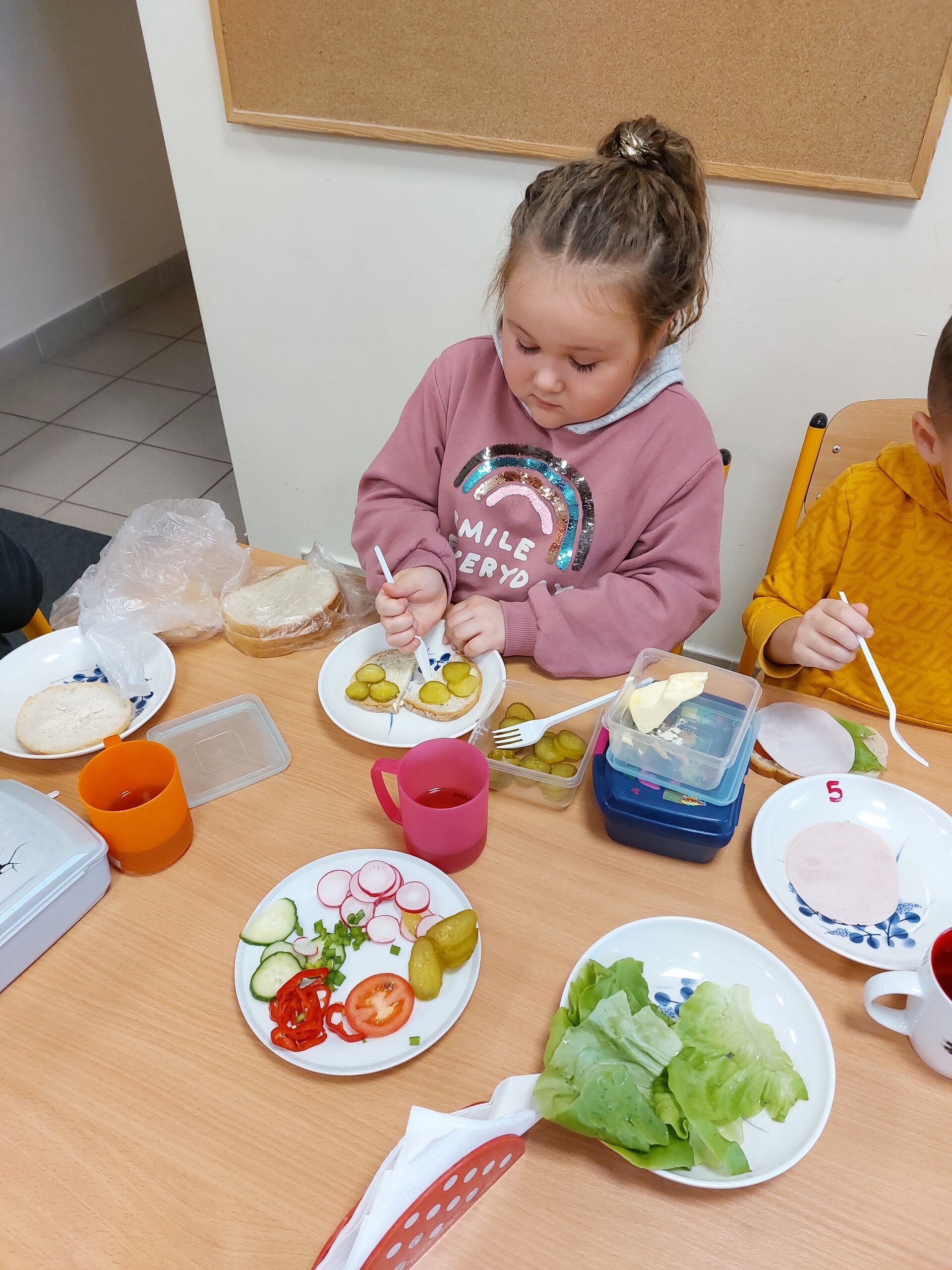 W ramach zajęć, promujących zdrowy tryb życia, przedszkolaki samodzielnie przygotowały śniadanie. Pod okiem nauczyciela wykonały kanapki, ozdabiając je ulubionymi warzywami. Kolorowe śniadanie wszystkim bardzo smakowało.