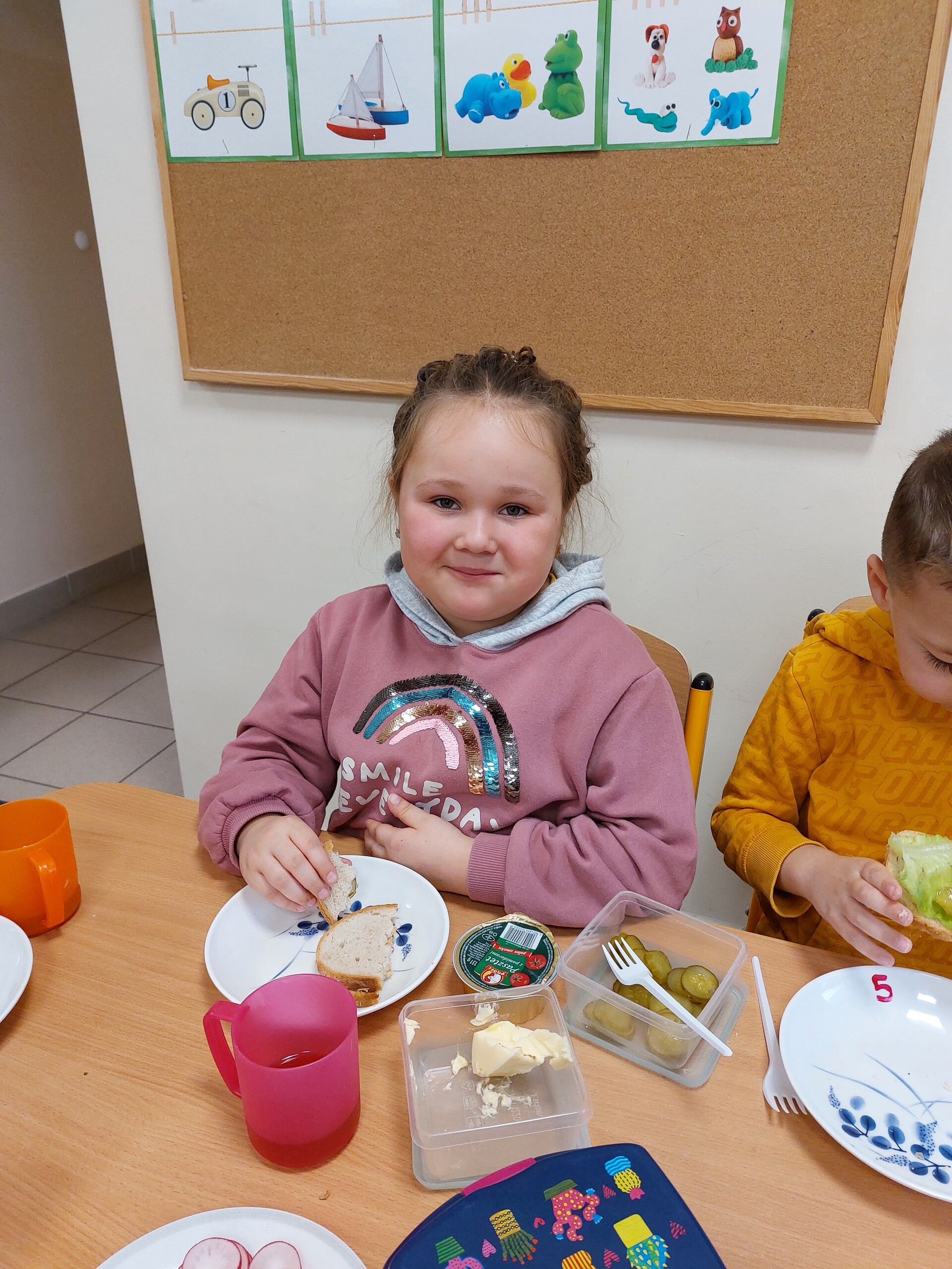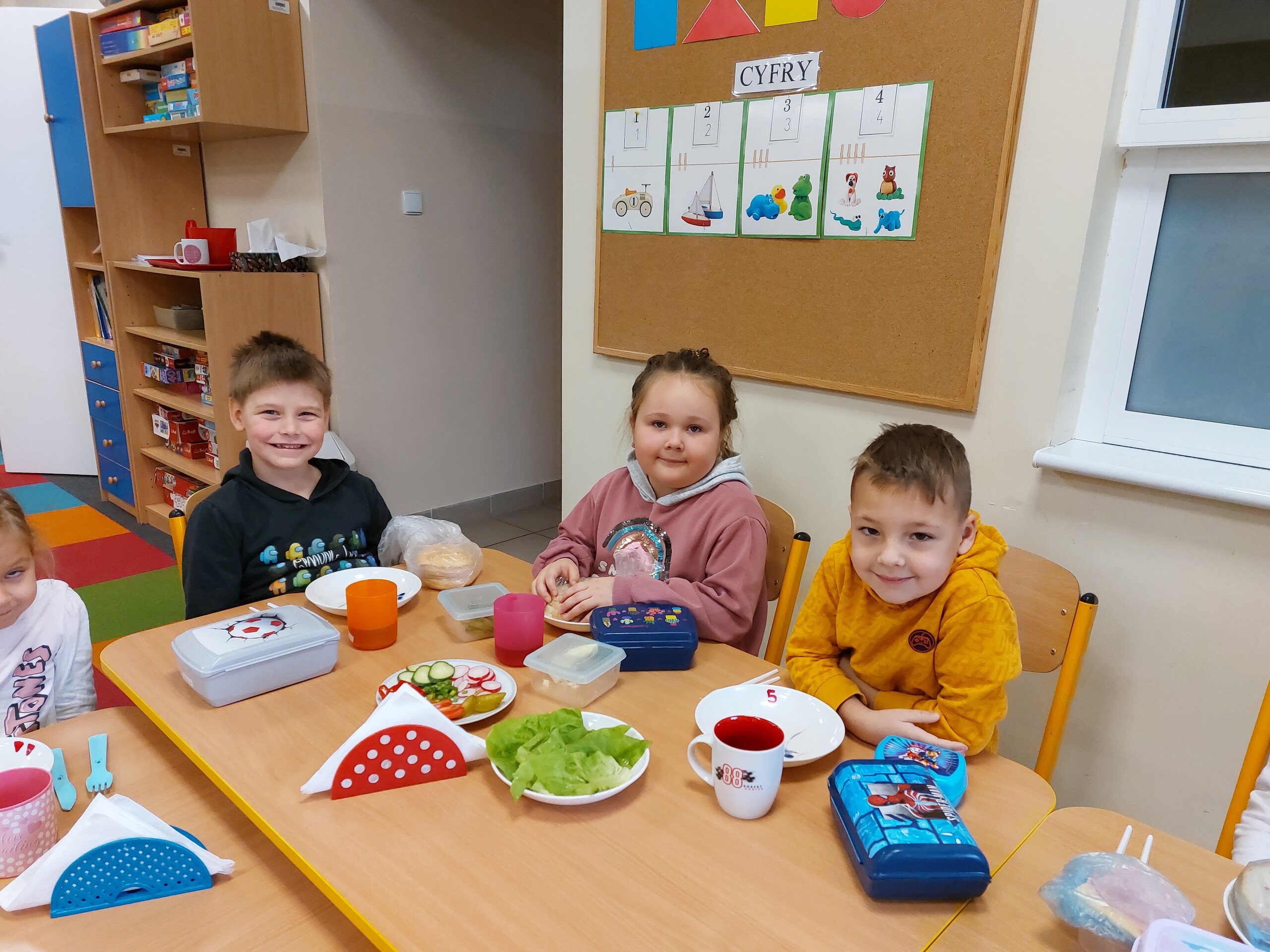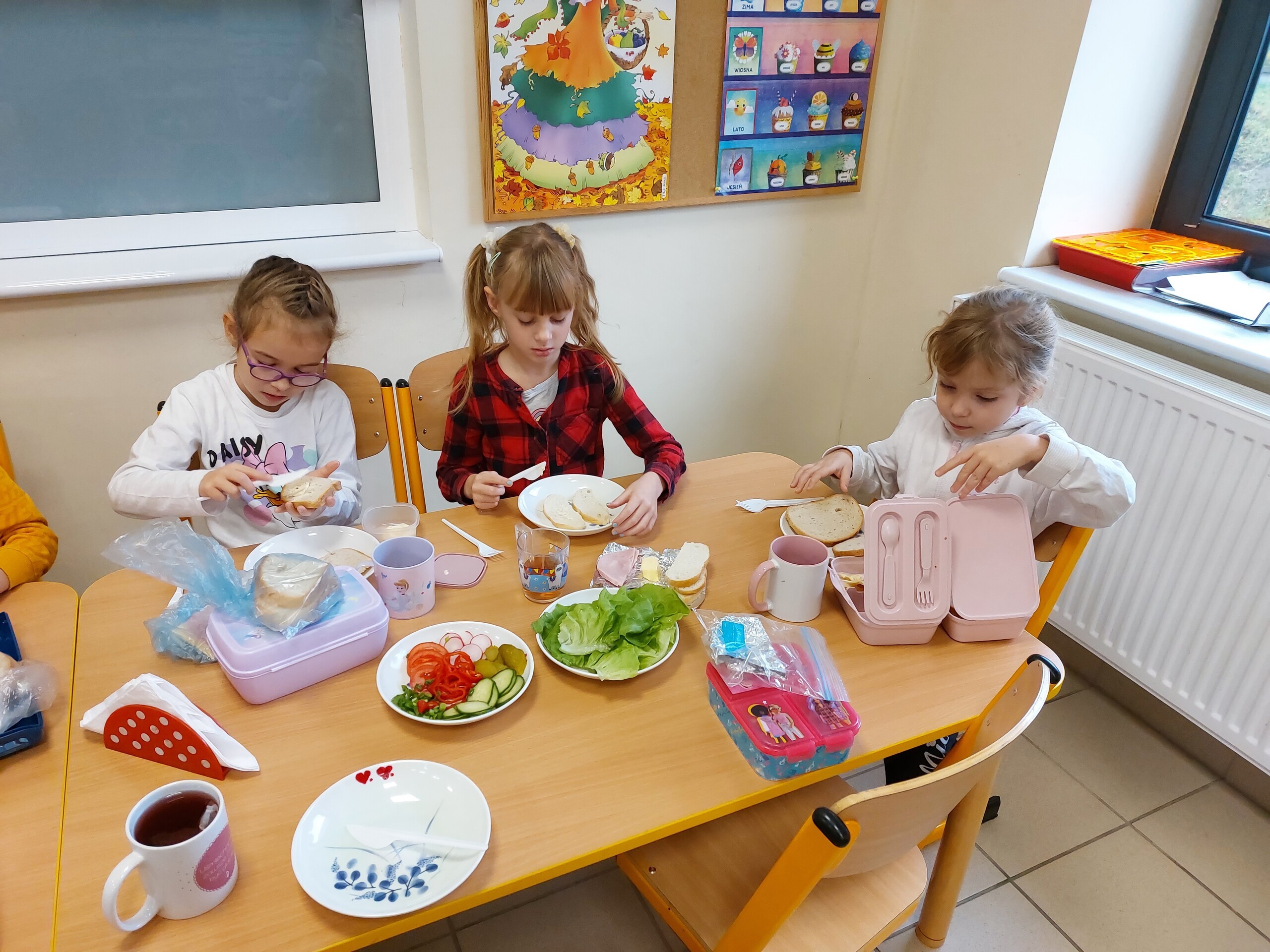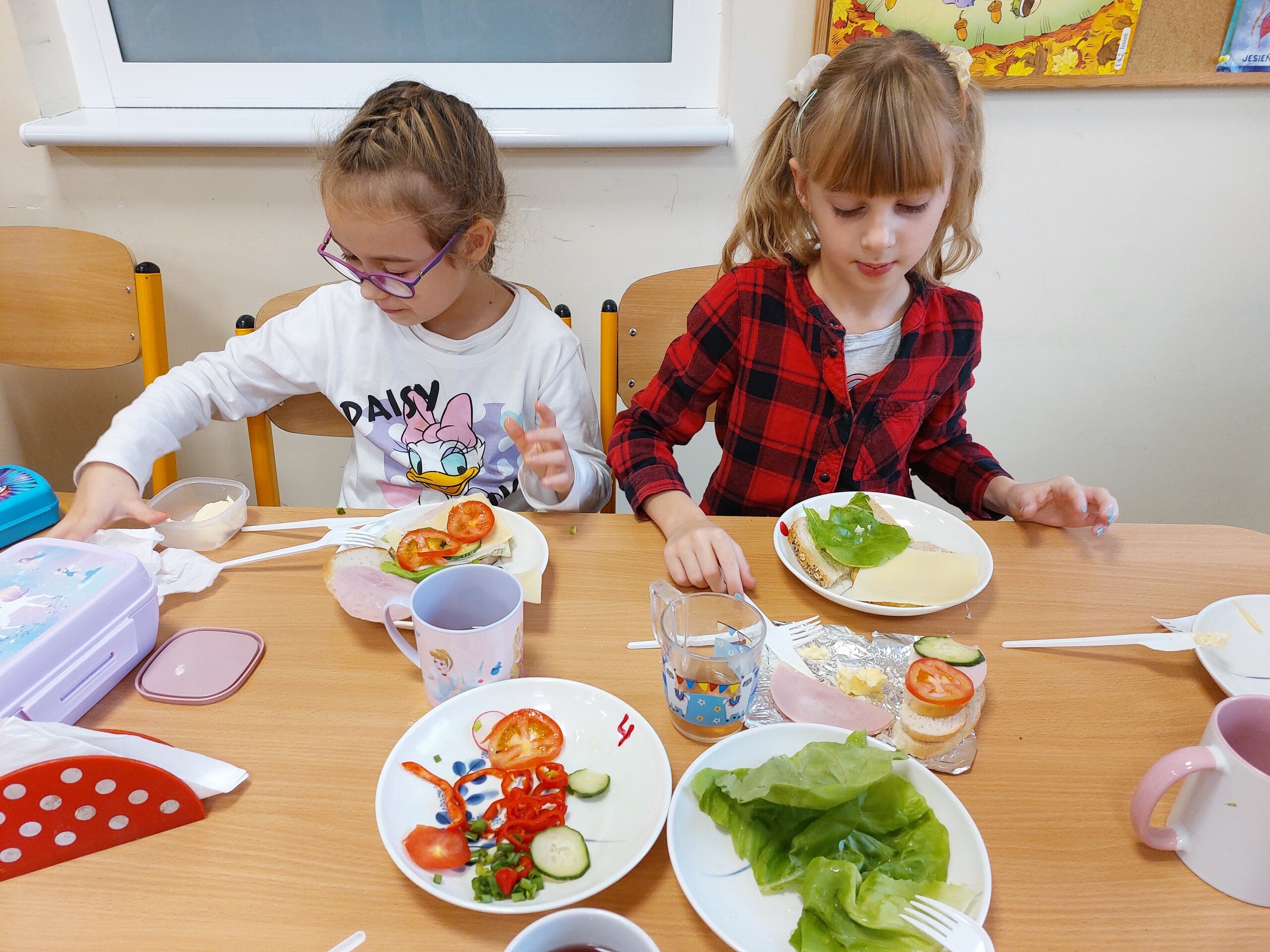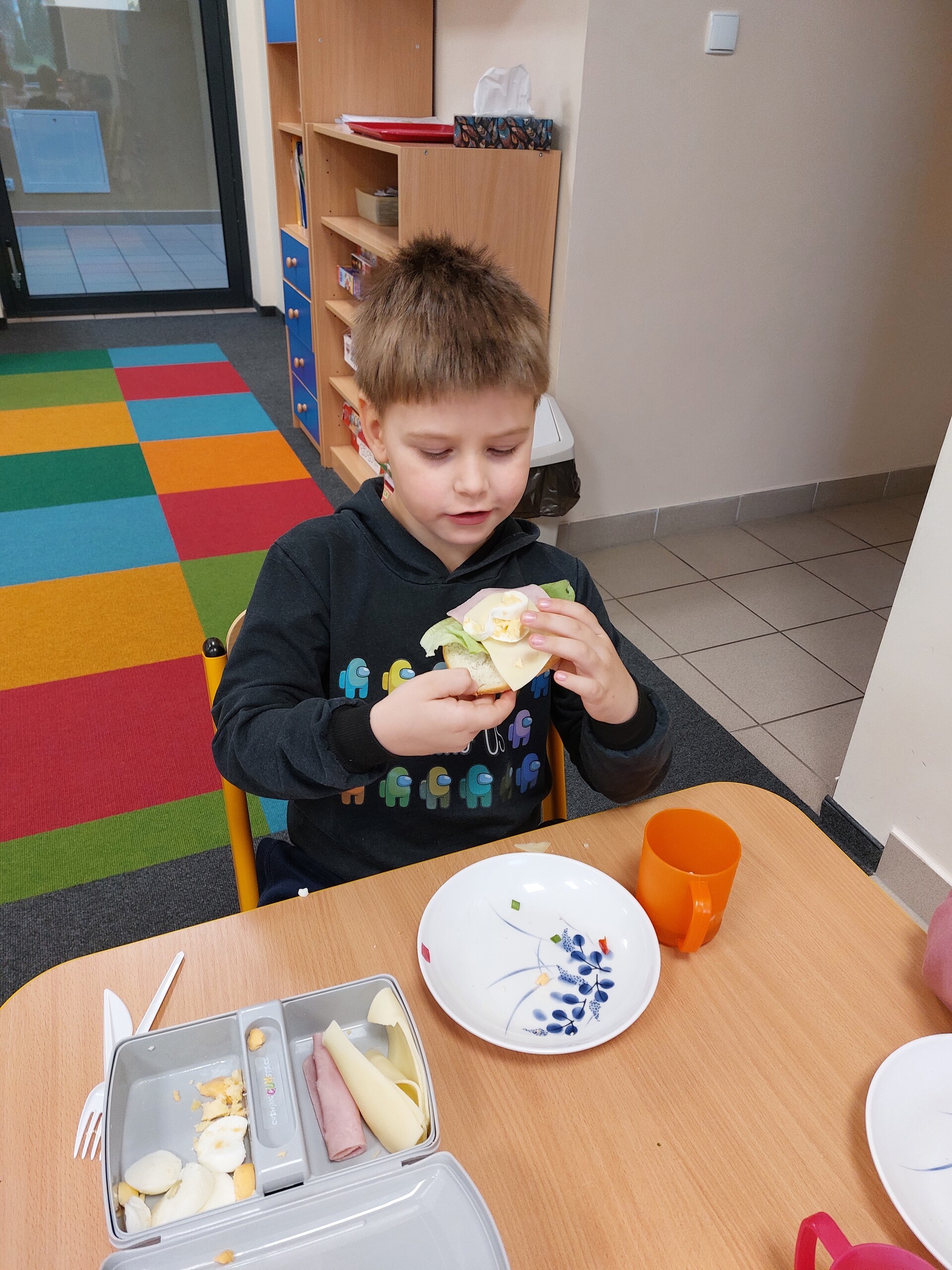 W ramach zajęć, promujących zdrowy tryb życia, przedszkolaki samodzielnie przygotowały śniadanie. Pod okiem nauczyciela wykonały kanapki, ozdabiając je ulubionymi warzywami. Kolorowe śniadanie wszystkim bardzo smakowało.