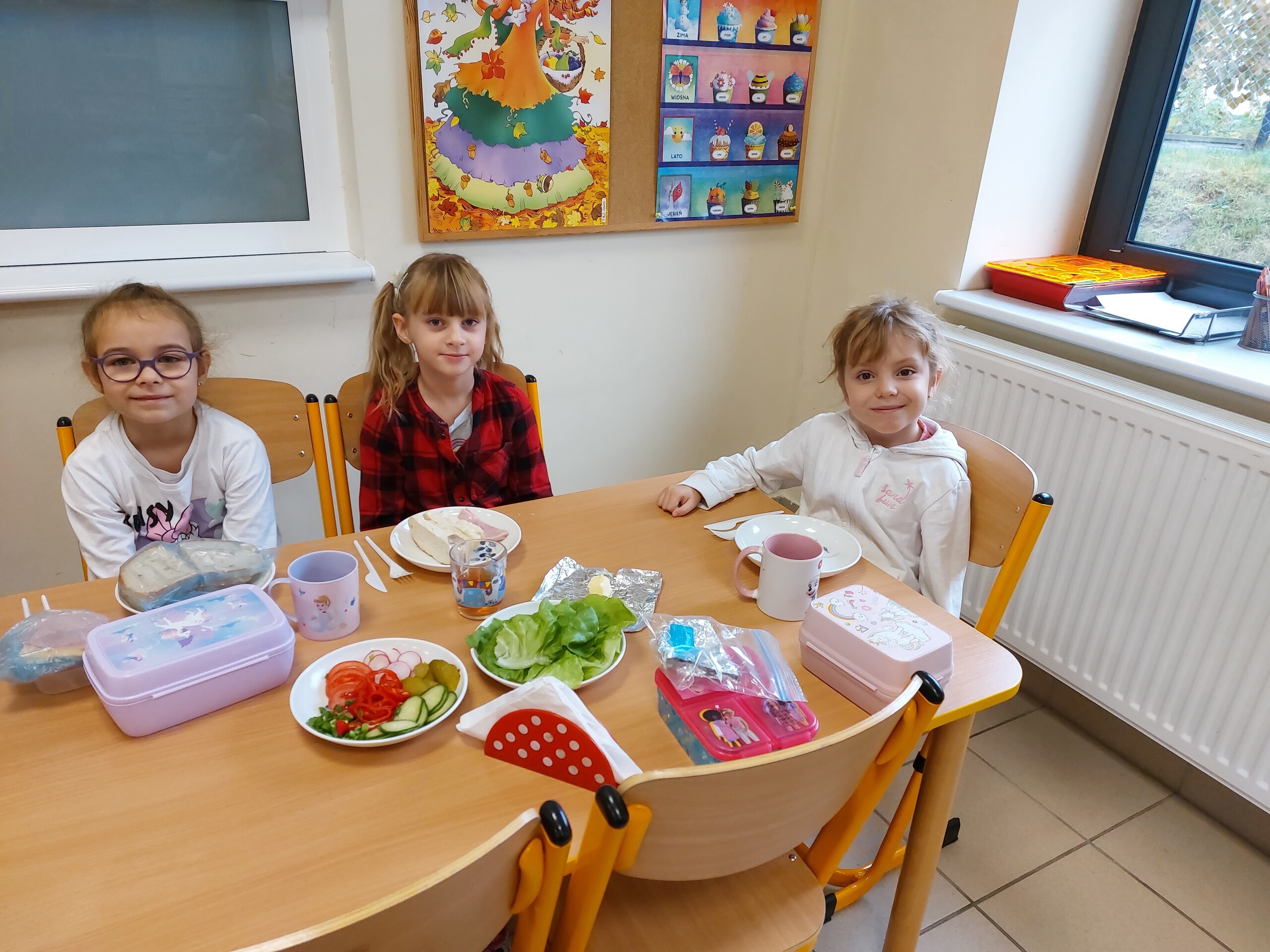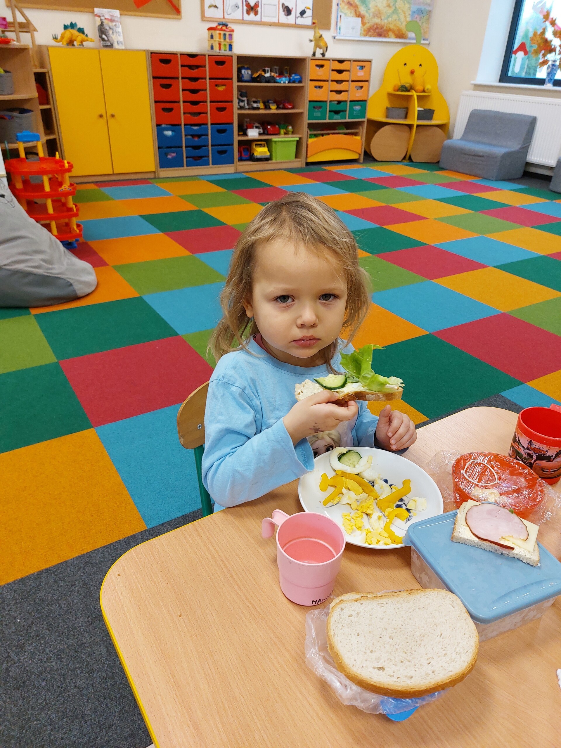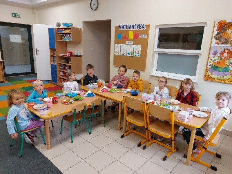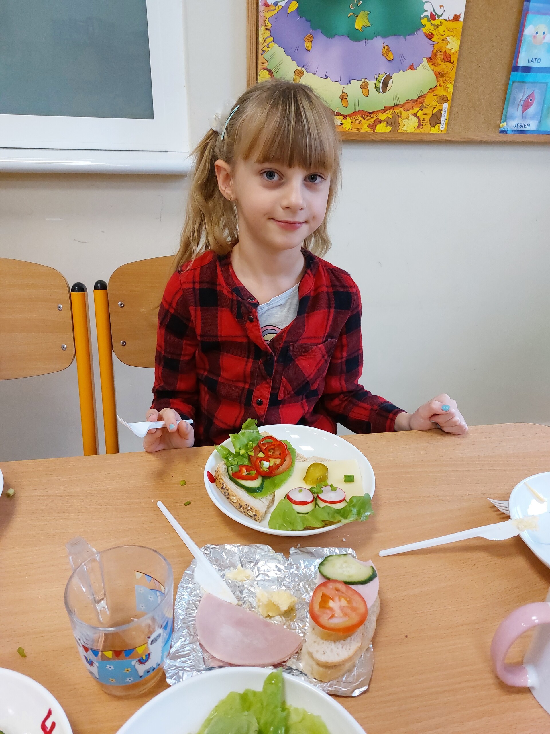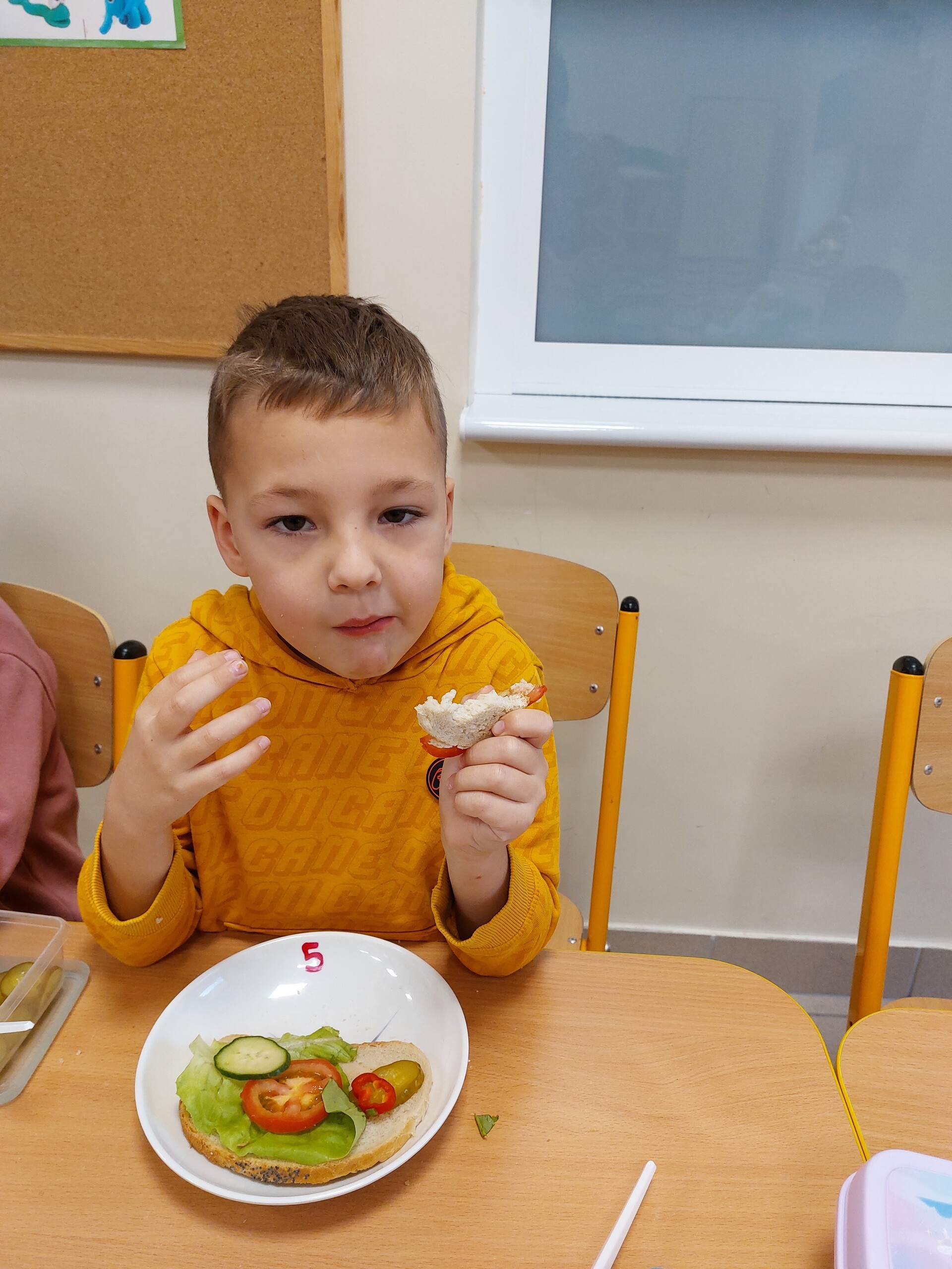 W ramach zajęć, promujących zdrowy tryb życia, przedszkolaki samodzielnie przygotowały śniadanie. Pod okiem nauczyciela wykonały kanapki, ozdabiając je ulubionymi warzywami. Kolorowe śniadanie wszystkim bardzo smakowało.