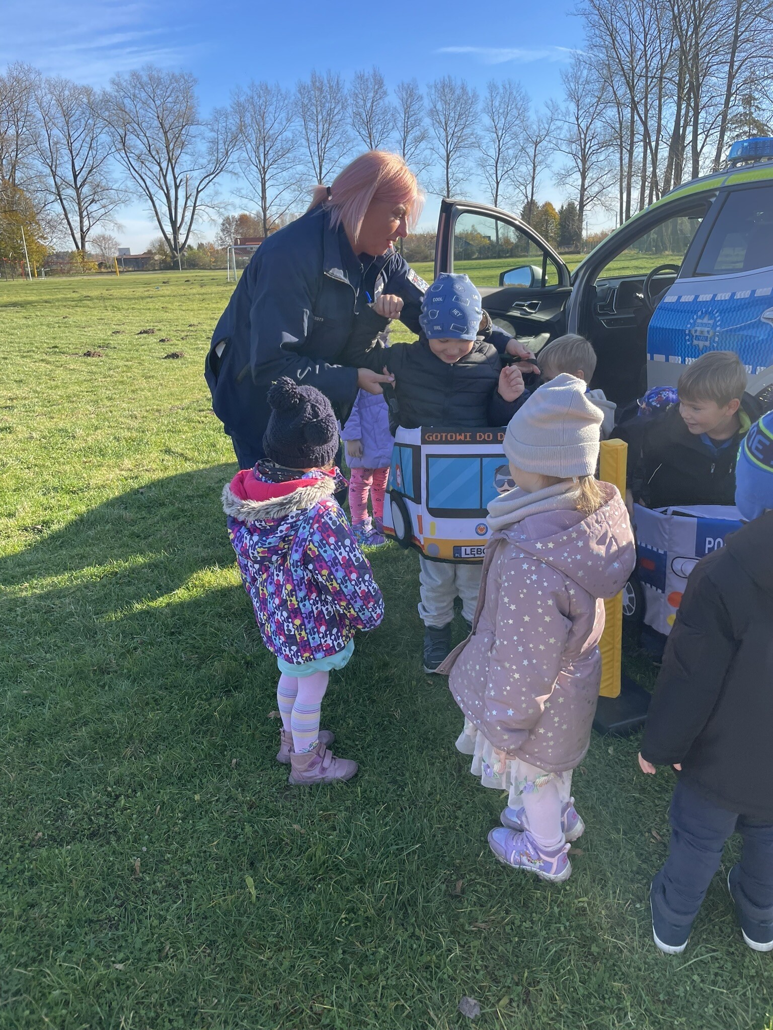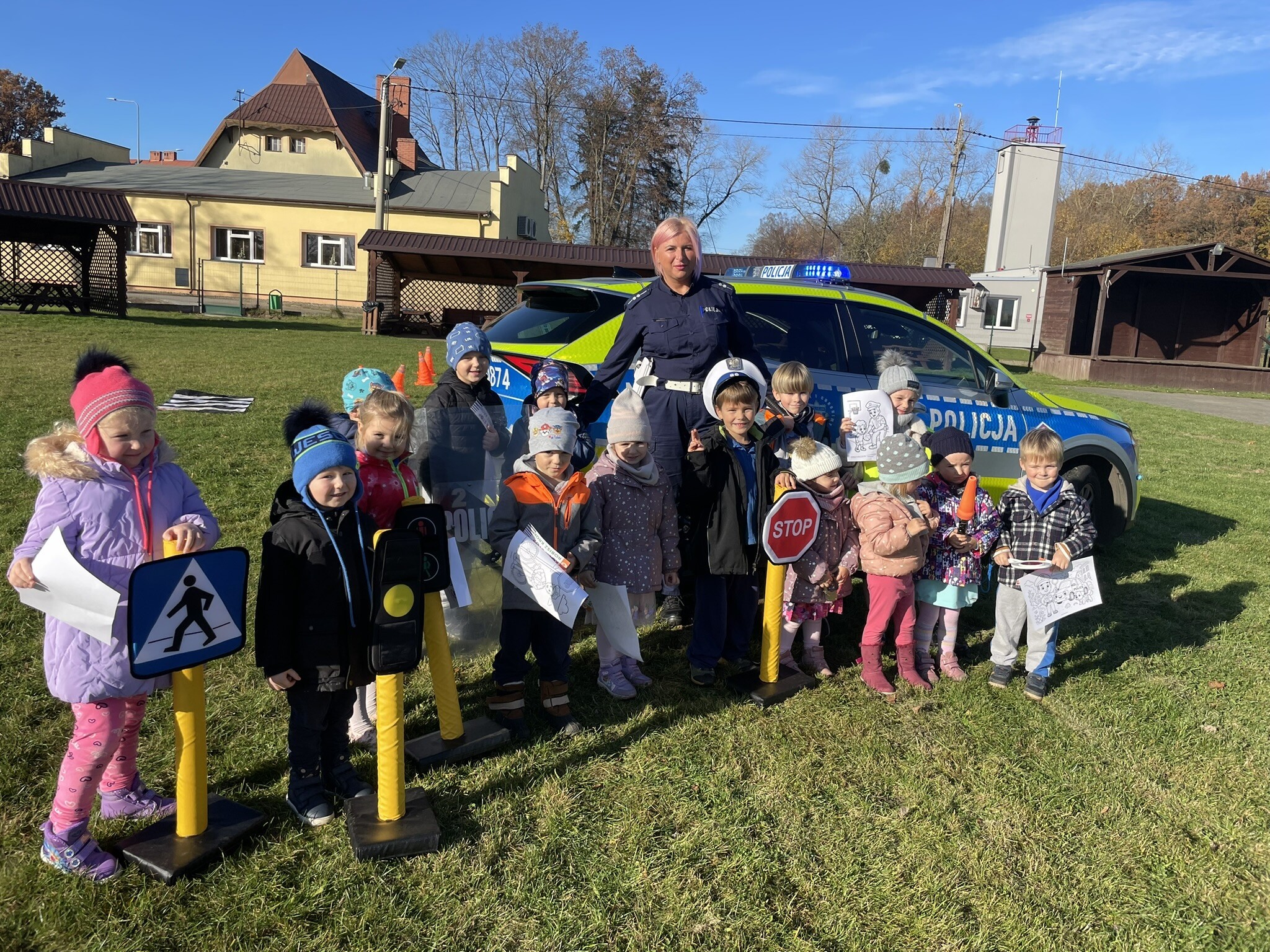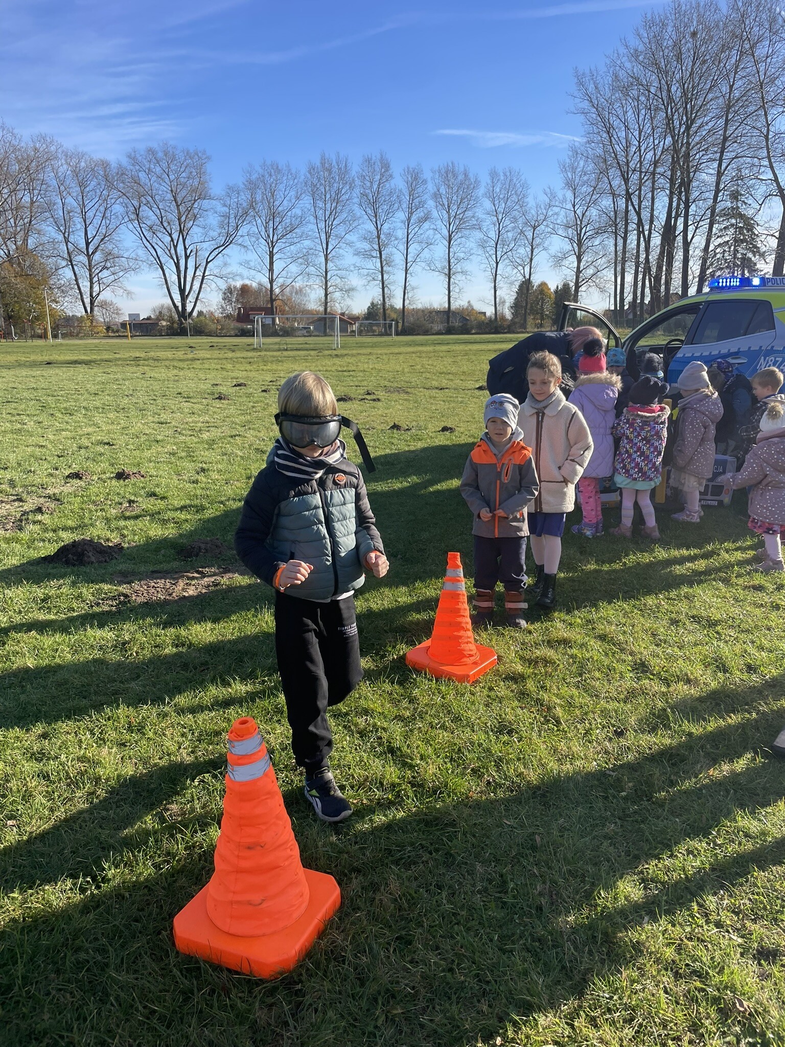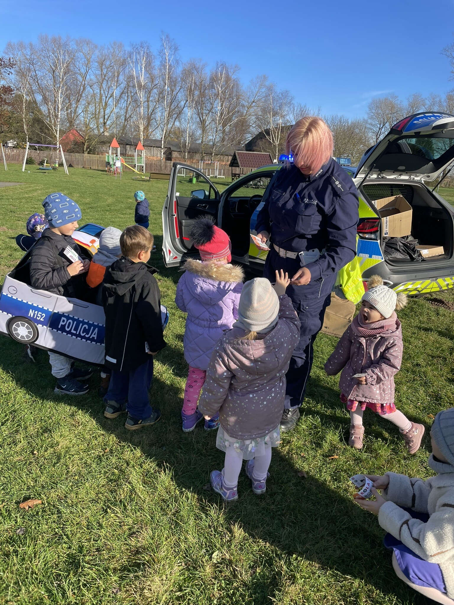 Tym razem, dzięki wspaniałej pogodzie, dzieci mogły spotkać się z naszym gościem na naszym terenie rekreacyjnym. Przedszkolaki z uwagą wysłuchały przypomnień o bezpiecznym przechodzeniu przez jezdnię, prawidłowym wyposażeniu podczas jazdy rowerem, czy na hulajnodze. Nauczyciel miał okazję założyć i sprawdzić jak działają alkogogle - specjalne okulary, które uświadamiają użytkownikom, jak alkohol wpływa na ocenę odległości, koordynację ruchową oraz zniekształcenie obrazu. Spotkanie przybliżyło dzieciom pracę policjanta, poznały akcesoria, których używa, a przede wszystkim dzieci odczuły, że ,,Policjant to przyjaciel dzieci".