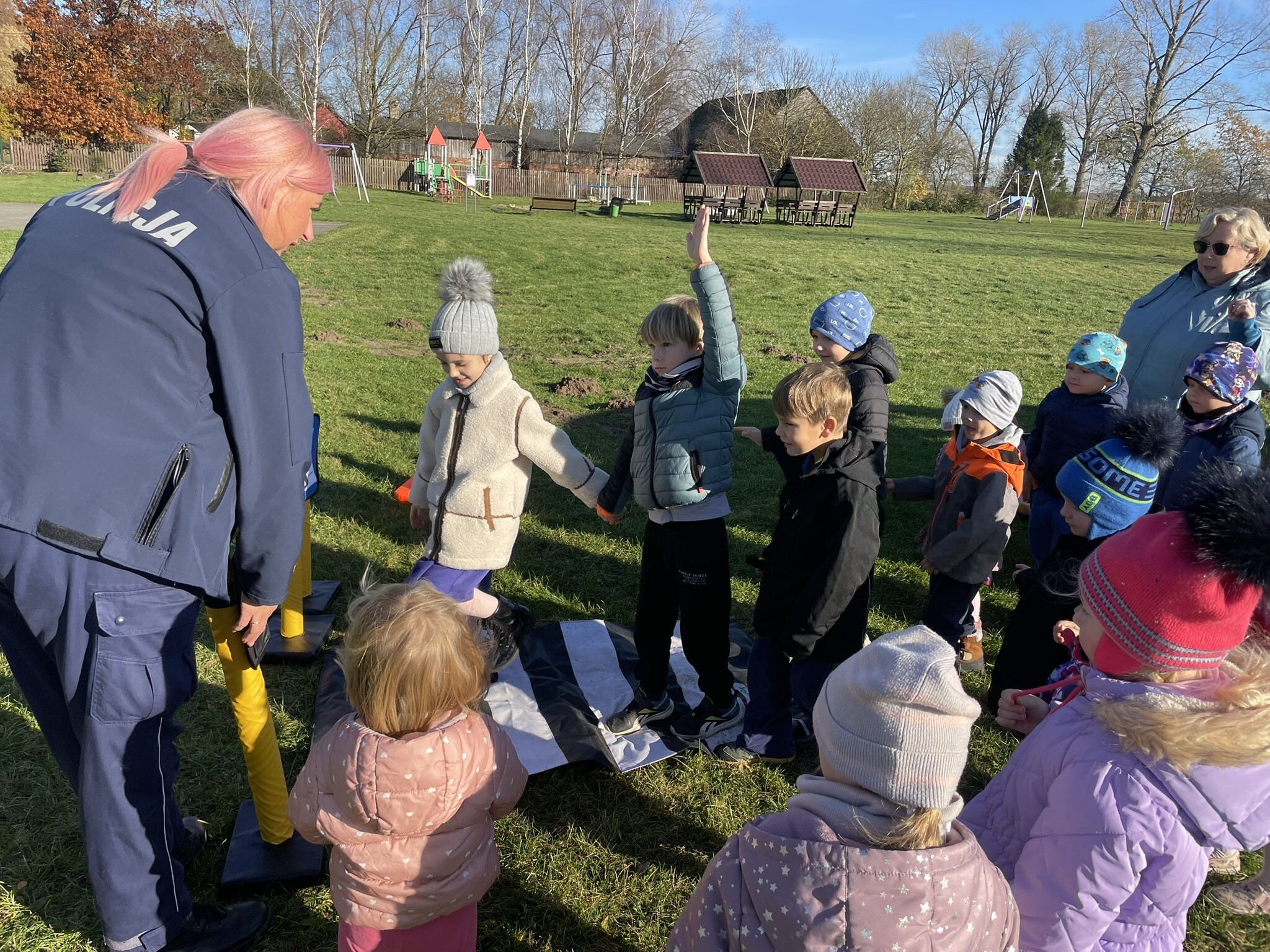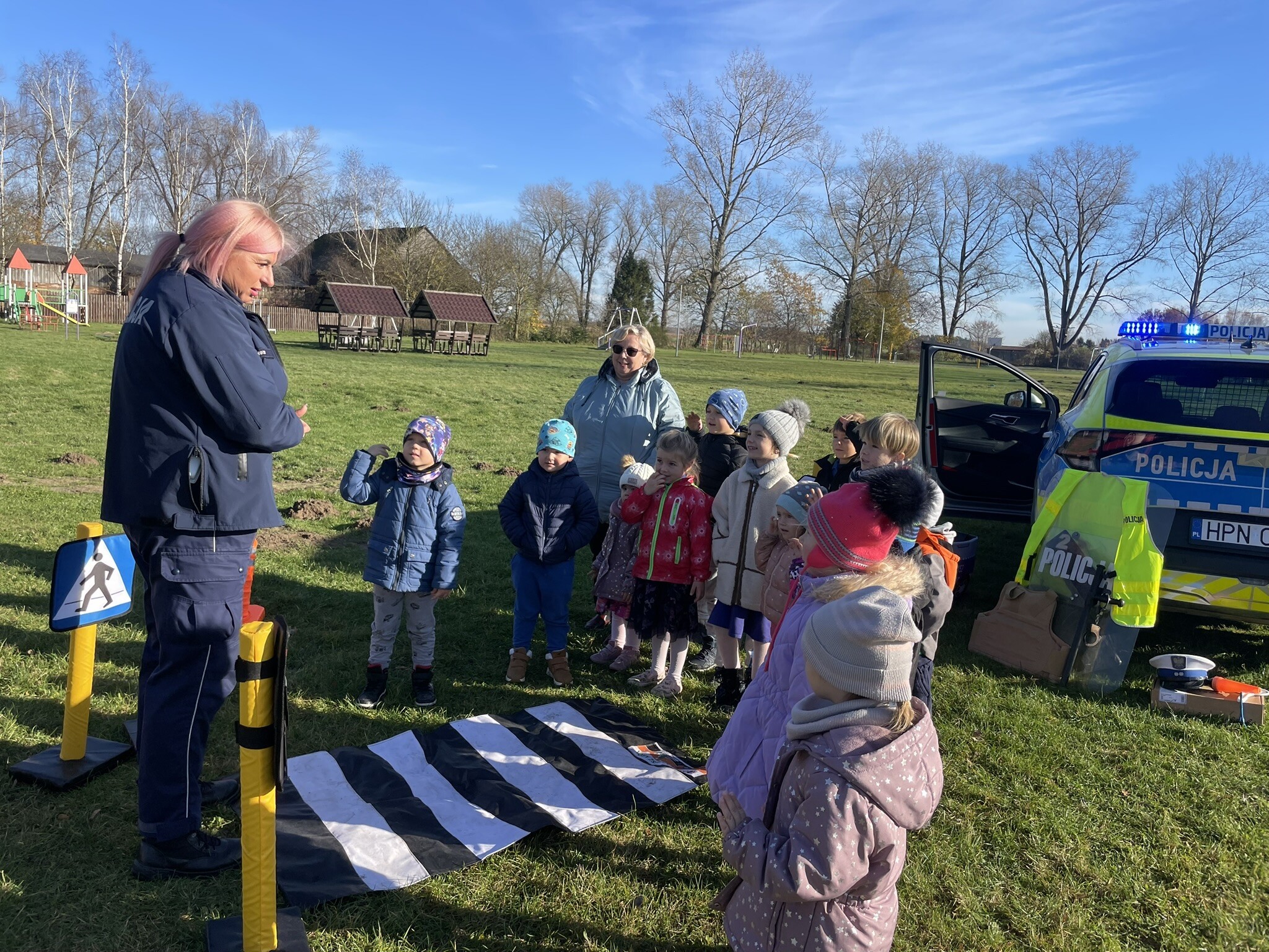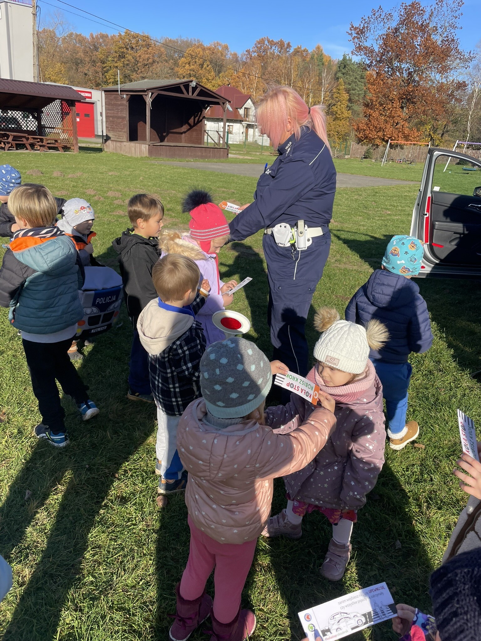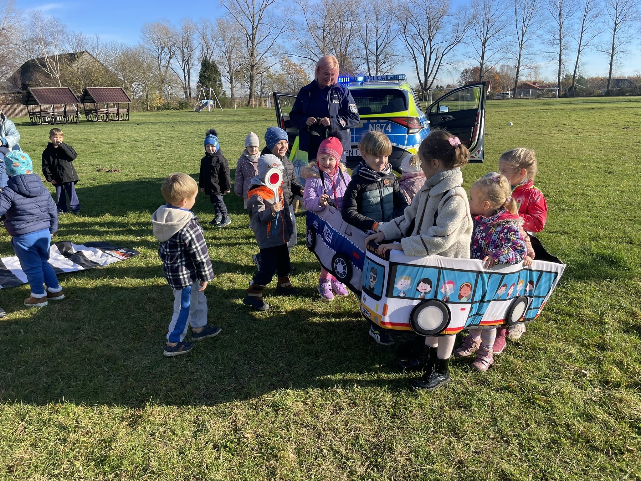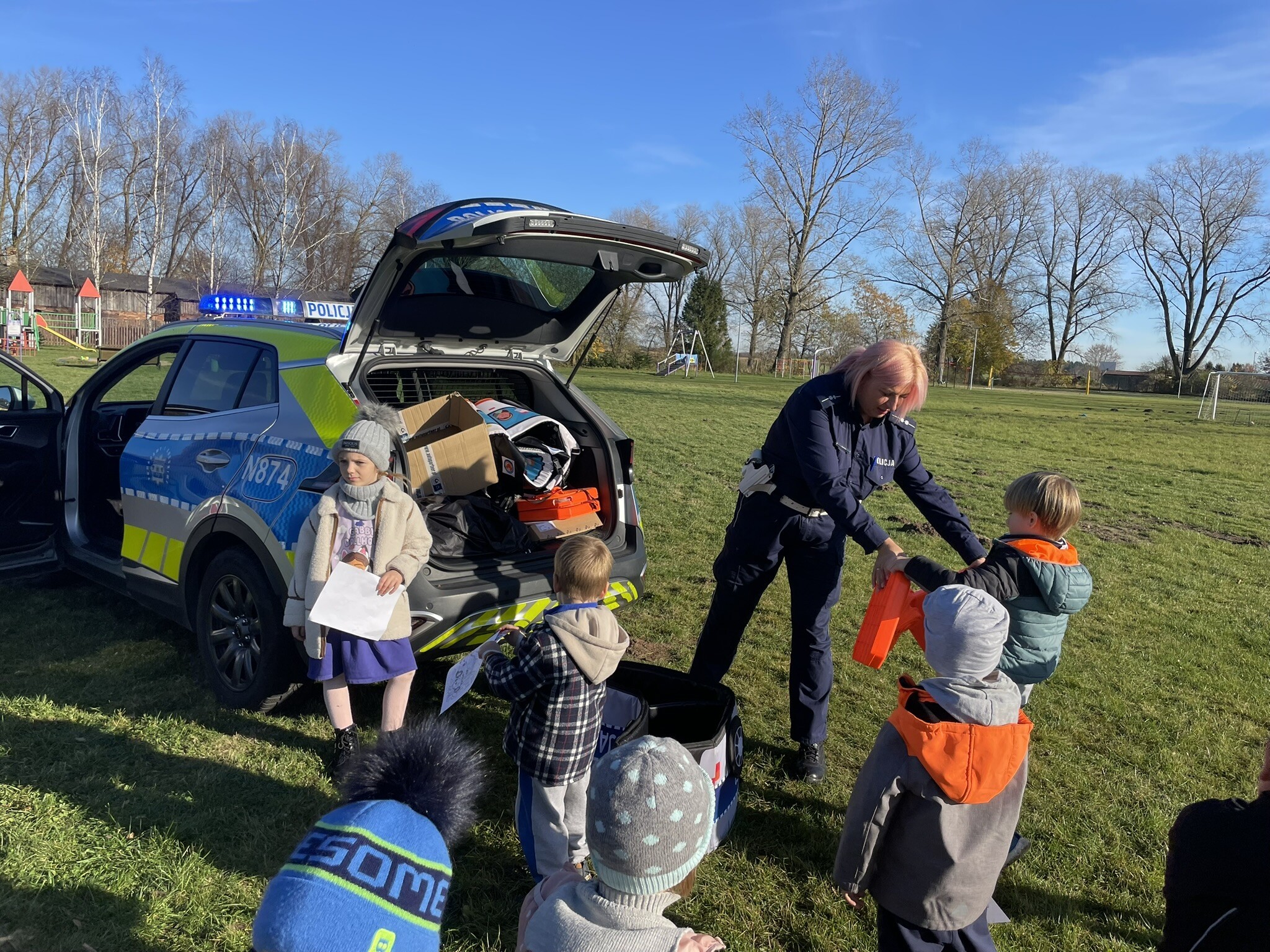 Tym razem, dzięki wspaniałej pogodzie, dzieci mogły spotkać się z naszym gościem na naszym terenie rekreacyjnym. Przedszkolaki z uwagą wysłuchały przypomnień o bezpiecznym przechodzeniu przez jezdnię, prawidłowym wyposażeniu podczas jazdy rowerem, czy na hulajnodze. Nauczyciel miał okazję założyć i sprawdzić jak działają alkogogle - specjalne okulary, które uświadamiają użytkownikom, jak alkohol wpływa na ocenę odległości, koordynację ruchową oraz zniekształcenie obrazu. Spotkanie przybliżyło dzieciom pracę policjanta, poznały akcesoria, których używa, a przede wszystkim dzieci odczuły, że ,,Policjant to przyjaciel dzieci".