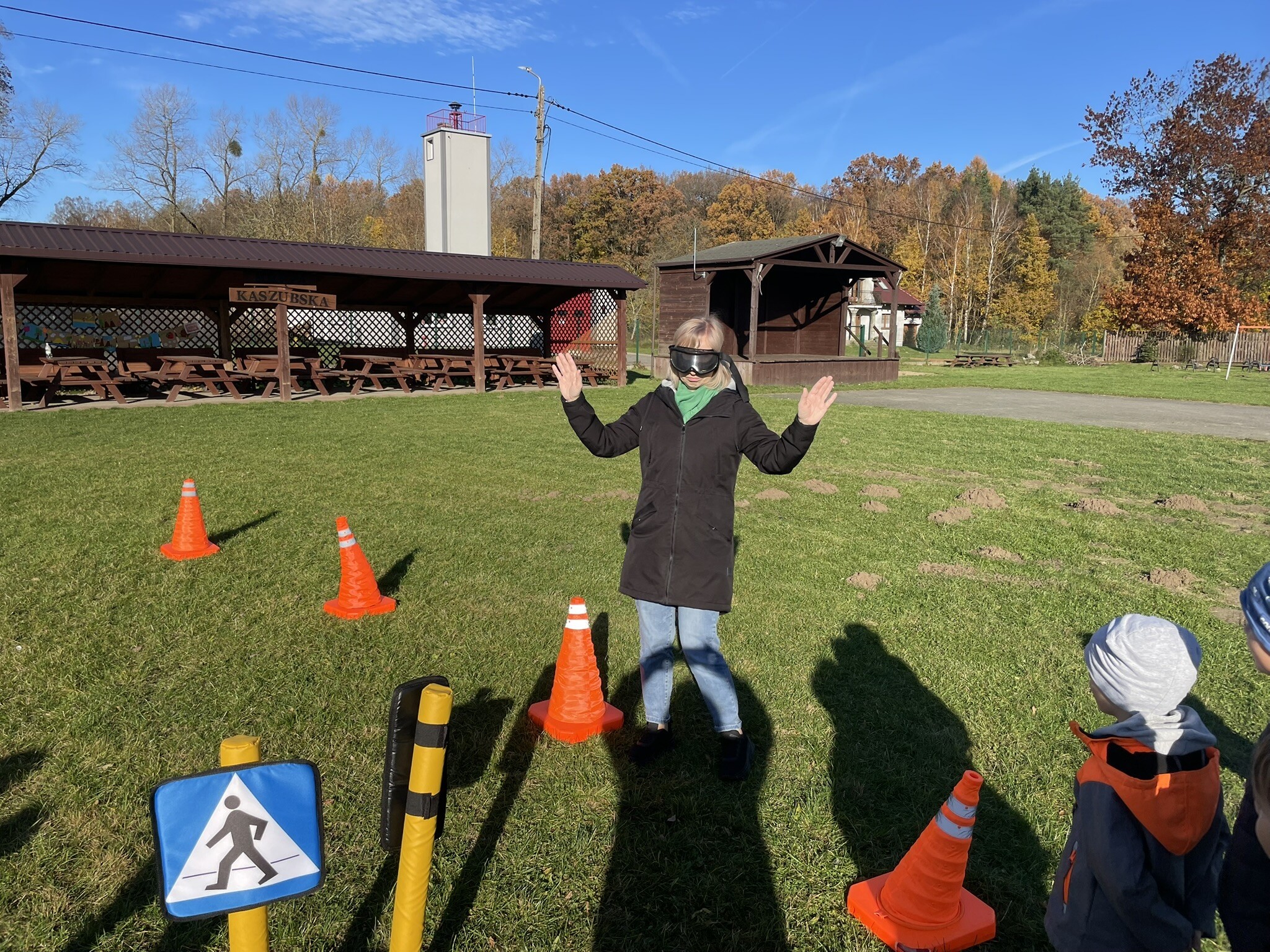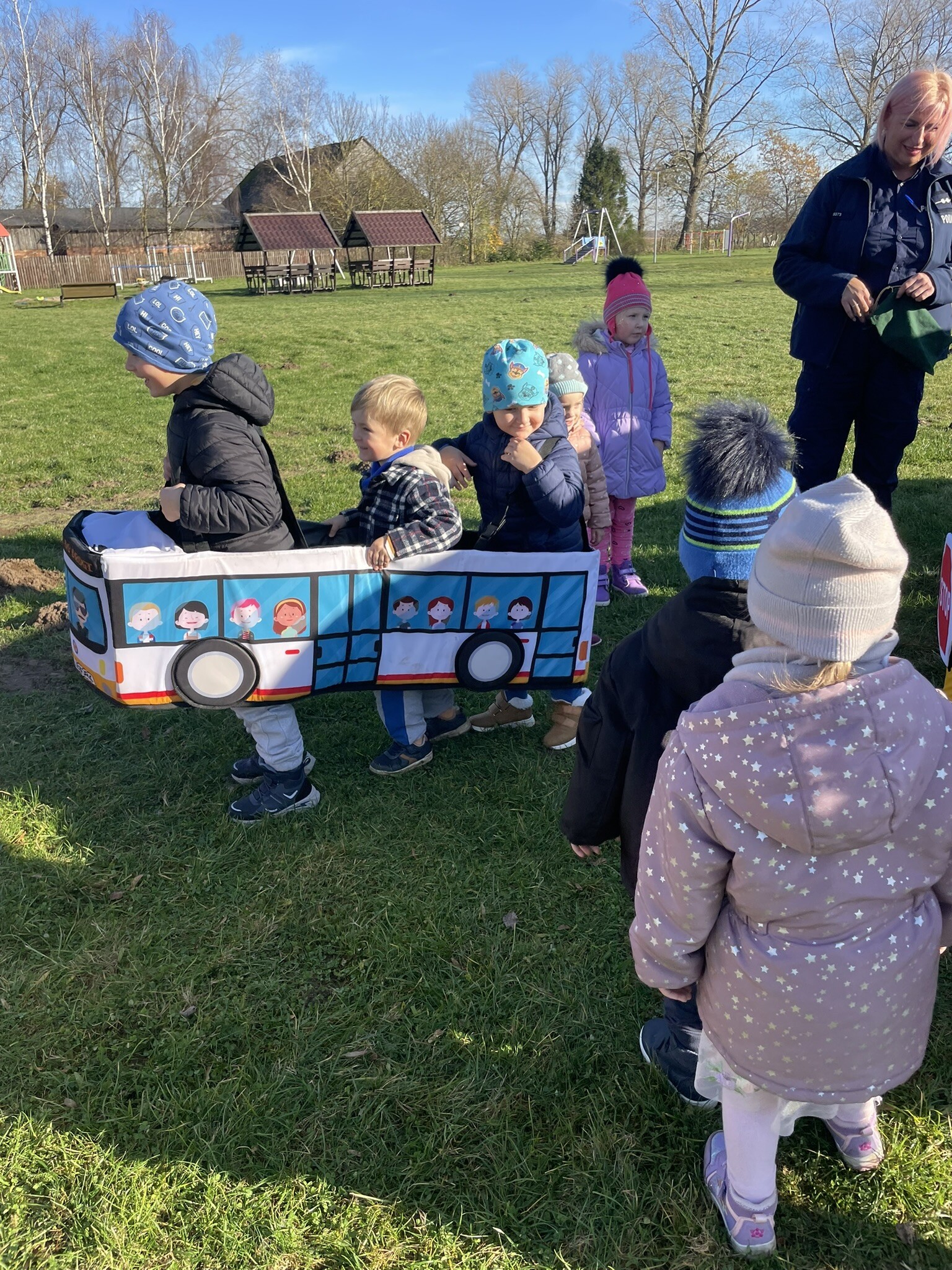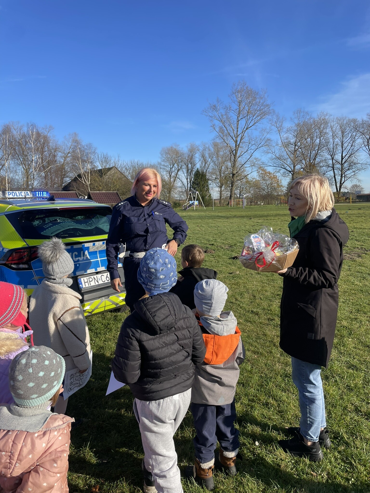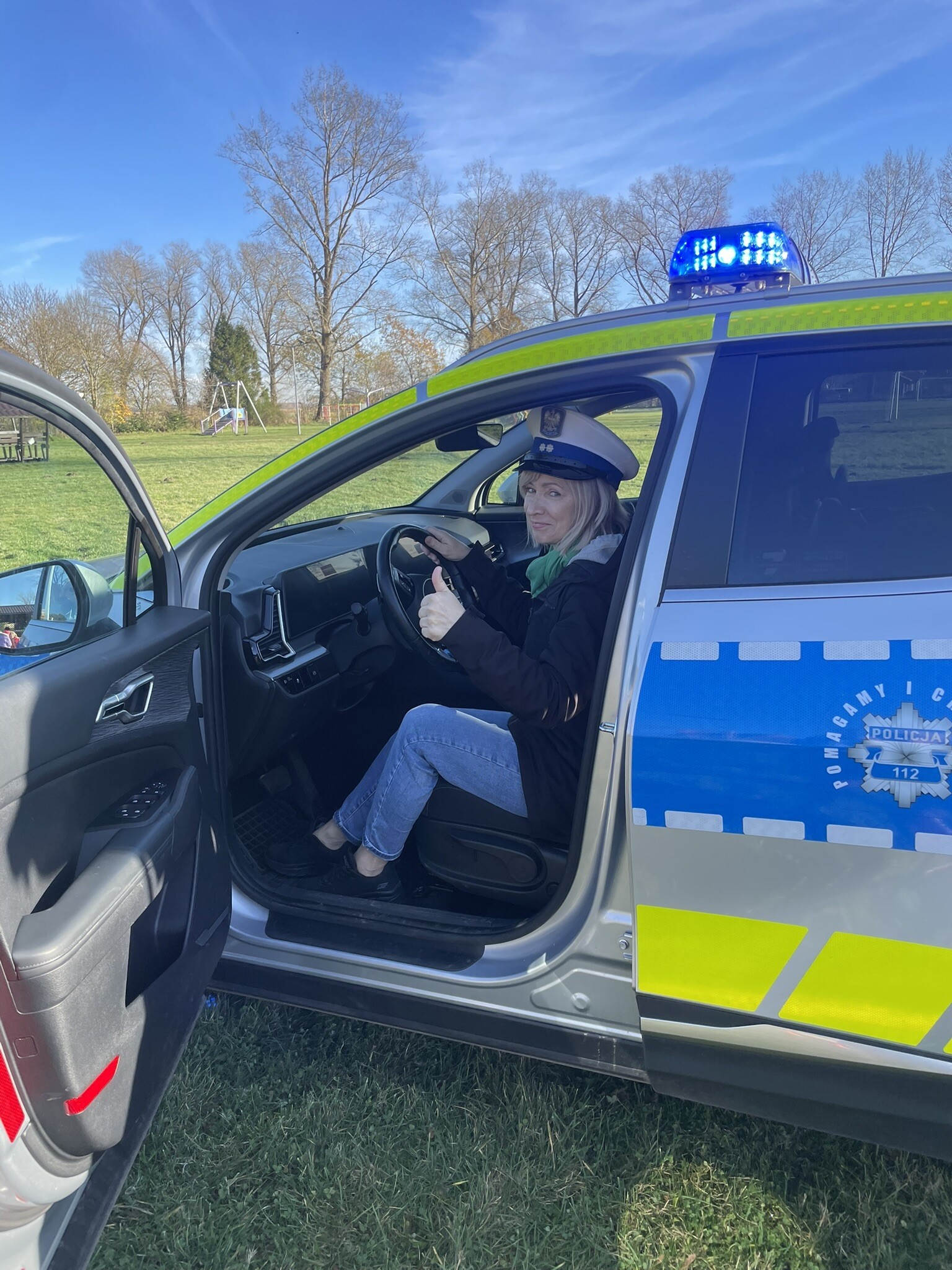 Tym razem, dzięki wspaniałej pogodzie, dzieci mogły spotkać się z naszym gościem na naszym terenie rekreacyjnym. Przedszkolaki z uwagą wysłuchały przypomnień o bezpiecznym przechodzeniu przez jezdnię, prawidłowym wyposażeniu podczas jazdy rowerem, czy na hulajnodze. Nauczyciel miał okazję założyć i sprawdzić jak działają alkogogle - specjalne okulary, które uświadamiają użytkownikom, jak alkohol wpływa na ocenę odległości, koordynację ruchową oraz zniekształcenie obrazu. Spotkanie przybliżyło dzieciom pracę policjanta, poznały akcesoria, których używa, a przede wszystkim dzieci odczuły, że ,,Policjant to przyjaciel dzieci".