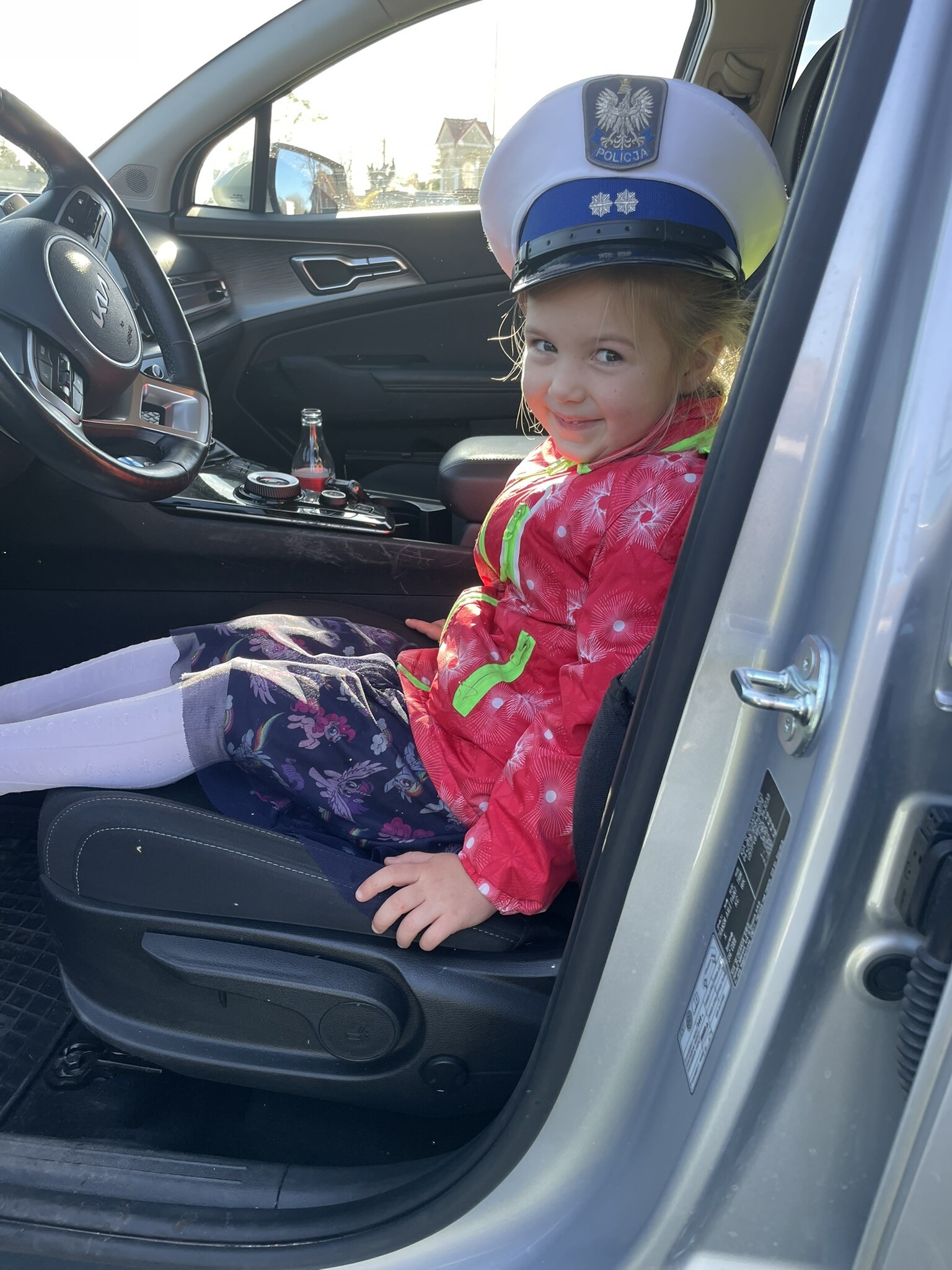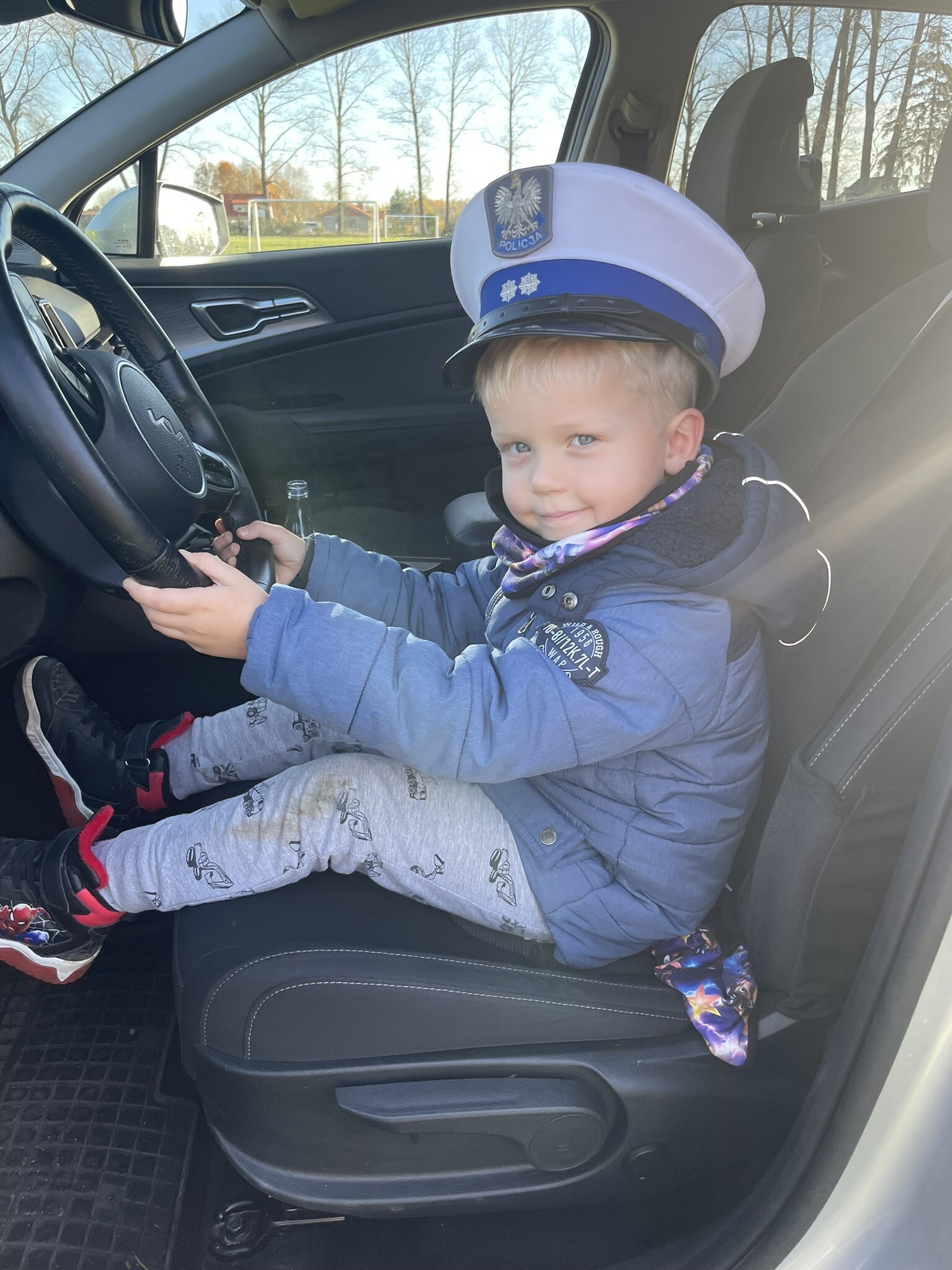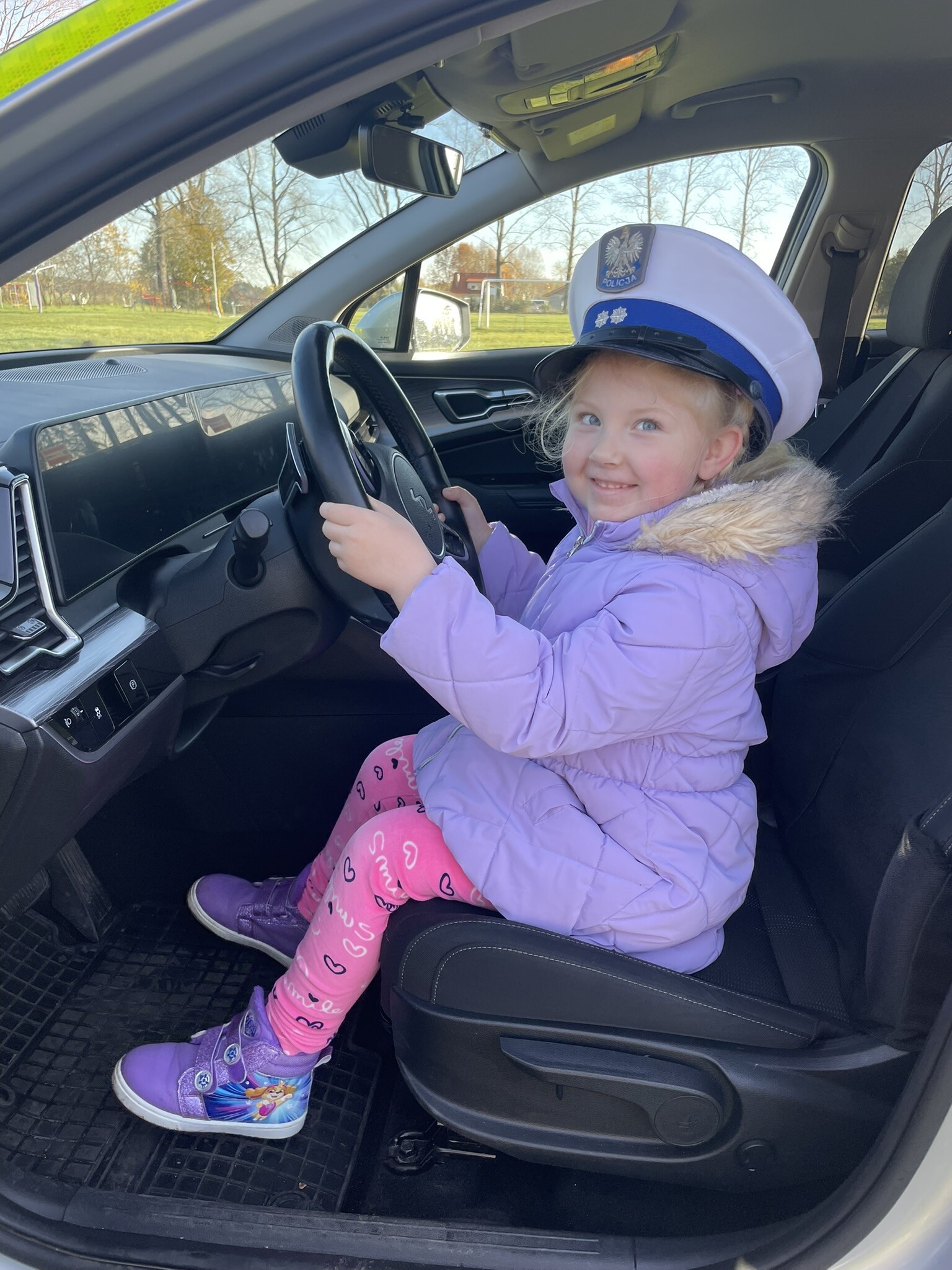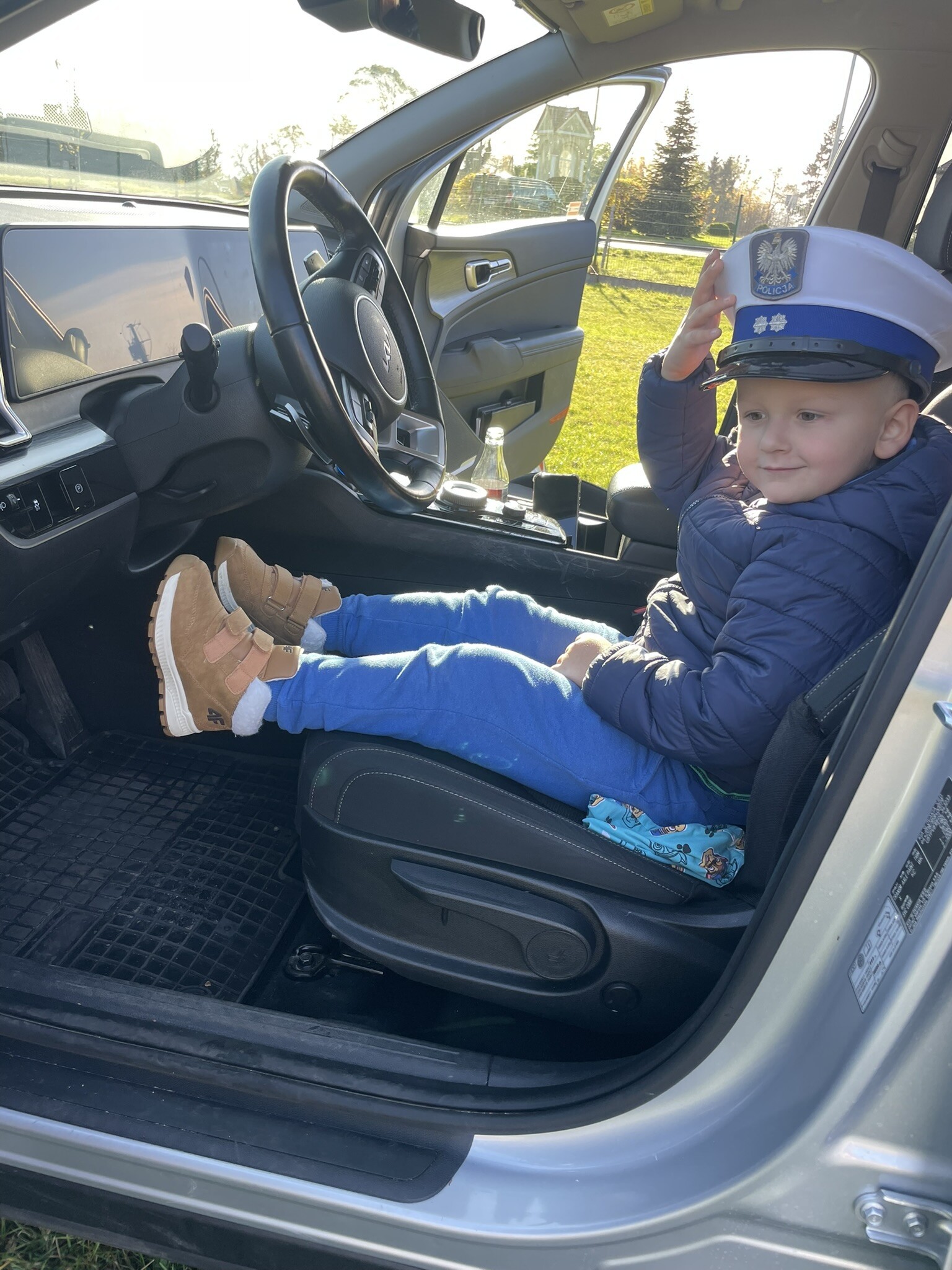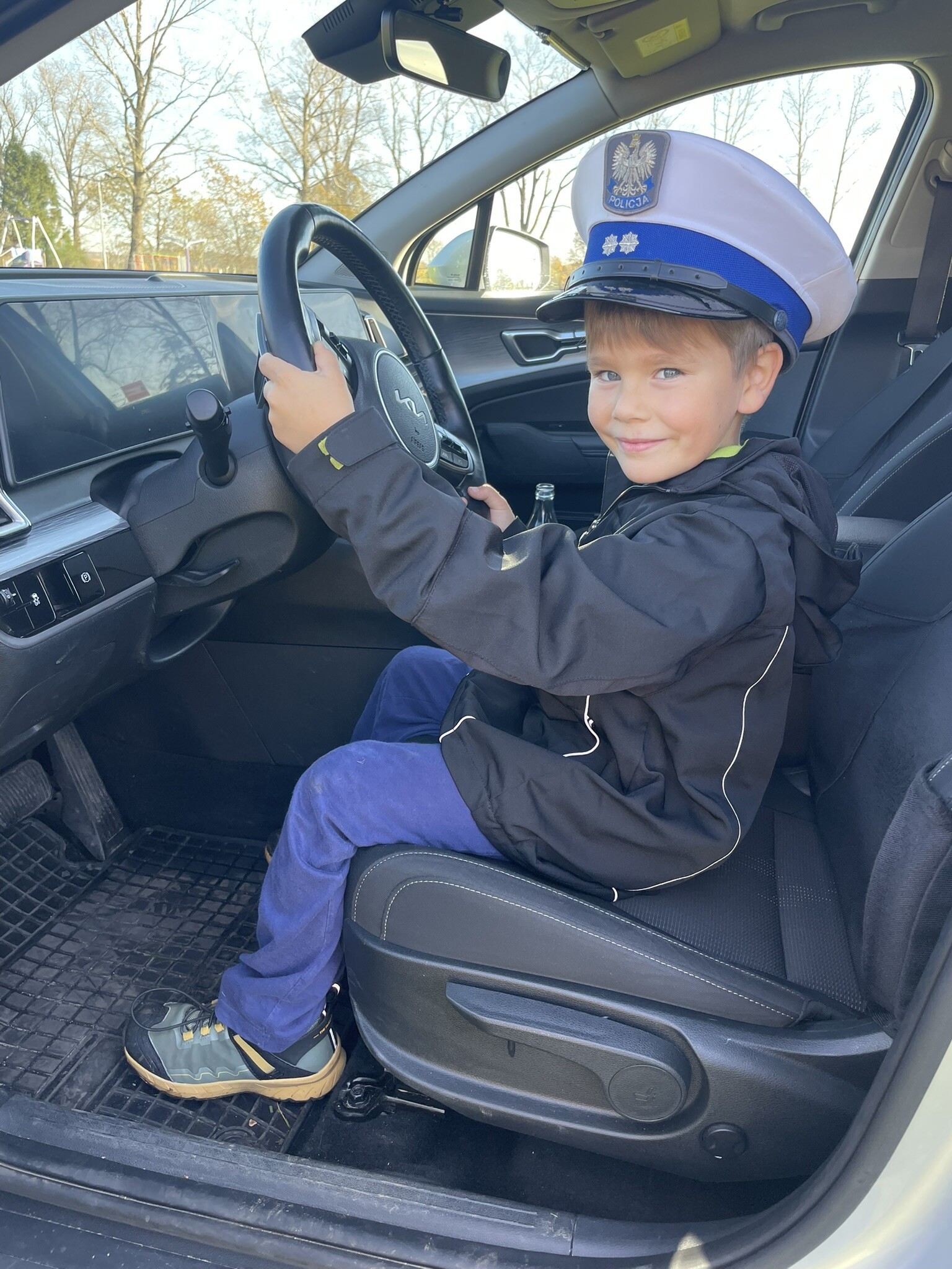 Tym razem, dzięki wspaniałej pogodzie, dzieci mogły spotkać się z naszym gościem na naszym terenie rekreacyjnym. Przedszkolaki z uwagą wysłuchały przypomnień o bezpiecznym przechodzeniu przez jezdnię, prawidłowym wyposażeniu podczas jazdy rowerem, czy na hulajnodze. Nauczyciel miał okazję założyć i sprawdzić jak działają alkogogle - specjalne okulary, które uświadamiają użytkownikom, jak alkohol wpływa na ocenę odległości, koordynację ruchową oraz zniekształcenie obrazu. Spotkanie przybliżyło dzieciom pracę policjanta, poznały akcesoria, których używa, a przede wszystkim dzieci odczuły, że ,,Policjant to przyjaciel dzieci".