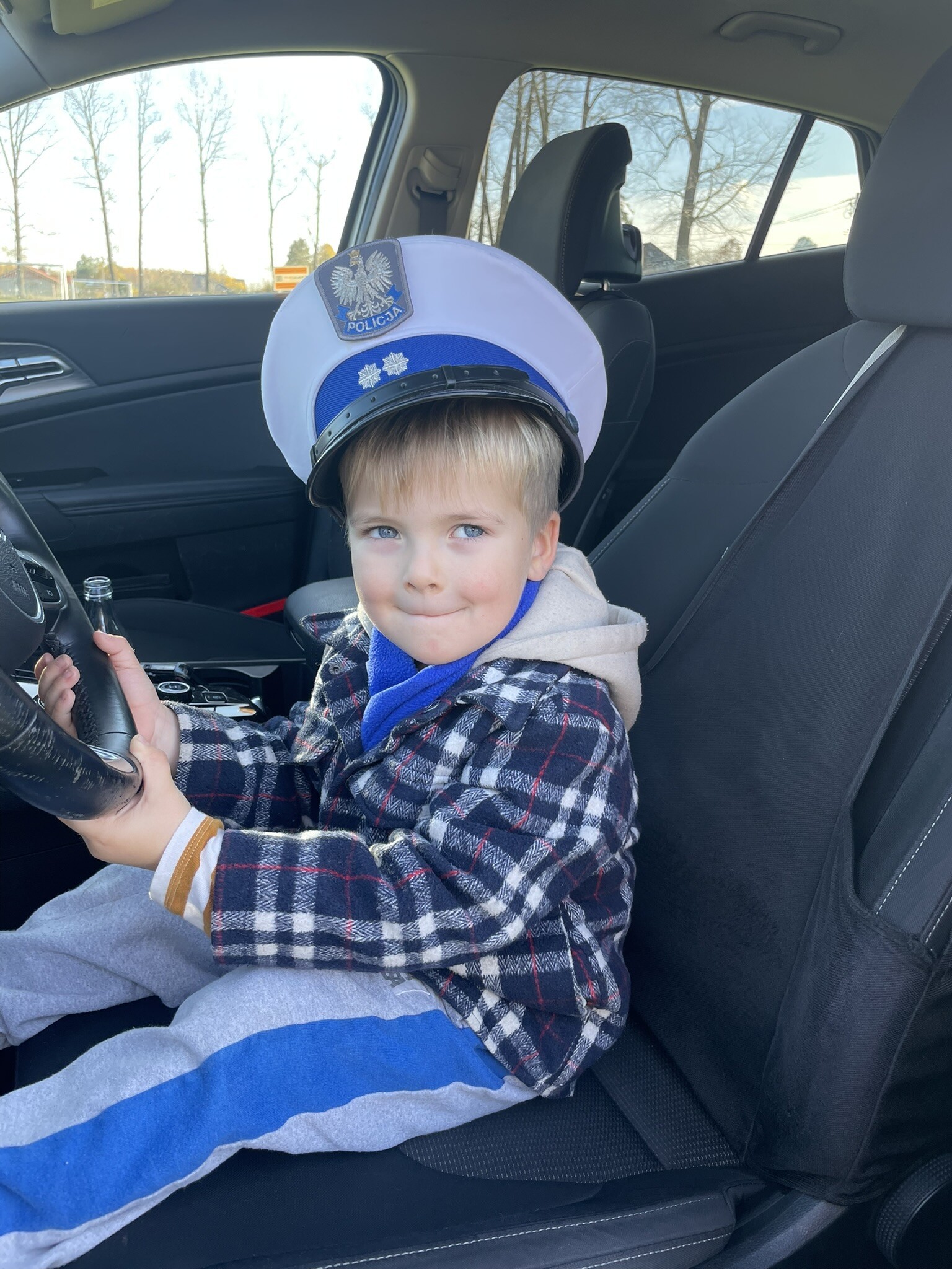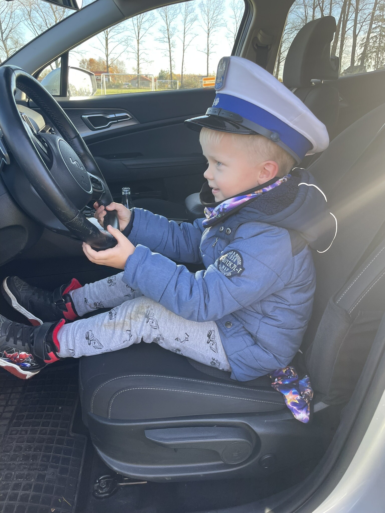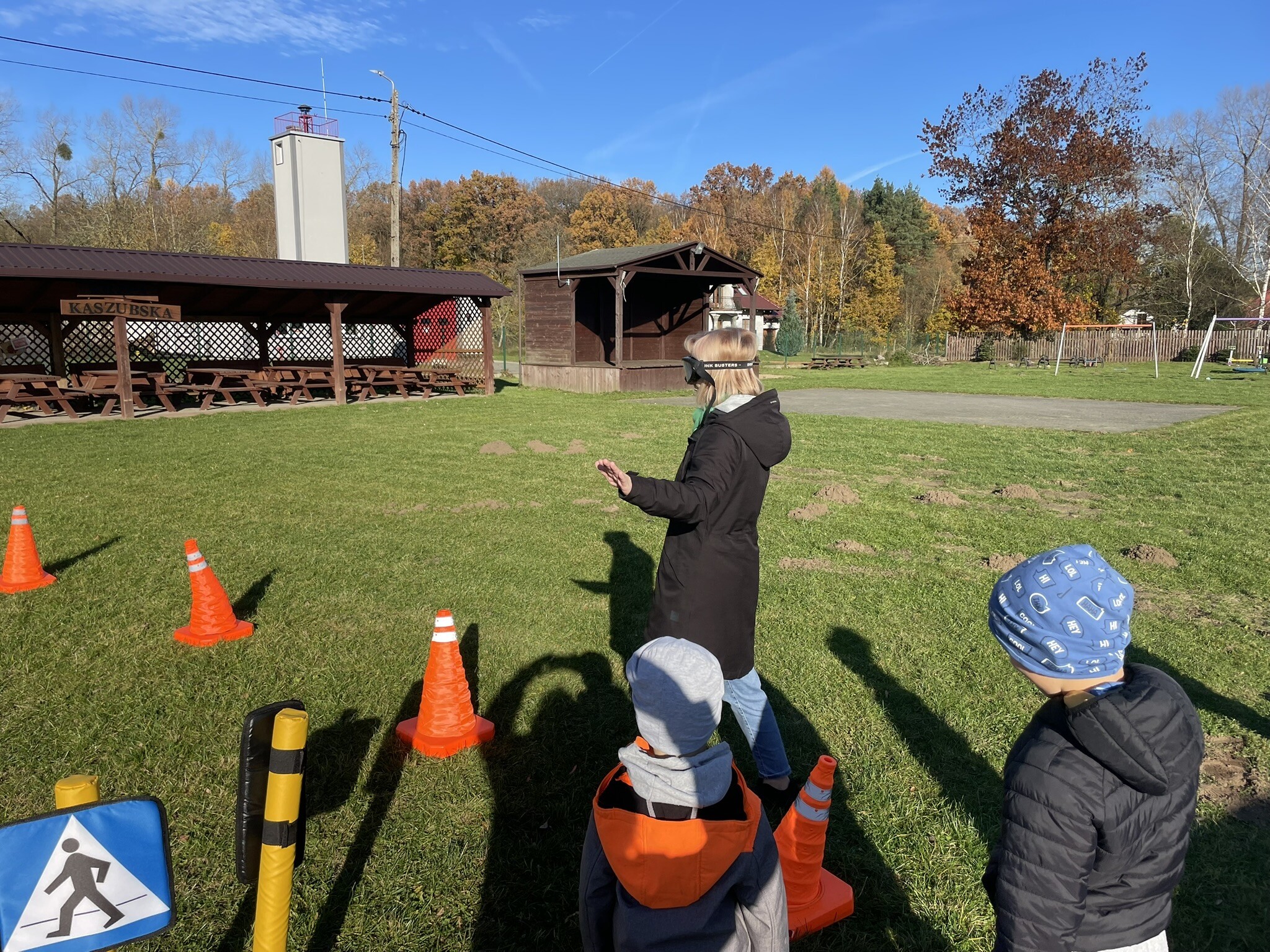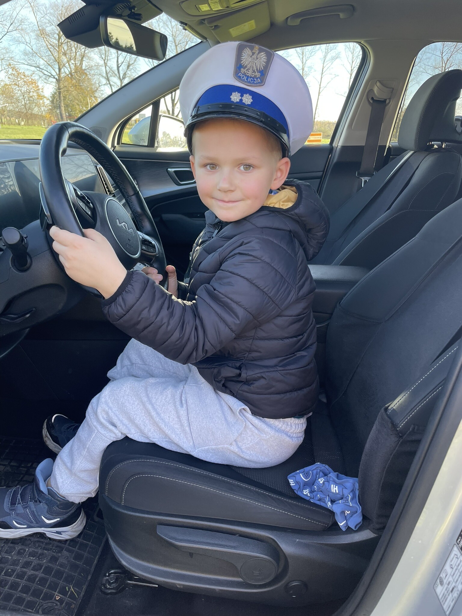 Tym razem, dzięki wspaniałej pogodzie, dzieci mogły spotkać się z naszym gościem na naszym terenie rekreacyjnym. Przedszkolaki z uwagą wysłuchały przypomnień o bezpiecznym przechodzeniu przez jezdnię, prawidłowym wyposażeniu podczas jazdy rowerem, czy na hulajnodze. Nauczyciel miał okazję założyć i sprawdzić jak działają alkogogle - specjalne okulary, które uświadamiają użytkownikom, jak alkohol wpływa na ocenę odległości, koordynację ruchową oraz zniekształcenie obrazu. Spotkanie przybliżyło dzieciom pracę policjanta, poznały akcesoria, których używa, a przede wszystkim dzieci odczuły, że ,,Policjant to przyjaciel dzieci".
