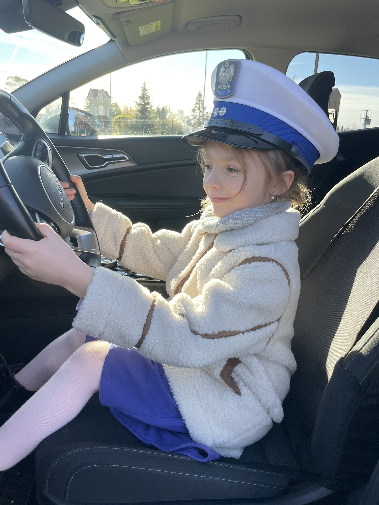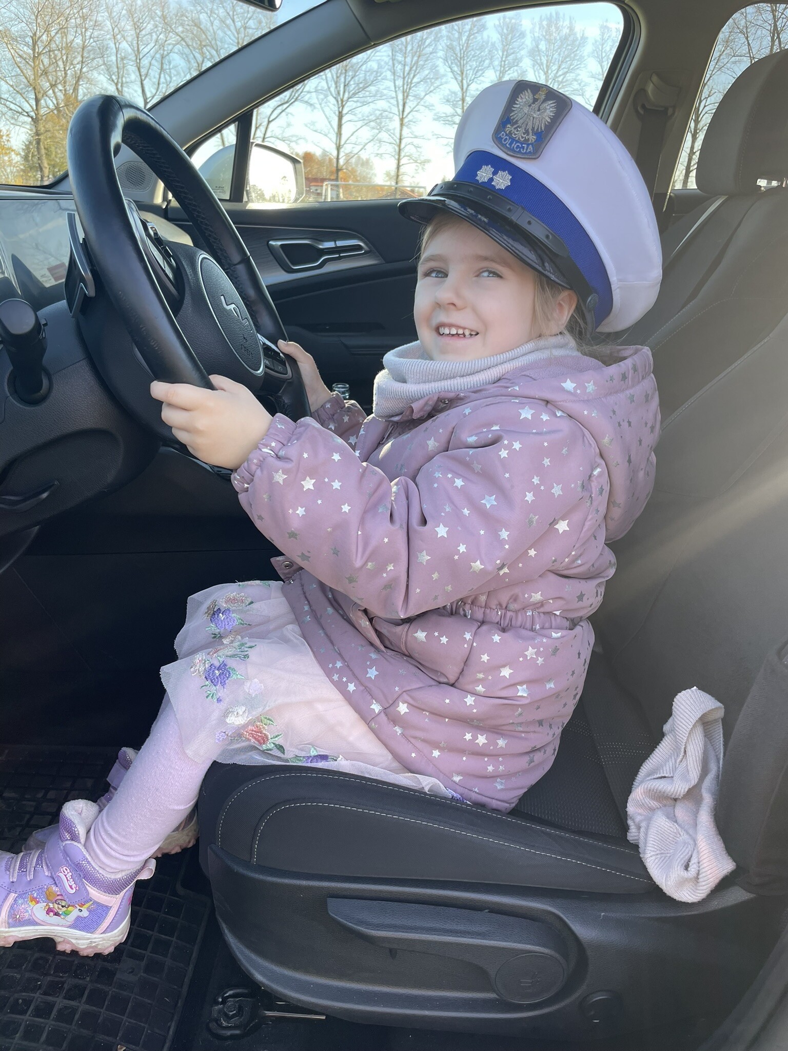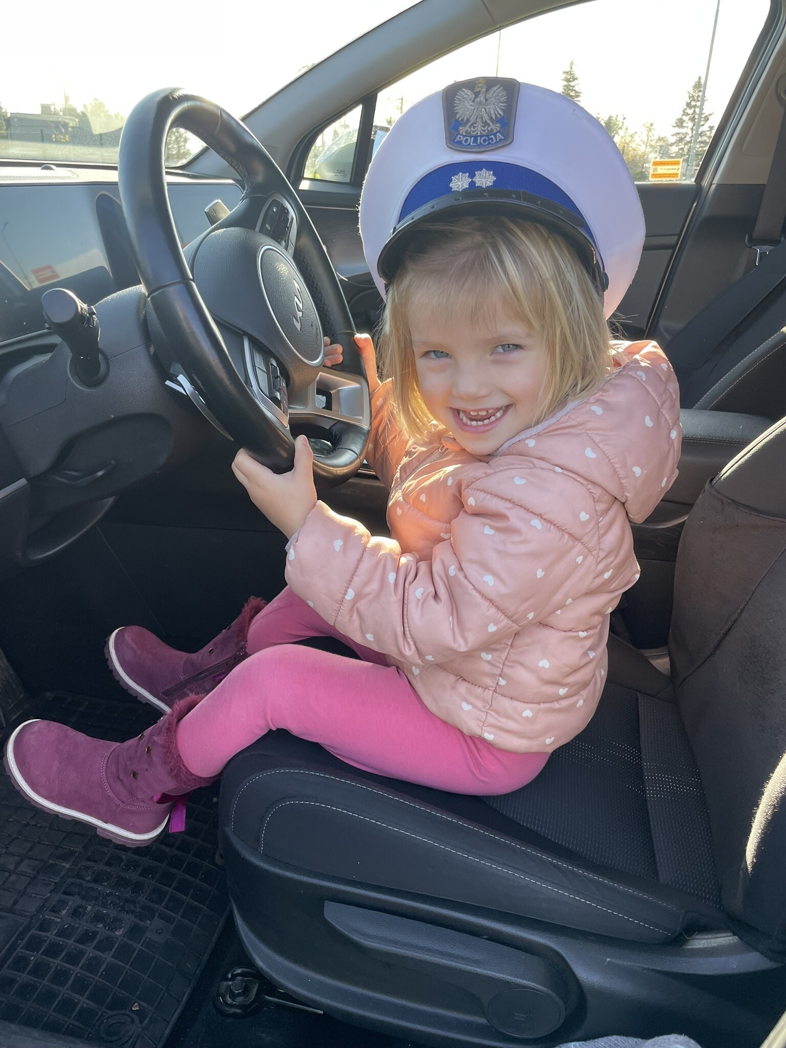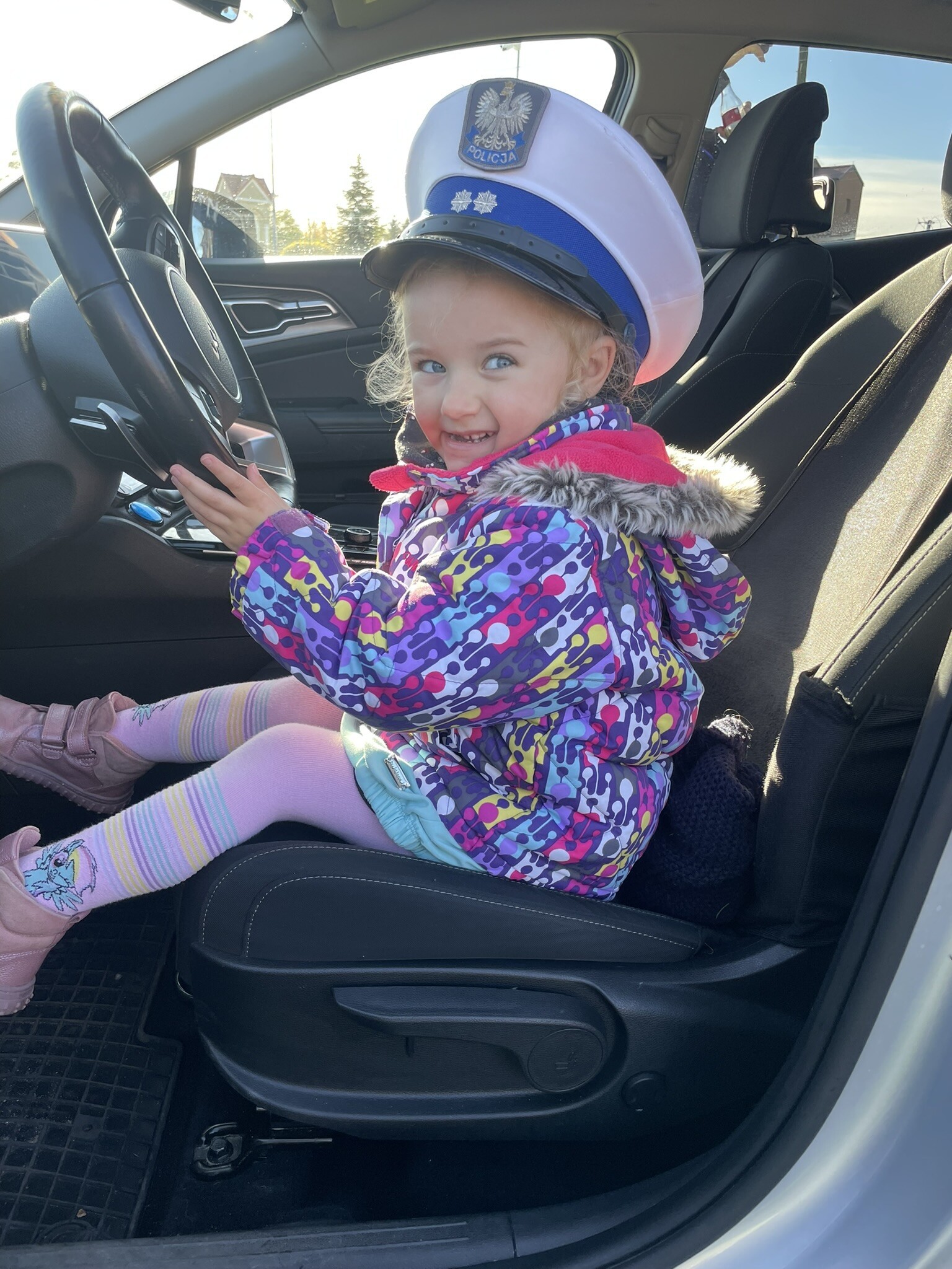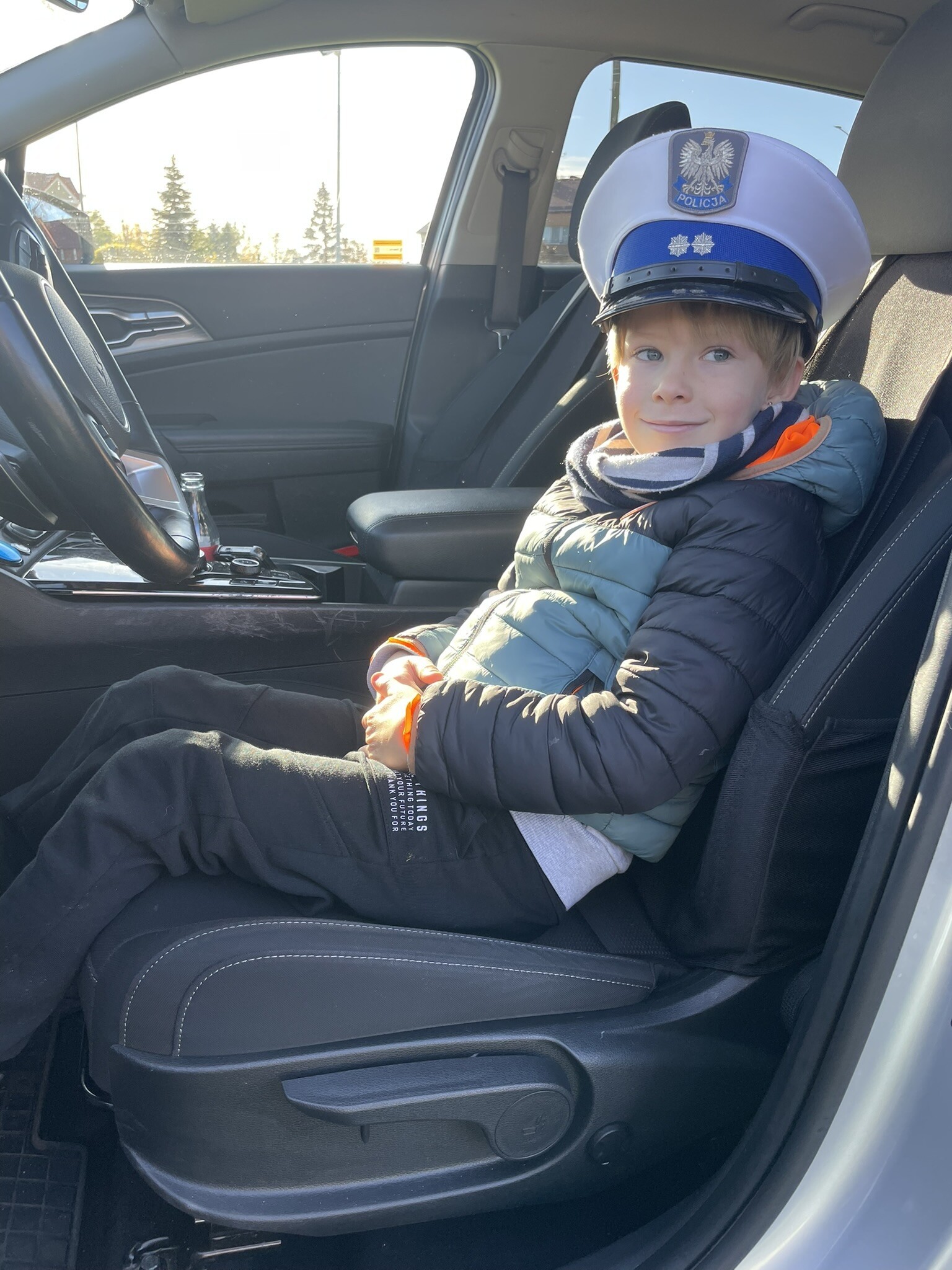 Tym razem, dzięki wspaniałej pogodzie, dzieci mogły spotkać się z naszym gościem na naszym terenie rekreacyjnym. Przedszkolaki z uwagą wysłuchały przypomnień o bezpiecznym przechodzeniu przez jezdnię, prawidłowym wyposażeniu podczas jazdy rowerem, czy na hulajnodze. Nauczyciel miał okazję założyć i sprawdzić jak działają alkogogle - specjalne okulary, które uświadamiają użytkownikom, jak alkohol wpływa na ocenę odległości, koordynację ruchową oraz zniekształcenie obrazu. Spotkanie przybliżyło dzieciom pracę policjanta, poznały akcesoria, których używa, a przede wszystkim dzieci odczuły, że ,,Policjant to przyjaciel dzieci".