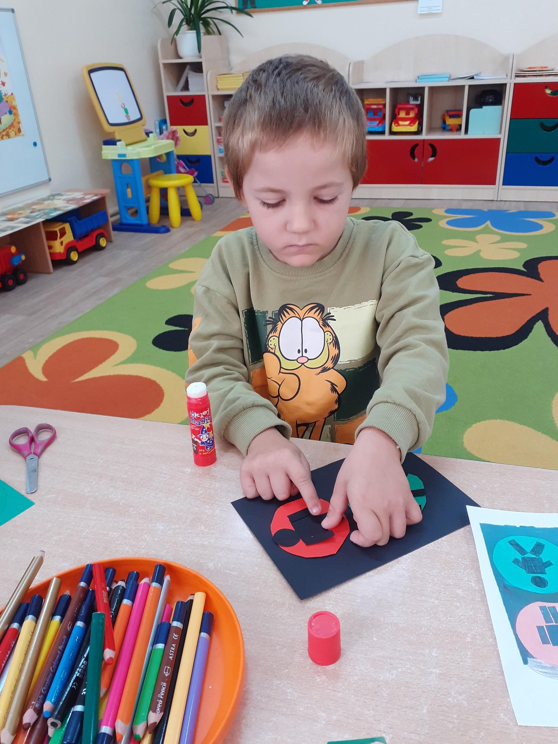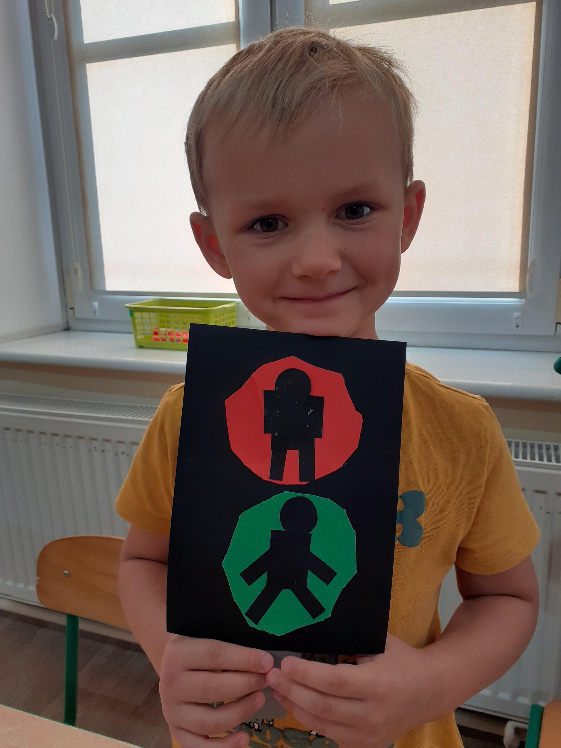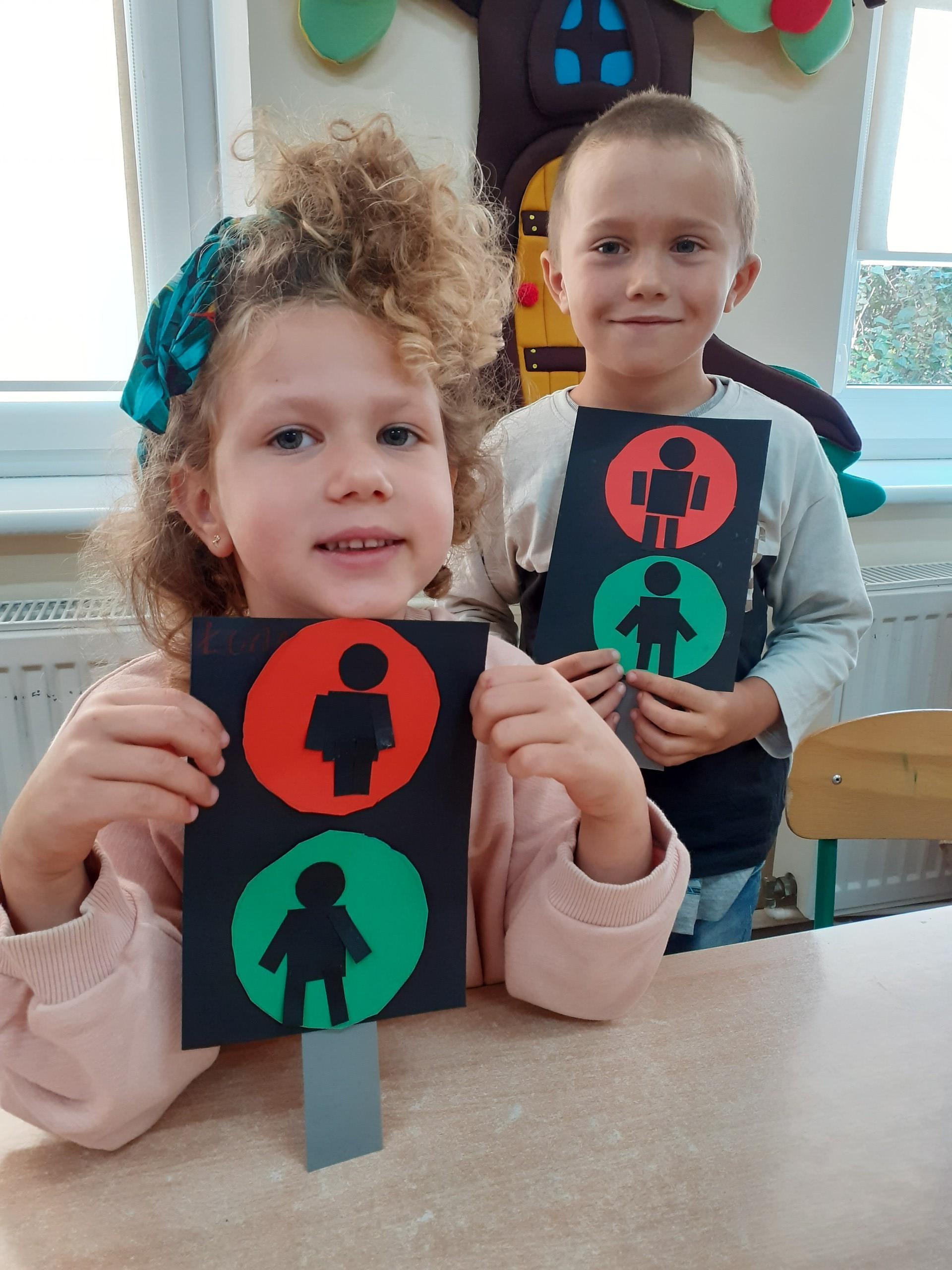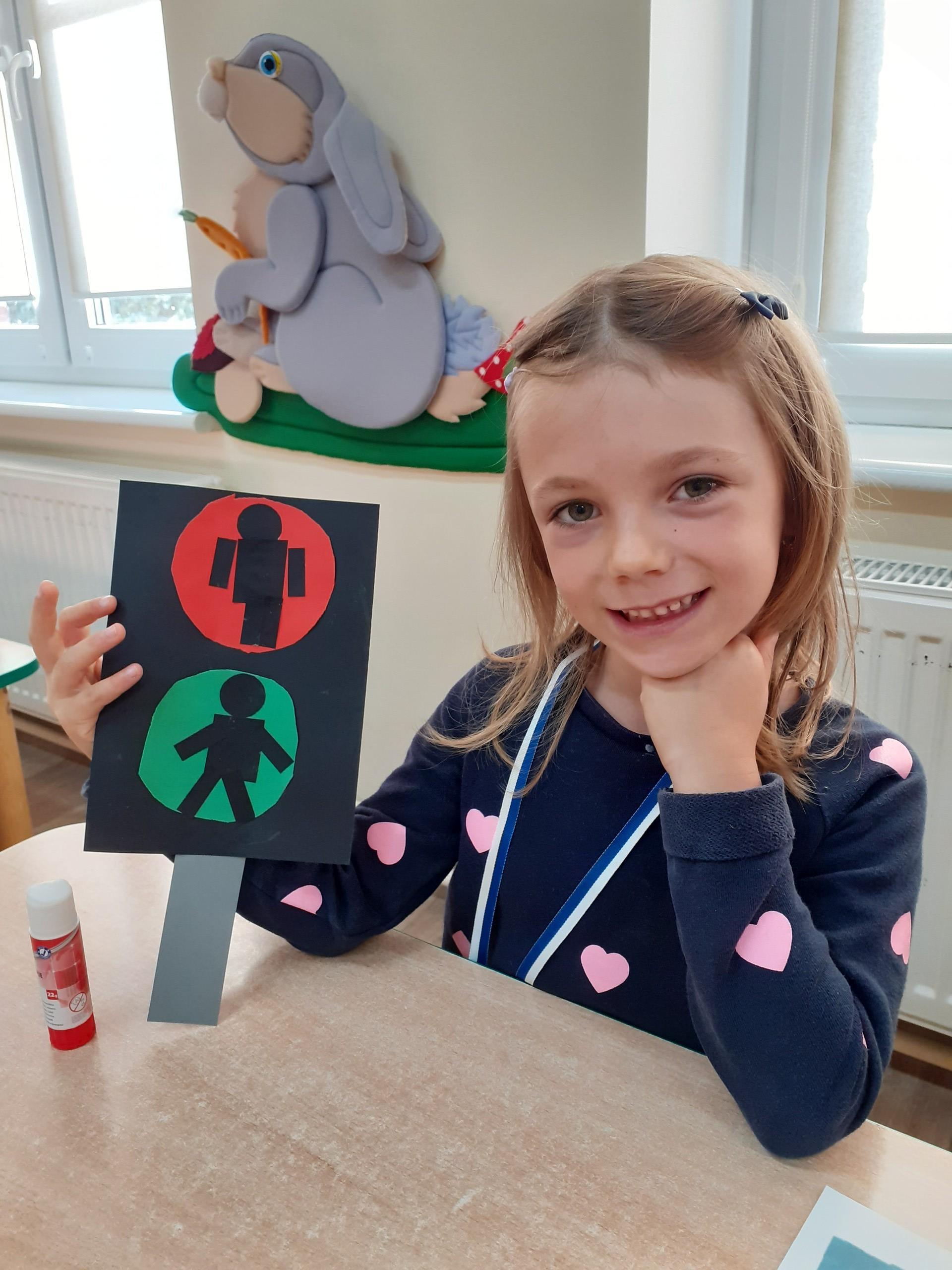 W związku z omawianą tematyką ,,Bezpieczeństwo na drodze", przedszkolaki wykonały pracę plastyczną - sygnalizator świetlny dla pieszych.