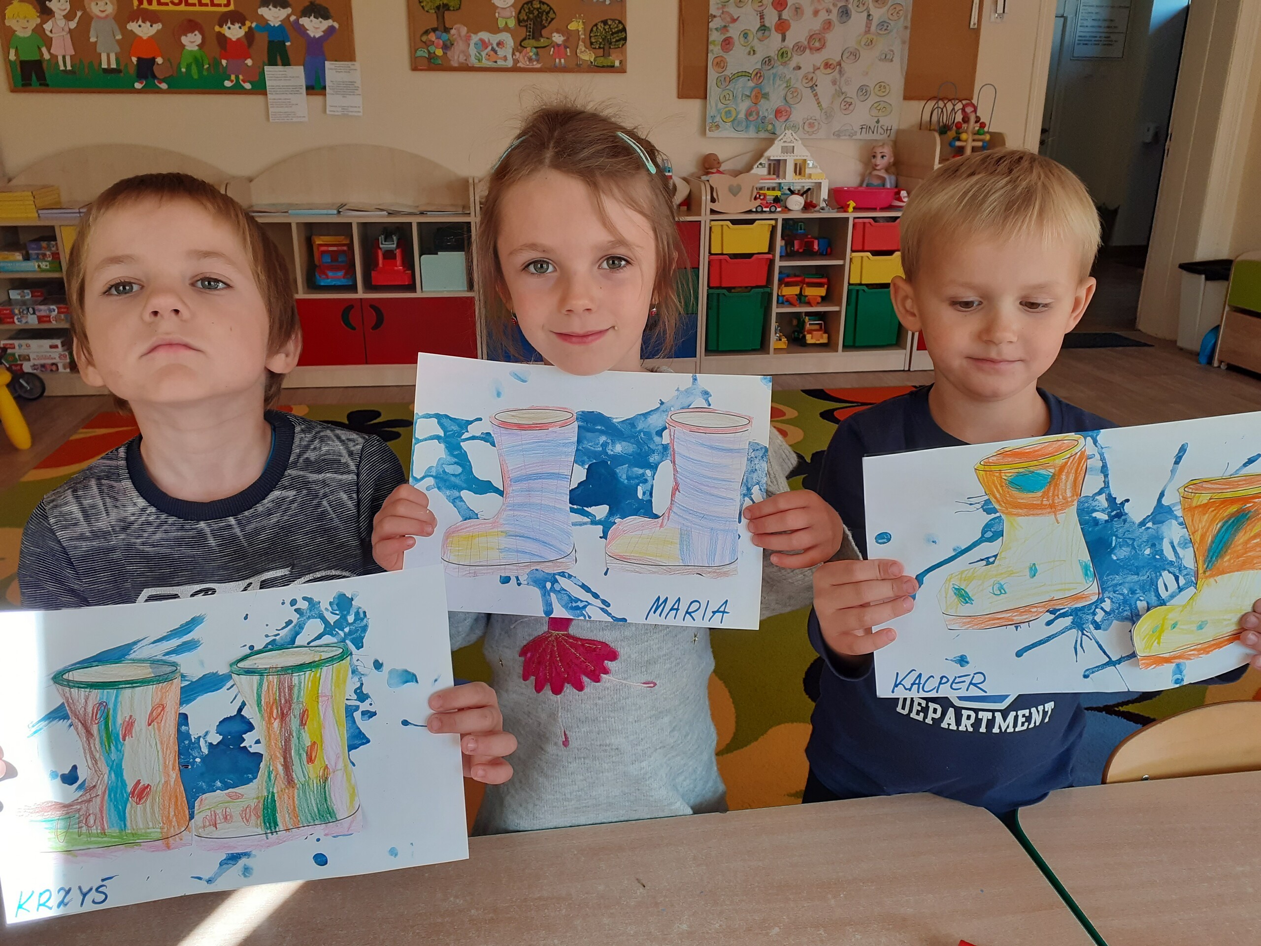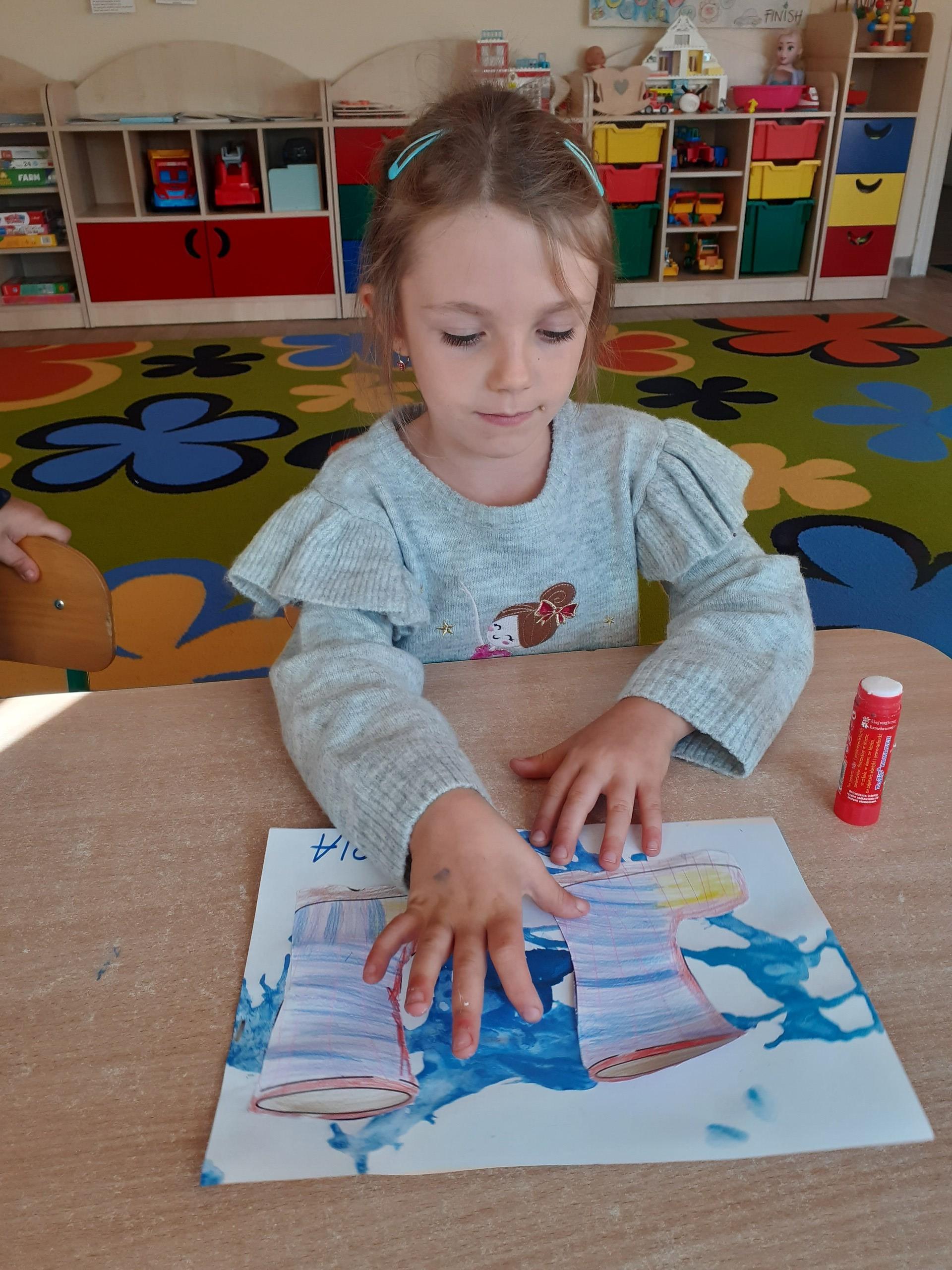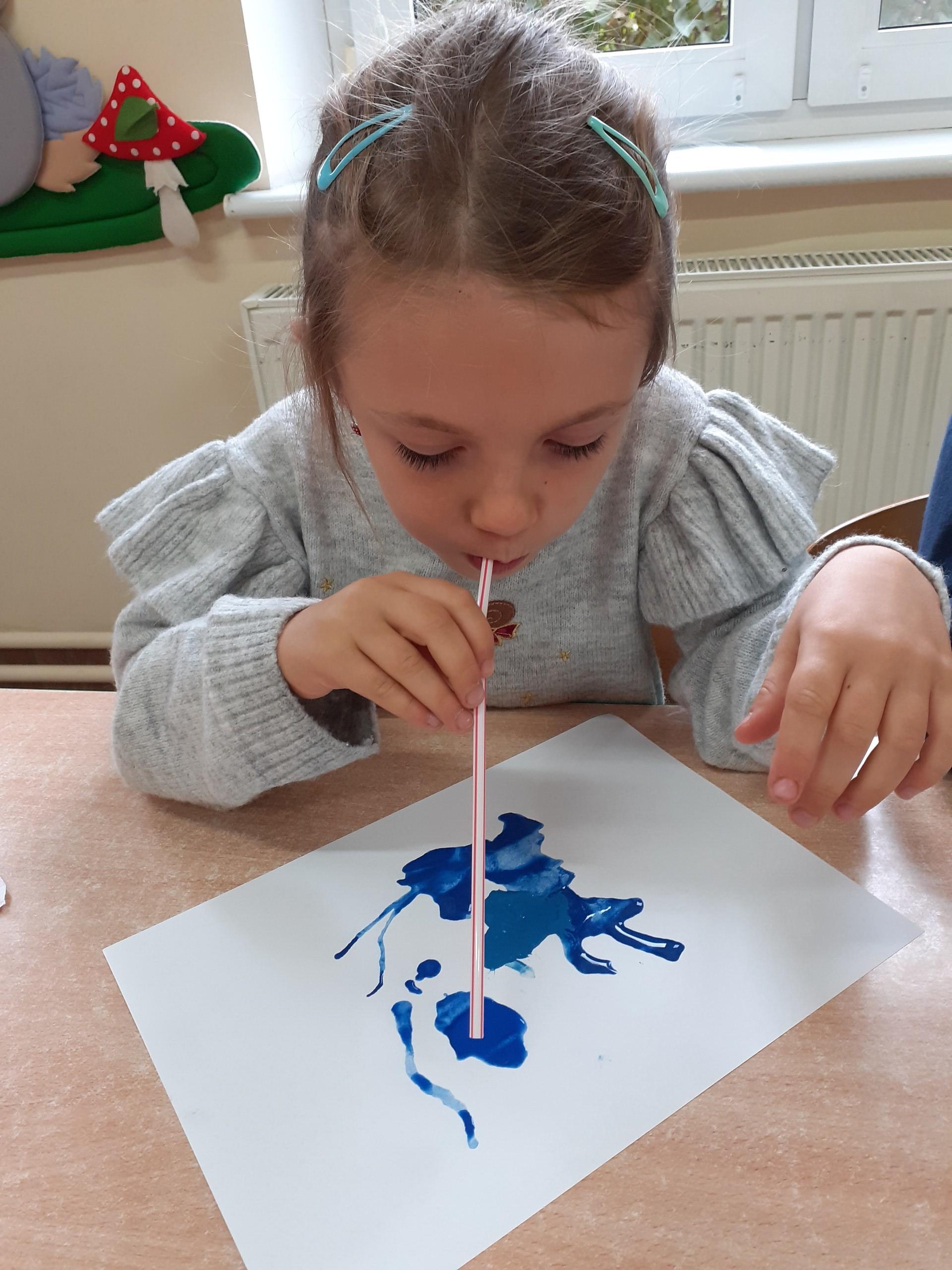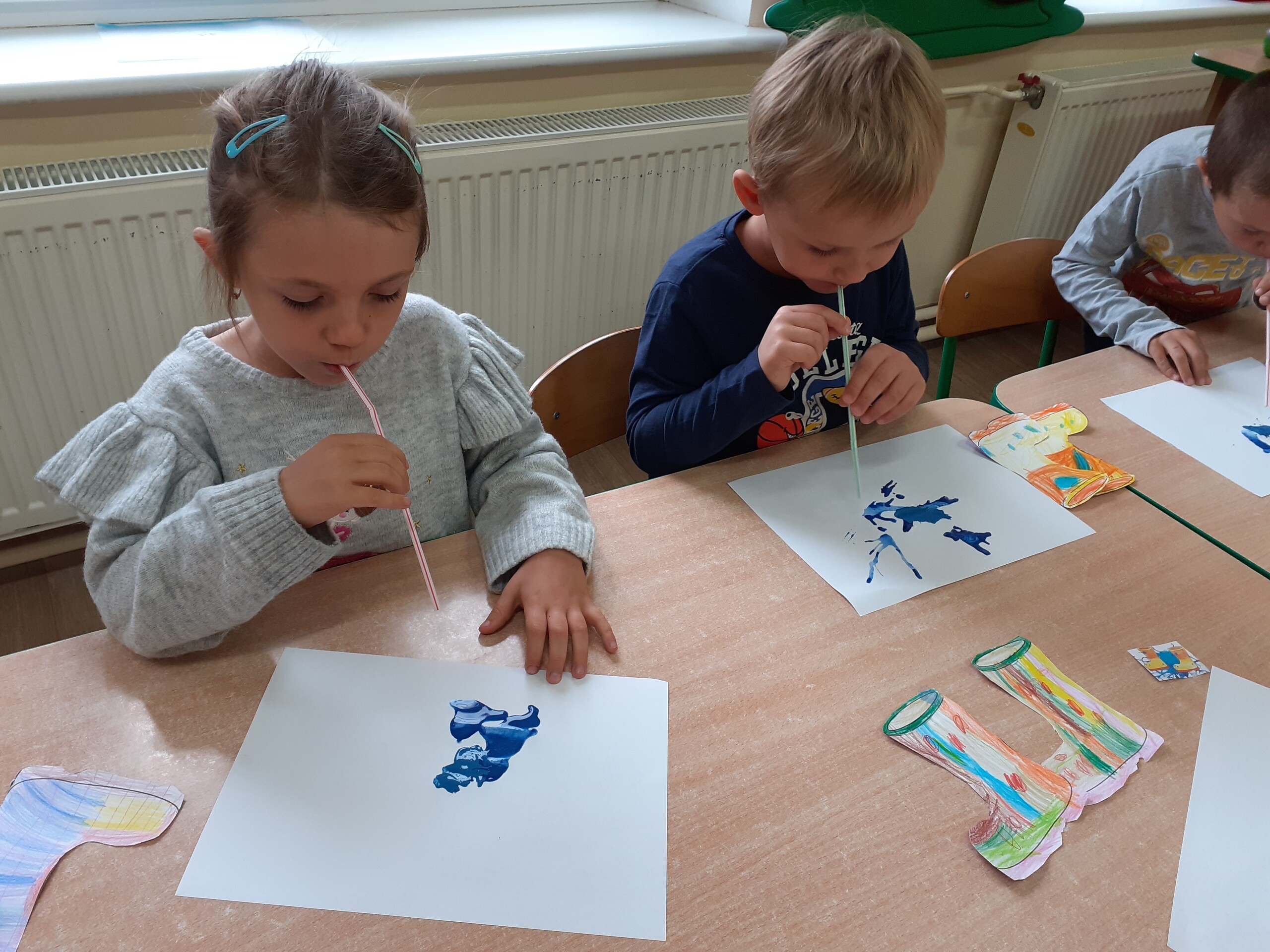 Kalosze na jesienny deszcz są już gotowe! Starszaki kolorowały obrazki kaloszy, wycinały je, a następnie naklejały na rozdmuchaną za pomocą słomki i farby - kałużę.